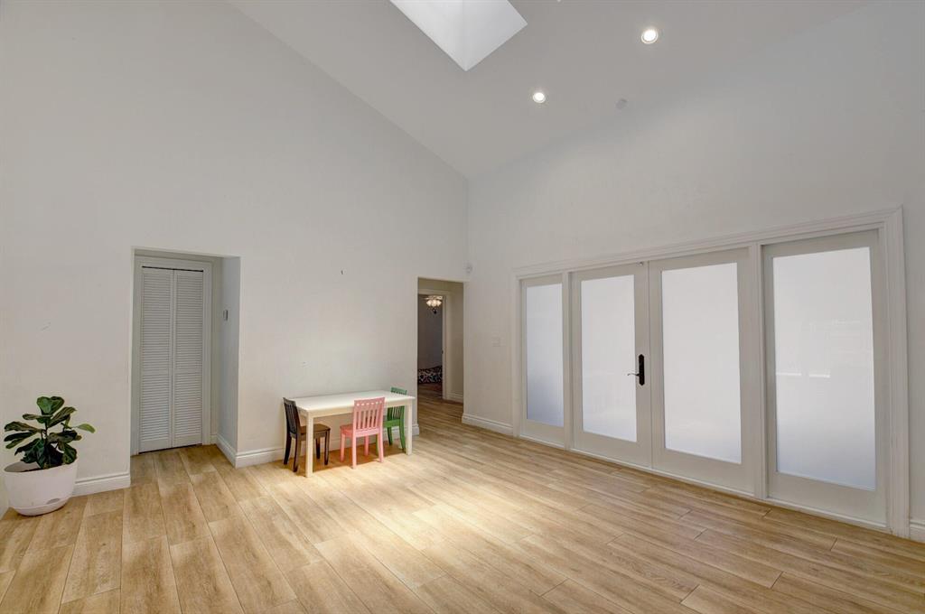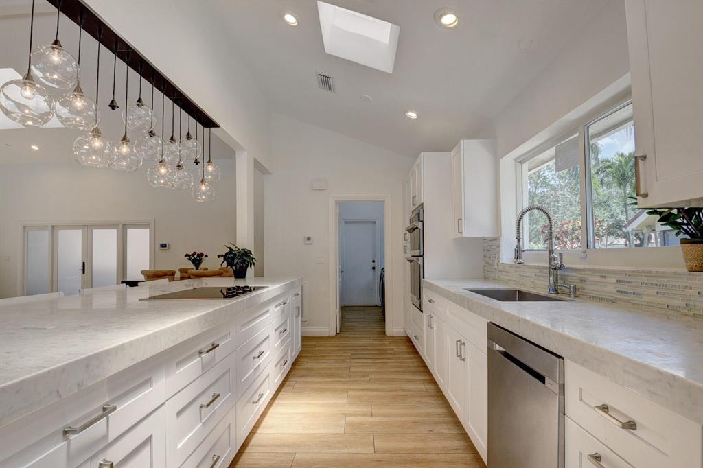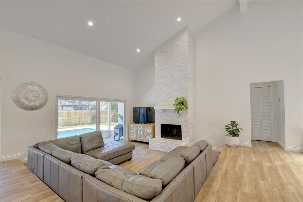 This extravagant home is located on a quiet cut-de-sac street lined with majestic oak trees in the heart of luxurious Colonnade. This home offers a soaring vaulted ceiling w/beam, wood designed tile throughout the home, a sunken family room by the floor to ceiling stone fireplace, updated ceiling fans, skylights promoting lots of natural light, an open kitchen with white shaker cabinets, newer stainless steel appliances, massive deep sink, marble countertops with a designer glass backsplash and breakfast dining over looking the pool. A large bar area for casual dining, All new impact windows and doors, all newly renovated bathrooms. The master suite offers a vaulted ceiling, large step down marble shower, extended dual sink vanity and cabana access to the poo