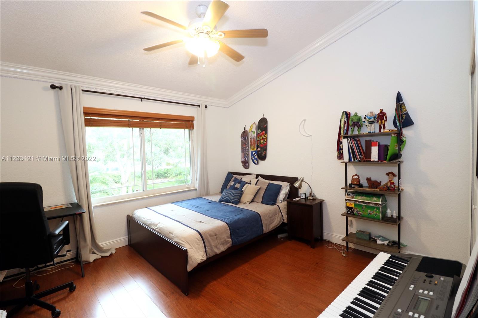 Beautiful two-story single-family home with free-form swimming pool, 4 bedrooms, 2.5 baths fenced patio with tropical landscape, in sought-after Chapel Trail community in west Pembroke Pines, close to schools. No back neighbors, Living room with vaulted ceiling, neutral color and plenty of natural light, upgraded bathrooms, upgraded kitchen with stainless steel appliances wood cabinets & Corian countertops. Tile flooring downstairs and wood upstairs. Garage partially converted into a storage area laundry room with washer/dryer connectors (washer and dryer not included) laundry tub and small office. All bedrooms upstairs. Accordion shutters upstairs and panels downstairs, crown molding, painted inside 2021, replaced roof 2006, air conditioning and pool pump 2019. Must see it to appreciate!