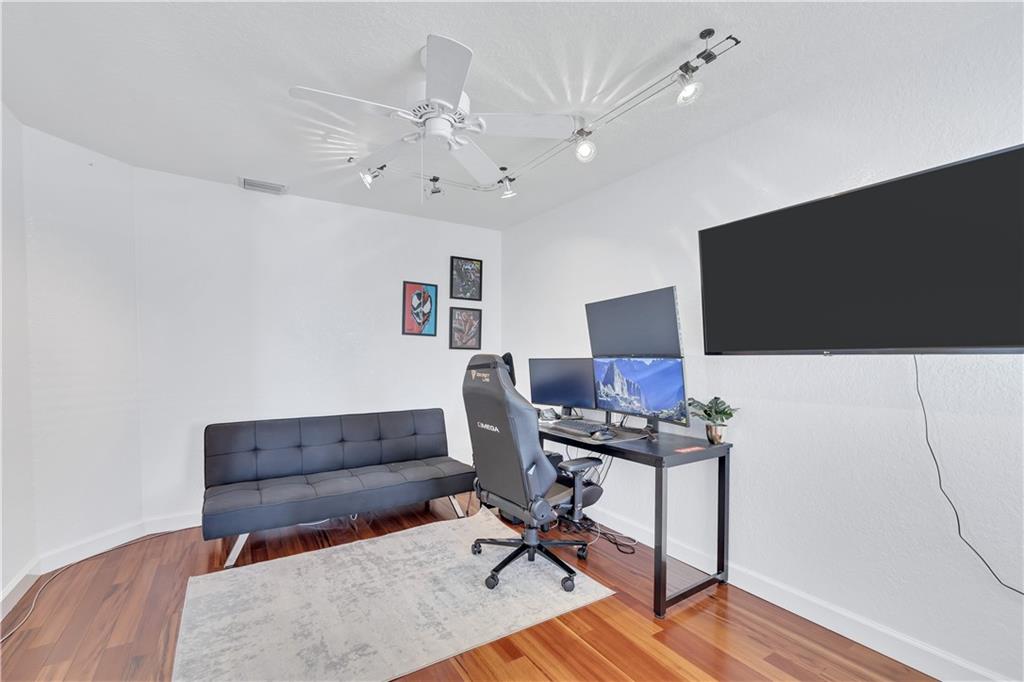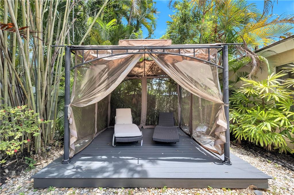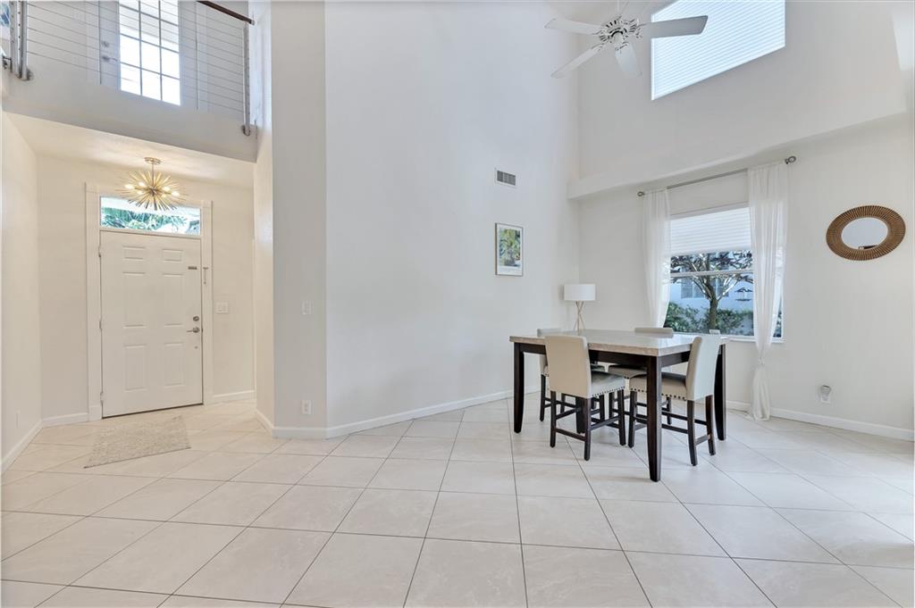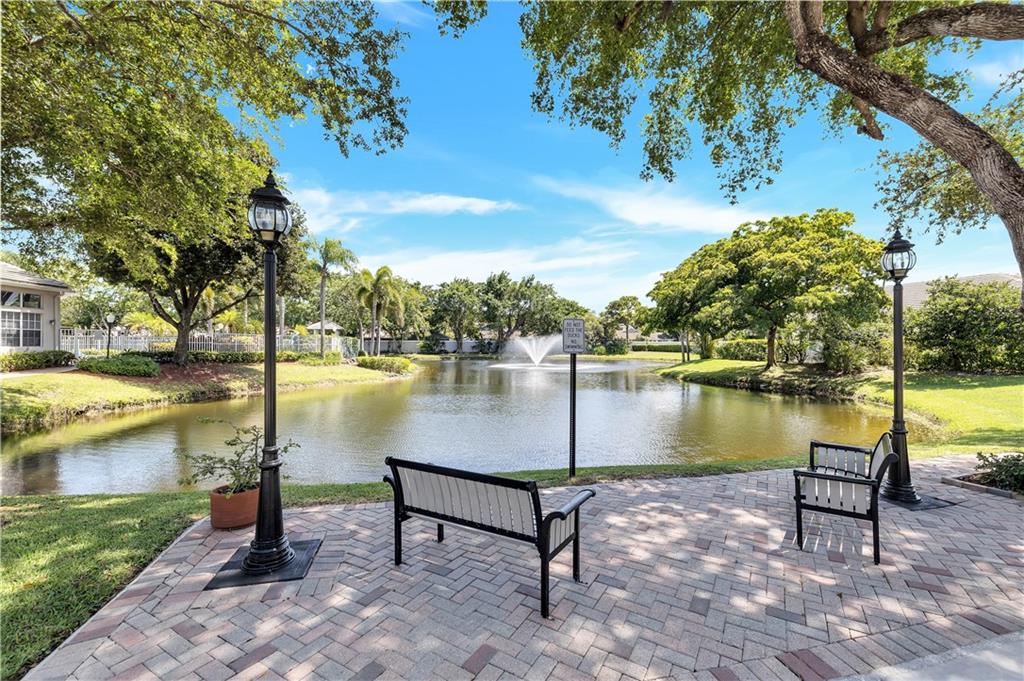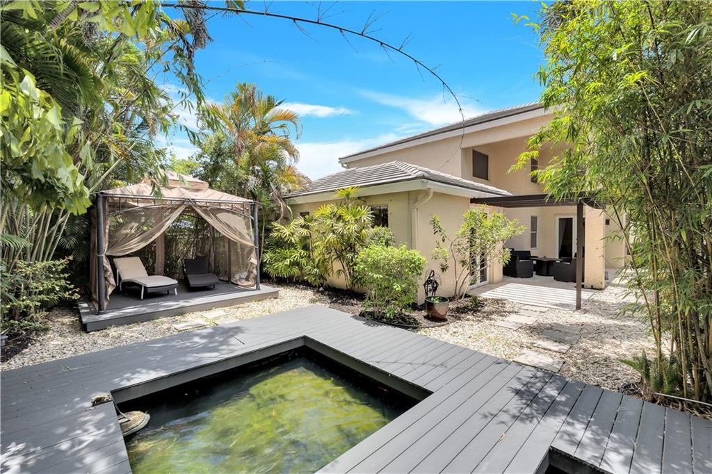 One of the best layouts I've seen in awhile. Walk into extremely high & open ceilings w/modern touches everywhere. The unique & stylish wire stair railing carries up to the 2nd floor walkway that leads you to the 2 secondary bedrms, 2nd bath, & balcony. Downstairs features a breakfast nook, formal dining, living room, & the primary suite. The primary suite's French doors open to a private zen like deck w/a relaxing fountain, gazebo & Koi Pond. The community features a gate, workout room, & pool while being located in great school districts, less than 7 miles from the beach, a quick hop on the turnpike to take you anywhere and it's low on the crime index map. **IMPROVED PRICE. NEW ROOF** Welcome home & stay friendly!