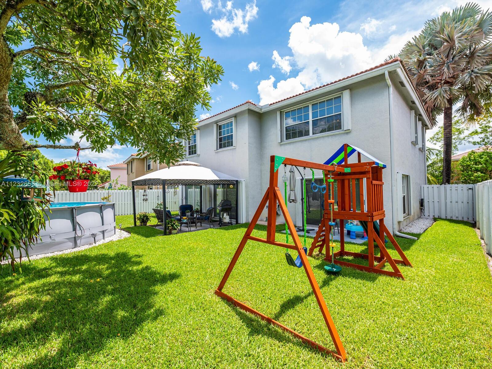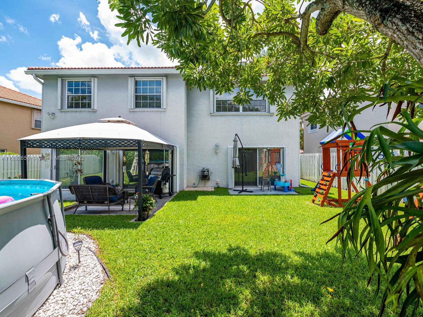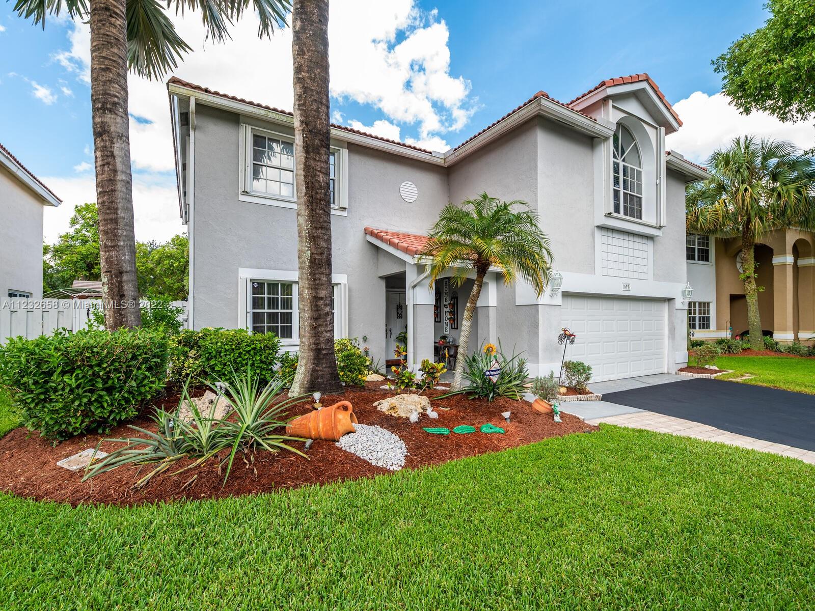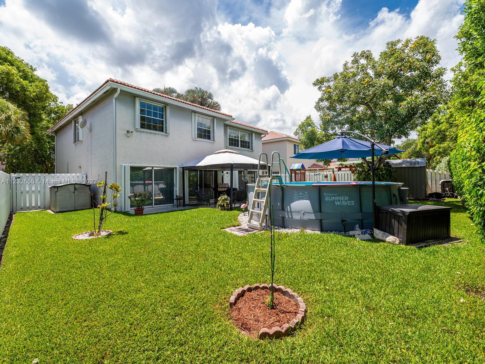 Beautiful well kept home featuring 4 bedrooms w/ 2.5 baths & 2 car garage. High end engineered wood flooring. Kitchen overlooks the family room. Newer S/S appliances. Gas water heater (2019) and dryer. all bedrooms on 2nd level featuring an oversized master suite with a double door entry & 2 walk in closets. Loft area on 2nd floor Attic flooring for extra storage. Master bathroom has separate shower plus a roman tub & double sinks. Alarm system with 2 motion detectors. The exterior has an above ground pool and the yard is totally fenced. Accordion shutters, tinted windows. Sprinkler system w/ separate water meter. 2 sheds. This home is walking distance to A+ schools plus a wonderful park with a splash pad! 5 minutes to Sawgrass Mills Mall. Centrally located for easy access to tri-county