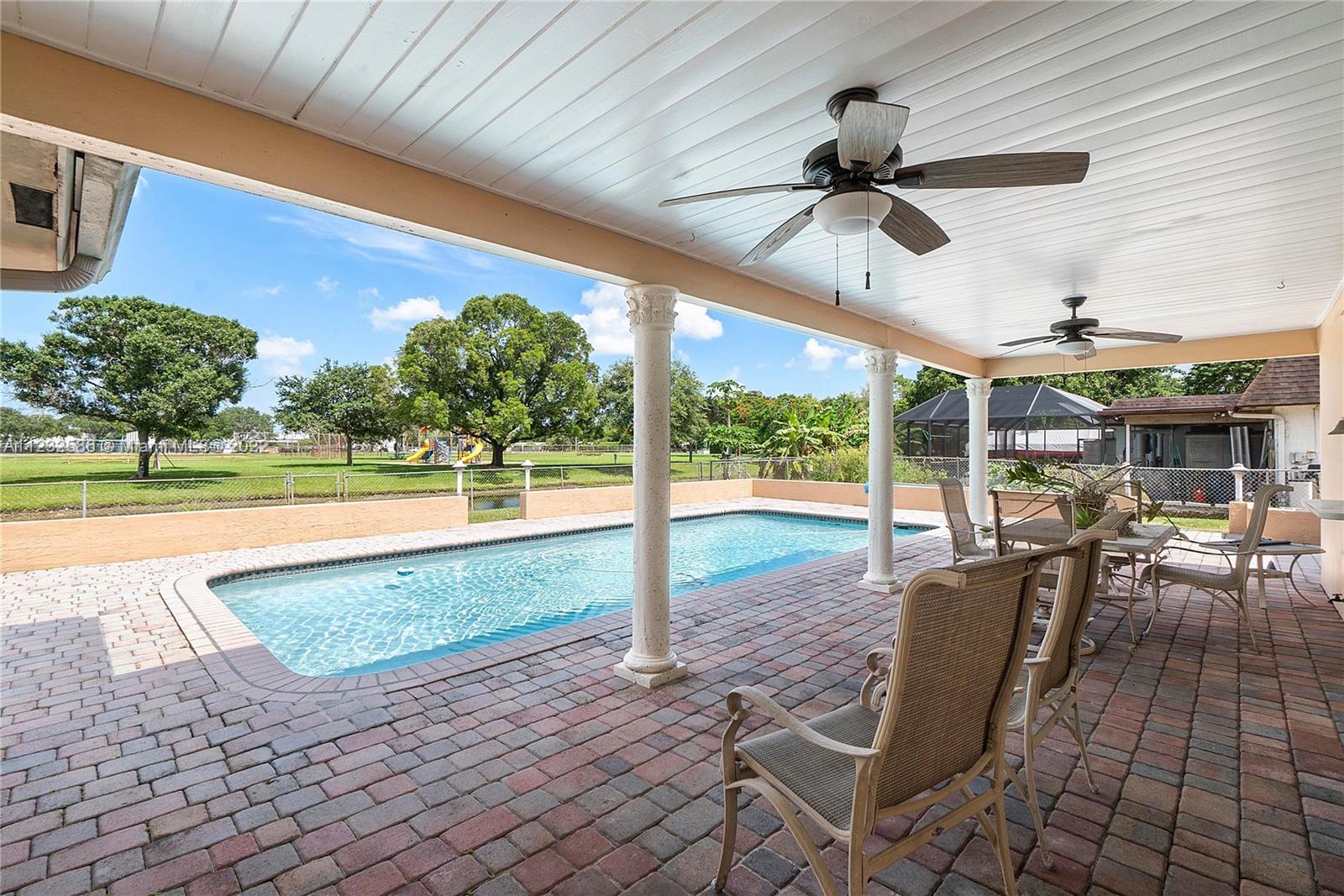 Welcome home to this wonderful Mirror Lake 4 bdrm. 2 bath home. Eat in kitchen has wood cabinets and Corian countertops. Floors are wood and tile, two bedrooms. have carpeting. Large formal dining room and all of this overlooks a large covered entertaining area and pool. The best part is there is a canal and park behind this home, so it is very private and gives you a lovely view. Needs some updating but is well maintained. Neighborhood is close to shopping and major highways but very quiet. Furniture for sale separately.