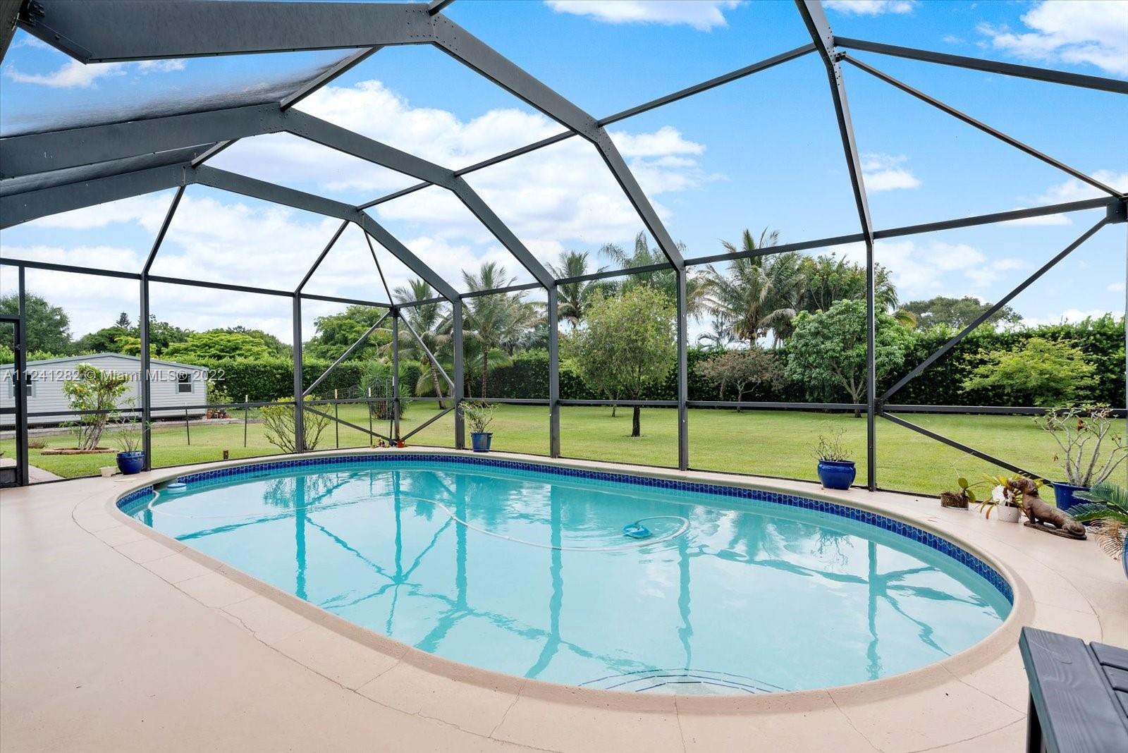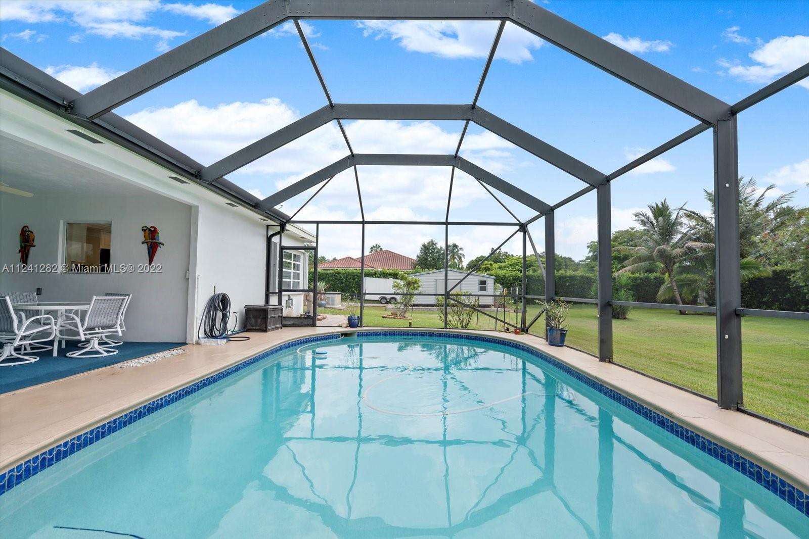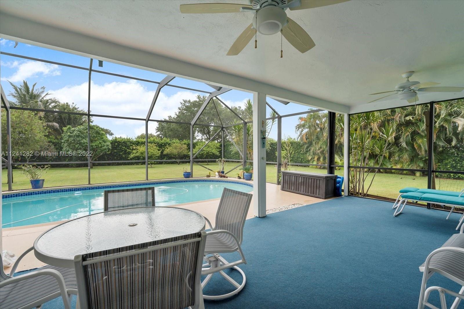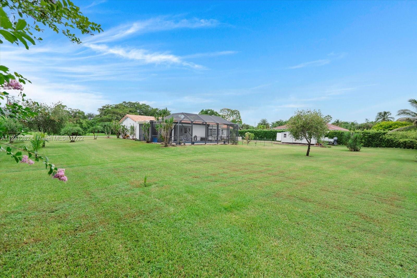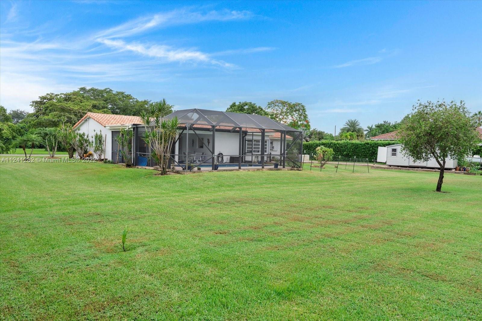 Stunner one-acre lot in Davie offers plenty of space to expand this cozy 2 bedrooms 2 bathrooms single family with screened pool. The one-story home has split floor plan, master bedroom with walking closet, hurricane impact windows, accordion shutters and impact doors. The screened backyard area offers a separate covered area so you can enjoy the pool without getting sunburned. The oversized lot features lush tropical landscaping, with fruit trees including coconut and mango trees. Storage Shed 24x12 offers extra storage space/workshop. 2 Car garage and super long driveway fit up to 6 cars and additional space to park your boat, RV, or trailer. No HOA! A hardwired generator for the whole home. New A/C, pool equipment and water softener. A+ schools. Close to I-595, restaurants, and shopping