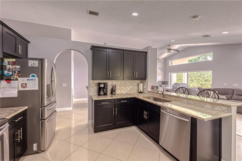 Renovated 3 bed, 2 bath, 2 car garage, split floor plan, in an all ages gated community. Enjoy the open living areas w/ volume ceilings, great natural light, & large sliding doors to the back yard. Updated & open kitchen features espresso cabinets, granite counters, stainless appliances, pantry storage, breakfast bar & recessed lighting. The open kitchen, large living area & formal dining room make an ideal space for entertaining. Marble flooring throughout the living areas & rich engineered wood in the bedrooms. Large primary bedroom has volume ceilings, 2 walk in closets, double vanity, separate tub & shower, linen closet, & more.