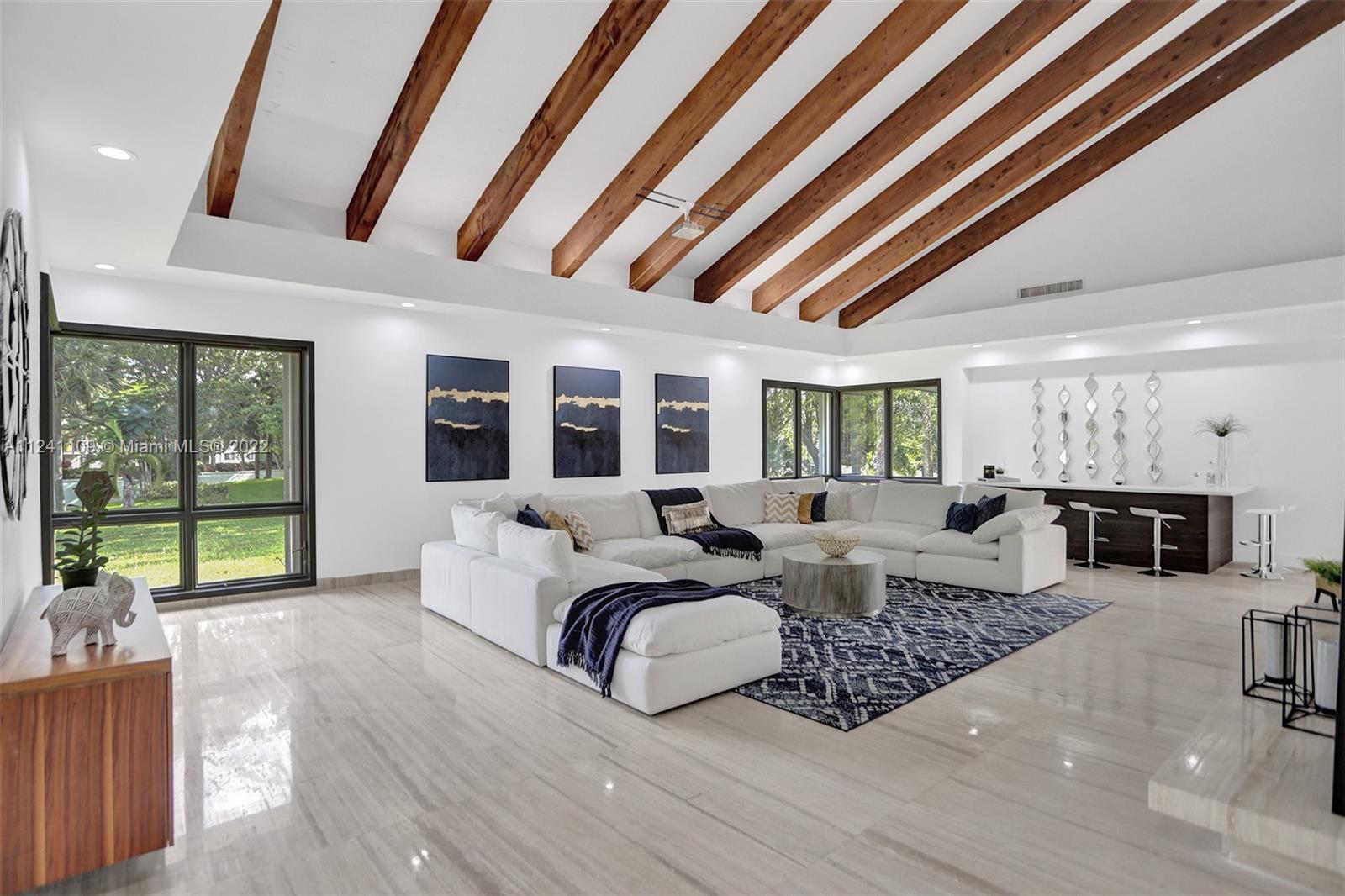 Unique sprawling estate surrounded by a privacy wall, waterfront,lush landscaping with plenty of treescapes and close to three acres. This home features 7 bedrooms, 6 full bathrooms, 2 powder rooms, office, two guest cottages, safe room, expansive primary bedroom and bathroom with sauna, and three car garage. Freshy painted interior and exterior. Newly updated kitchen, bathrooms, flooring and light fixtures. Plenty of room for entertaining and/or space for the family. Enjoy the breathtaking views in your own private oasis that has so much room for additional projects. Backyard has a 50x25 pool with Diamond Brite treatment and pergola. House is protected with accordion/electric shutters with a touch of a switch. Make this your home with an endless possibility of luxury living.