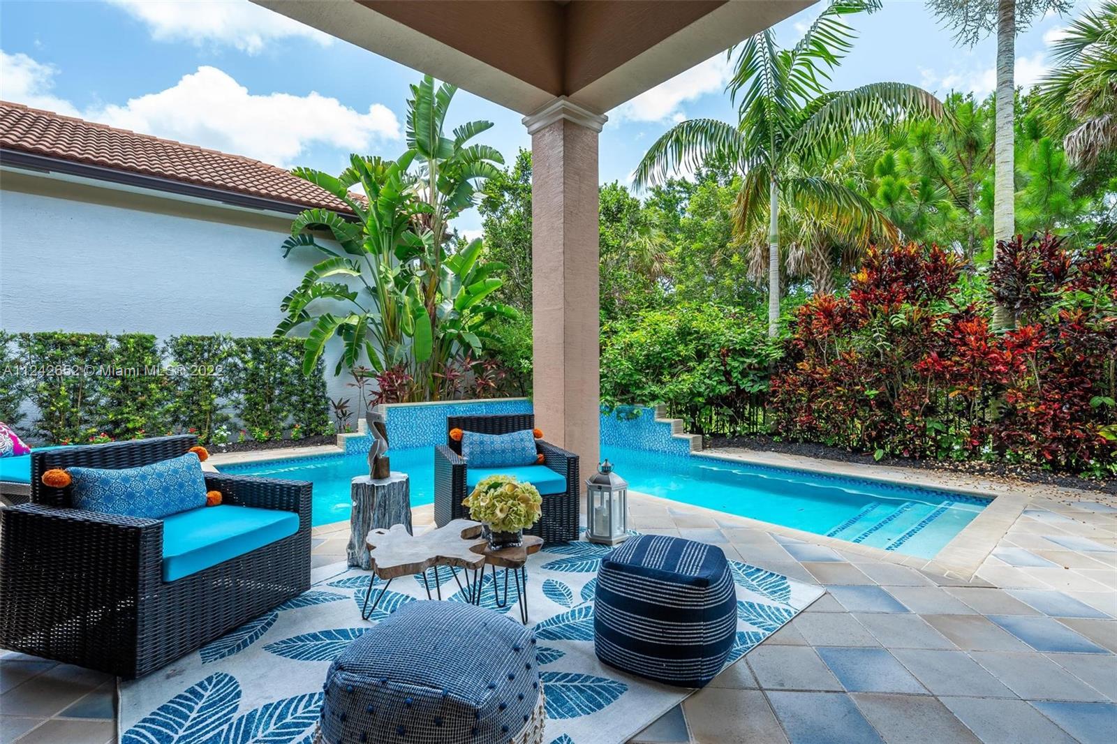 Bright and upgraded ONE story pool home with 3 en-suites, powder room and cabana bath, located at one the most exclusive communities in Boca Raton, restaurants, bars, pool, spa, tennis courts, club house, gym classes, pilates, events, truly a 5 * resort living! White porcelain tile throughout, solid wood custom cabinetry, smart home features, start of art surround system, chef's kitchen with top of the line appliances, kitchen-aid gas stove ang fridge, impact windows and doors. This beautiful house offers you volume ceilings, generous over 3,400 sqft lay-out gives you a large social area, a dedicated office and a media room, a covered patio and a waterfall pool. Maintenance is $919/M + $126 for landscape + $150 mandatory restaurant credit. Generator installed. Furniture is negotiable.
