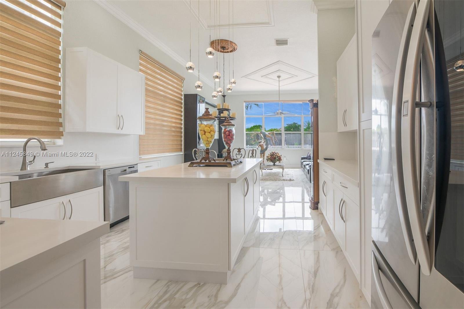 Breathtaking pool and lake view welcomes you upon entering the front door of this upgraded dream home ideal for entertaining, and located in resort style neighborhood. Many upgrades: New huge 4.5 X 4.5 Calacatta Gold Porcelain floors throughout common area. Built in stone mantle; Faux stone crown moldings; Brand new white Gourmet Kitchen w/new Quartz counter tops/back splash and large island. New stainless steel refrigerator, microwave, wine cooler, washer/dryer and water heater. Pool recently remarcited W/LED lighting installed, pool patio redone, built-in bar and grill. Clubhouse, newly renovated w/lagoon style pool, recreation room, party room, Gym, tennis courts, basketball courts and playgrounds. Excellent schools. This is a MUST SEE at Riviera Isles - Portofino!