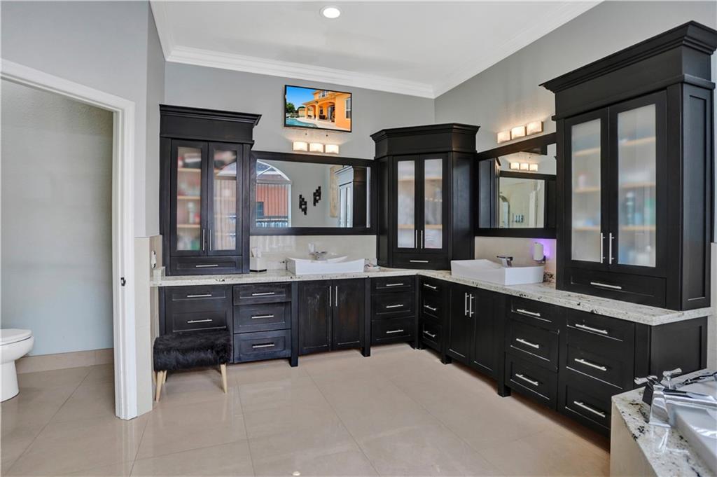 TWO-STORY LAKEFRONT HOME WITH A POOL LOCATED IN THE ESTATES OF TEQUESTA COVE. 5 BEDROOMS, 3 ½ BATHS WITH THE MASTER LOCATED ON THE 1st FLOOR. THE MASTER HAS HIS AND HER SINKS, AND LARGE BUILT-IN AND WALK-IN CLOSETS. ALL BATHROOMS HAVE BEEN UPDATED. THE KITCHEN IS UPDATED WITH BEAUTIFUL REAL WOOD CABINETS. THE SECOND FLOOR HAS 4 BEDROOMS EACH WITH BUILT-IN CLOSETS. THIS HOME HAS A 3-CAR GARAGE. A PORTION OF THE GARAGE INCLUDES A STATE-OF-THE-ART MEDIA AND BAR/PARTY ROOM AND CAN EASILY BE CONVERTED BACK. TANKLESS HOTWATER TANK AND ALARM SYSTEM. INCREDIBLE LAKE VIEWS, 40X12 POOL WITH A WATERFALL, AND EXTENDED DECK AREA FOR ENTERTAINING. THE PATIO IS COVERED AND IS EASILY ACCESSED THROUGH THE FAMILY ROOM OR MASTER BEDROOM.