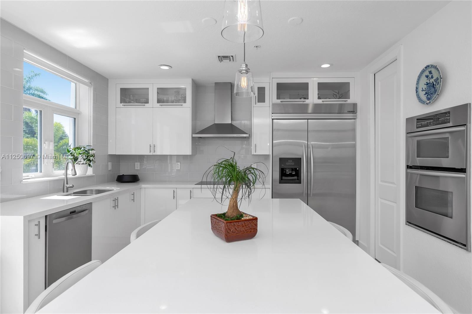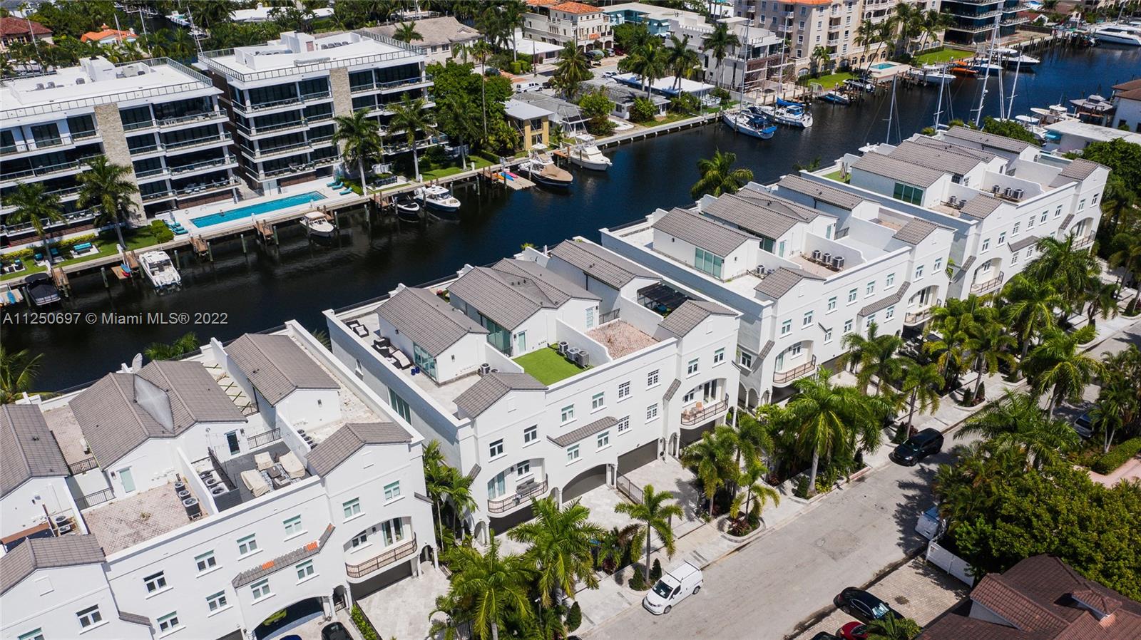 LAS OLAS ISLES - 4-Story Waterfront End-Unit Townhouse with Deeded Dock for up to 50' boat - no fixed bridges! This upscale residence includes of 4 bedrooms, 4 ½ baths, elevator, den, office, workout/hobby room, covered patio/balconies and an impressive rooftop terrace with putting green. Impact windows and doors, gated driveway, two-car garage. Units recently completed extensive exterior upgrades.