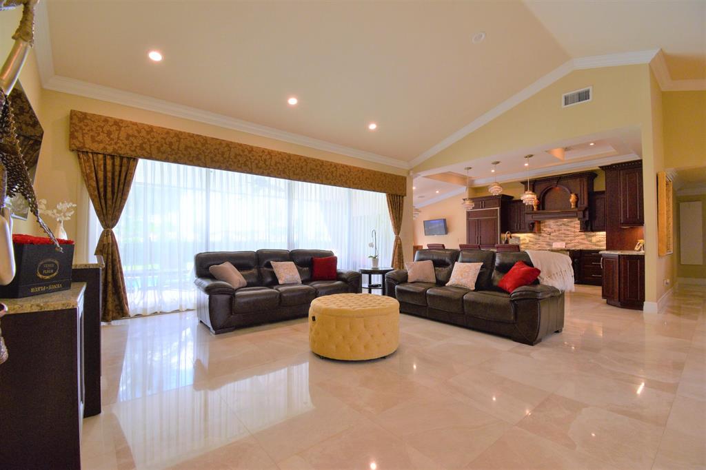 Spacious! Spotless! Spectacular! Magnificent Boca Woods Country Club Estate Home on an incomparable lot with million dollar views of the Woods 12th hole and meandering lake. Seriously the view is EPIC and the yard is fully fenced. The Kitchen is every gourmet chefs dream come true! Imagine the feasts you can prepare using top of the line GE MOMOGRAM wall ovens (yes 2 separate wall ovens), warming drawer and AVANTIUM oven/microwave system. The kitchen also features CUSTOM Omega solid wood cabinetry, wine refrigerator, custom countertops & dramatic backsplash. The OWNERS suite designed to be a private retreat for romance, rest and relaxation! Stunning coffered ceiling, sitting area, incredible built in closets and a resort spa-like ensuite bathroom featuring lighted onyx countertops,