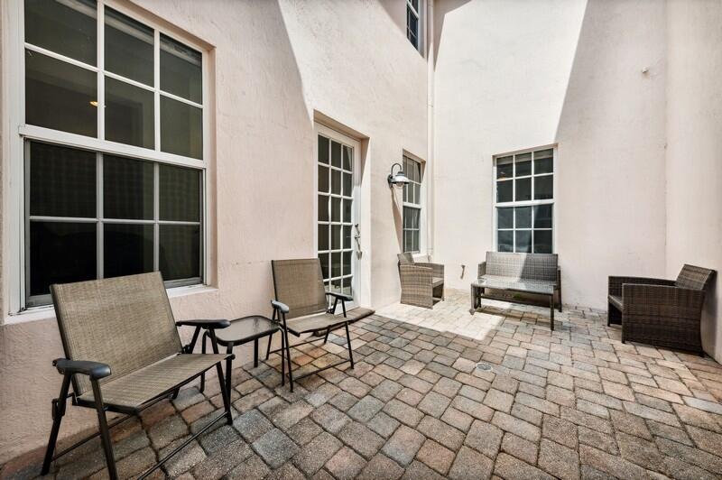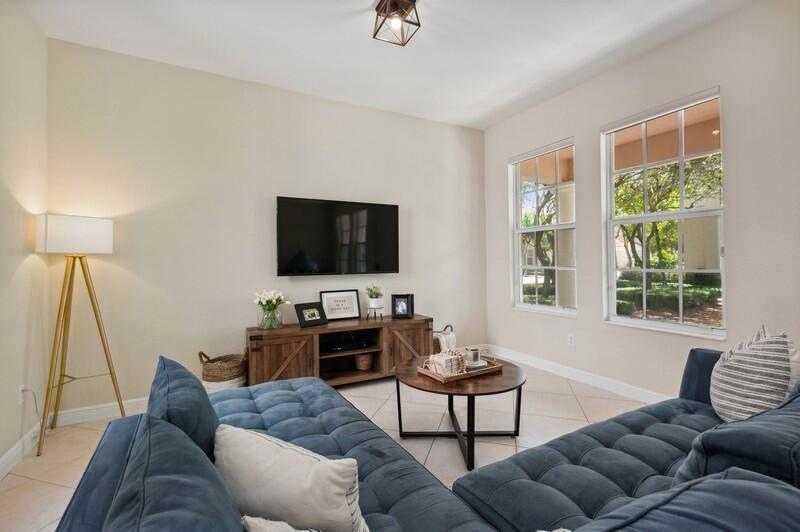 Welcome home to this spacious two story townhouse, boasting three bedrooms, two and one half baths, and an oversized two car garage. The light-filled first floor's open layout includes a large family room, powder room, open kitchen, and spacious living/dining room. The family and living rooms open onto a private, sunny courtyard perfect for enjoying the indoor/outdoor Florida life. Whole house upgrades include impact glass throughout, crown molding, high ceilings, a new A/C (2020), new washing machine (2020), new refrigerator (2019), new water heater (2018), and fresh paint. The open kitchen boasts granite countertops, tall wood cabinets, and stainless steel appliances. Tile on the diagonal runs on the first floor and gorgeous wood-like flooring is found on the stairs and second floor--no