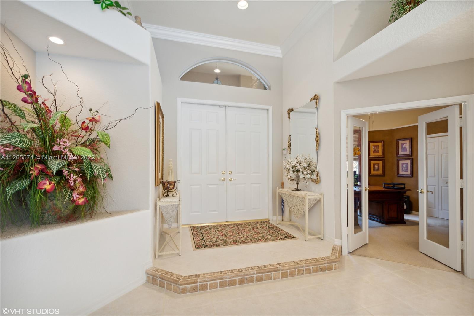 The dream location represents the epitome of opulent living. The estate sits on an oversized lot in a 24-hour man-gated community. The incredible floor plan of this home is open, functional and includes a master suite with a grand hallway, make-up area, and a regal closet; a children's and guests' wing with three spacious rooms, an office with a closet, chef’s kitchen with pantry, seated bar area, surround system, pool, full home generator with 1,000 - gallon gas tank, security cameras, impact windows - kitchen | dining area and accordion shutters. The enormous parking spaces, include a 3-car garage, two separate parking areas, a front porte-cochère, a circular driveway with a water feature and side entrance paved parking for the vehicle fanatics.