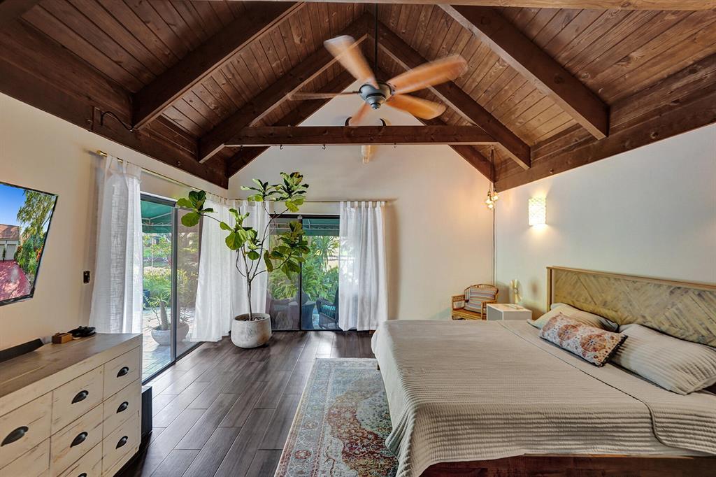 Prepare to fall in LOVE with this eclectic beauty located in the wonderful community of L'Ambiance. This is a 3 bedroom 3 full bath lakefront and end unit townhome with a 2 car garage. This home has been renovated from top to bottom with updated flooring throughout and an open kitchen with SS appliances, granite countertops, and refinished cabinetry and hardware. The bathroom features an onyx stone shower wall, frameless glass door, wood panel ceiling and a custom vanity with brass wall mounted faucet. Stunning wood beams flow throughout the main living area and into the master bedroom which is an oasis with tall vaulted ceilings and serene lake and garden views. Upstairs you'll find a loft with seating area, third bedroom, and another full bath.