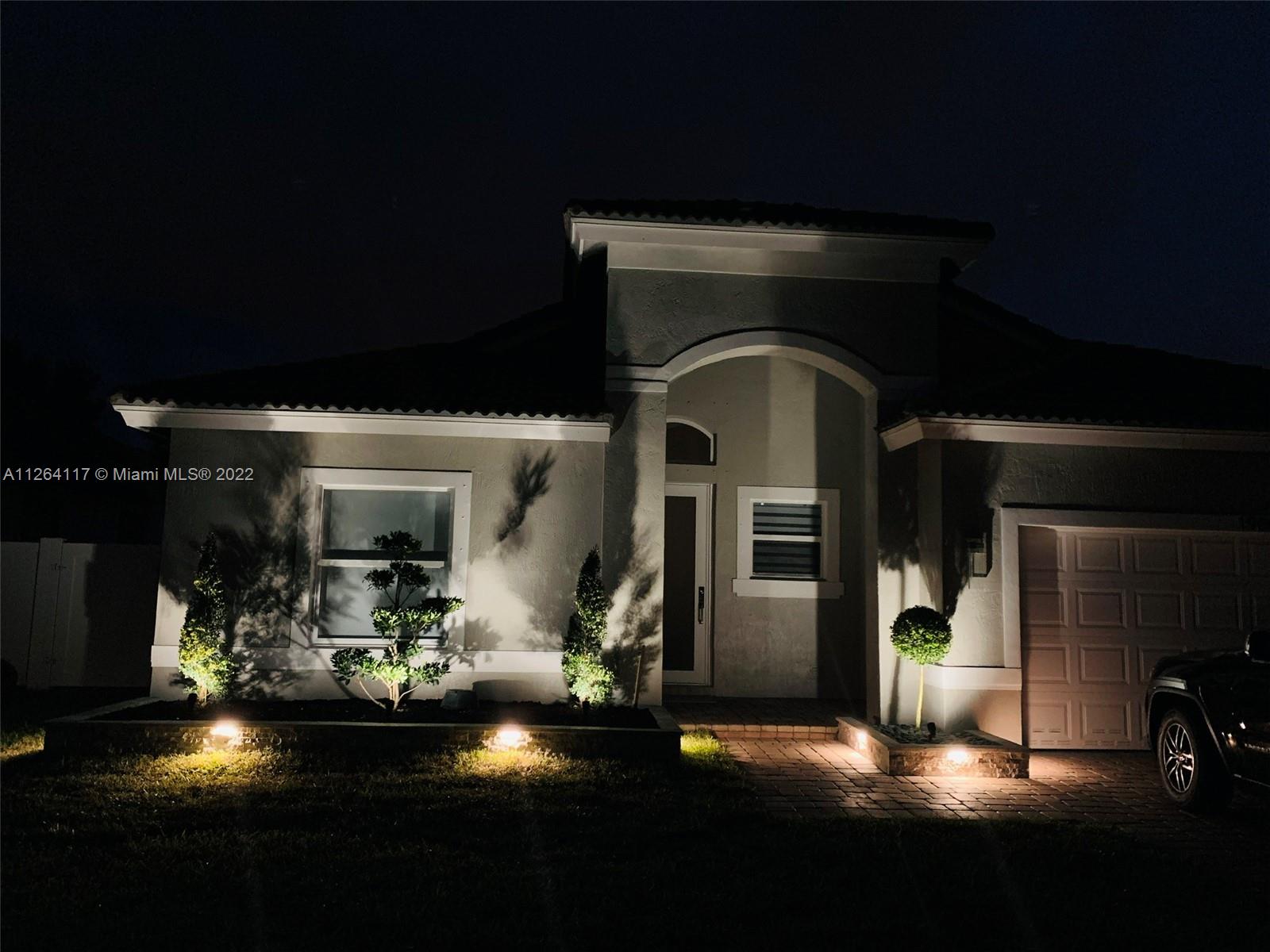 This luxurious, modern, dream home in gated Sunset Lakes features 3 bed/2.5 bath, interior laundry room & a 2 car garage. The spacious fenced in backyard features a pergola with a salt water pool system built in 2019, pool heater, LED multicolor pool lighting and a separate fenced in side patio with travatine pavers. The spa-like master bath features a double sink vanity, large glass enclosed shower, soaking tub and walk-in custom California closet. The spacious kitchen includes KitchenAid built in stainless steel appliances & an oversized quartzite island. Zebra blinds, custom closet doors, custom closets, hurricane impact windows & doors, new Carrier AC unit, LED lighting throughout, upgraded security system, elegant zen landscaping with up lighting and much more.