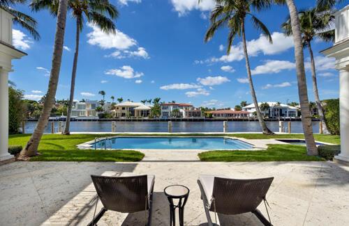 Classic elegance reaches the height of refined sophistication in this Palm Beach Georgian-inspired residence on the Intracoastal Waterway, minutes from the ocean and The Boca Raton club. Completed in late 2006, this exquisitely appointed residence was an original collaboration of premier luxury homebuilder Mark Timothy, Inc., noted architect Thomas Kirchhoff.Warmly inviting and flawlessly functional, the spacious living areas flow seamlessly off of the stately marble reception hall. Glass doors wrapping around the full waterfront exposure open the entire main floor to refreshing breezes while transitioning the interiors to the outdoors through loggias with an open-air fireplace.