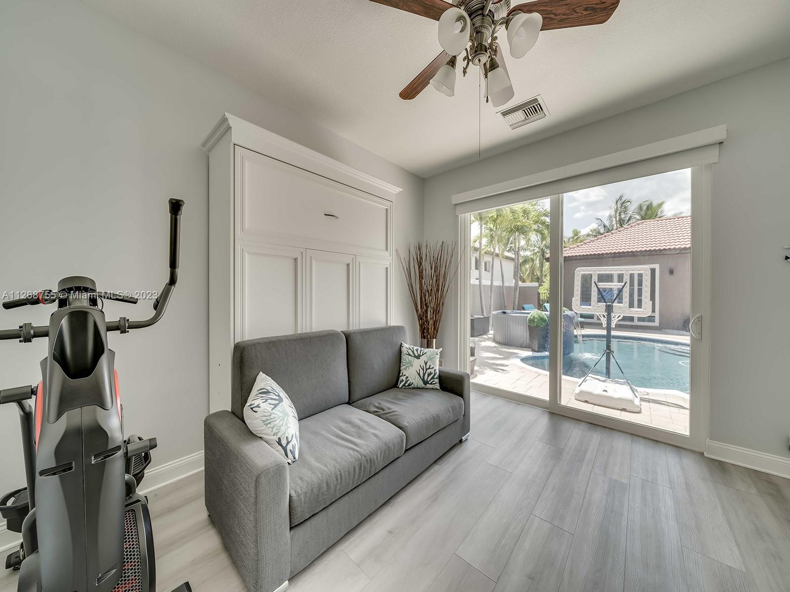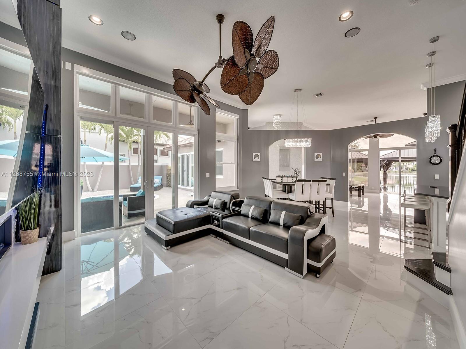 Located in the beautiful community of Sunset Lakes this luxurious, fully renovated, lake front home is move-in- ready. This home features a brand new kitchen with state-of-the-art appliances including built in coffee machine, smart fridge with built in tablet, wine cooler. Family room has a custom built-in TV wall unit with wooden cabinetry and an electric fire place with LED lighting. This home boasts a custom theater room great for watching movies and gaming. Beautiful tile flooring throughout the 1st floor and engineered wood flooring on the 2nd floor. Custom staircase, electric window treatments, entry niche with waterfall, built-in closets in every room. Enjoy a heated pool and gazebo. This sought after courtyard model is also known as the Victoria model which includes a guest house.