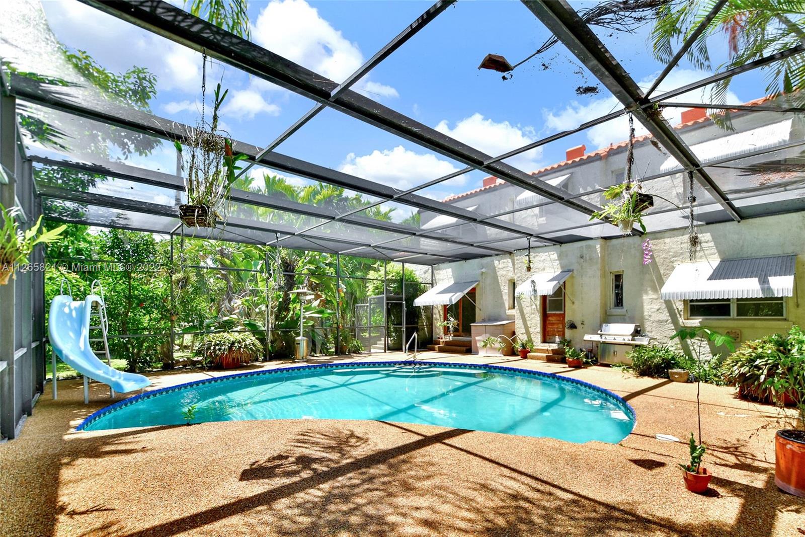 Price reduced below appraised value to account for your updates and repairs! Historic charm nestled in Coral Gables. Updated kitchen in 2022, granite countertops, tile backsplash, new flooring & new stainless steel appliances! Entry way has an enclosed porch with French doors, living room has a fireplace, formal dining room, 2 bedrooms on first floor, & full bathroom which serves as a cabana bath. Upstairs has 2 spacious bedrooms & shared bathroom with combined tub/shower with original tile. Gorgeous old details like crystal doorknobs, archways, original hardwood floors! Huge screened patio, amazing sized pool! A large detached outbuilding could easily be converted into an office space, cabana, or whatever your heart desires! Thought to be designed by one of Coral Gables first architects.