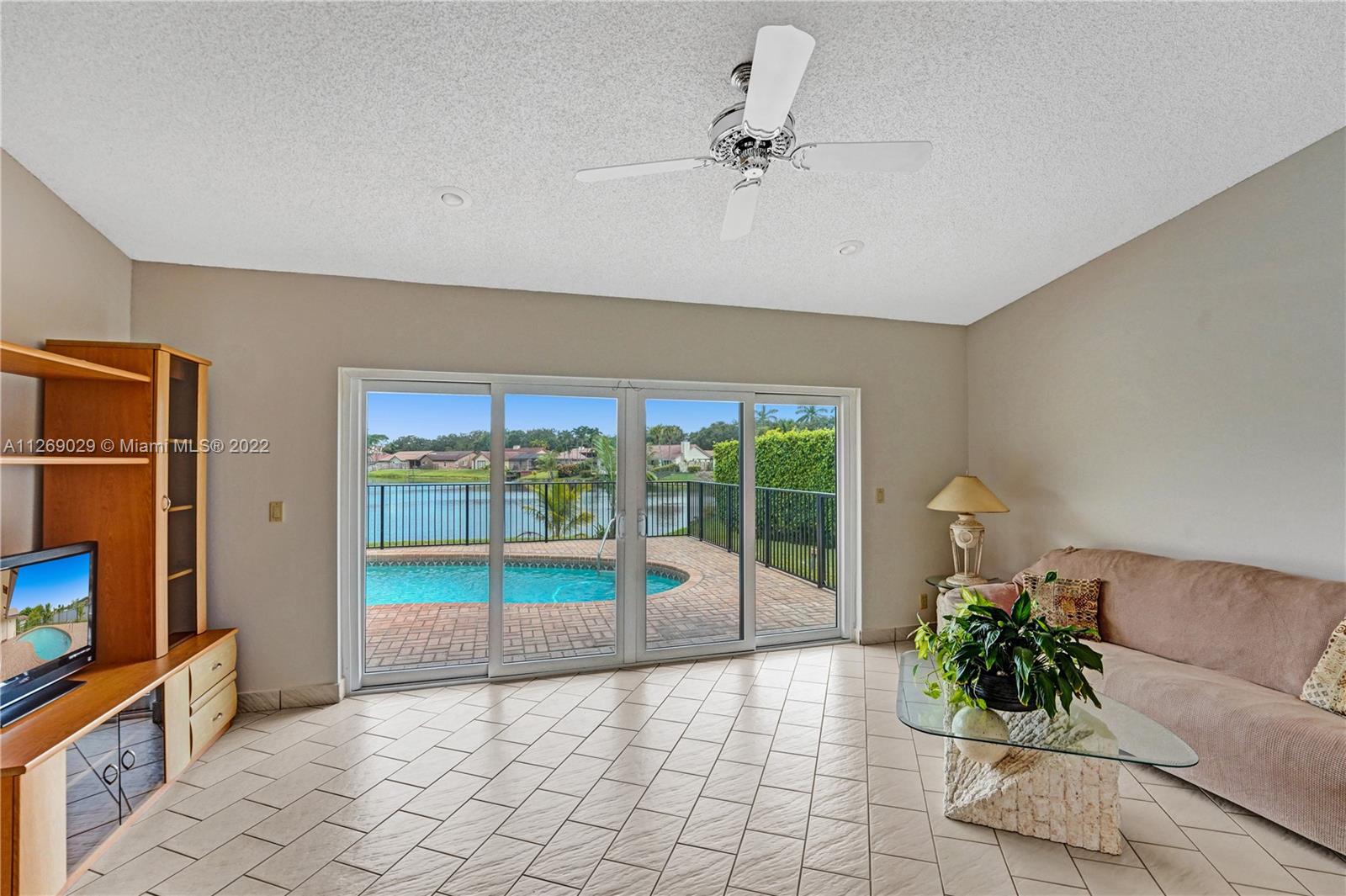 Jacaranda Lakes is a highly sought-after neighborhood in Plantation. Walk through the sun-lit majestic entry with soaring cathedral ceilings and be greeted with an open floor plan, expansive and breathtaking views of the pool area and serene lake. The 4 bedroom 2 bath home has been meticulously cared for. Impact windows throughout (sliding doors as well). From the open living room and family room you have access to the covered patio area and fenced pool. Patio has room for a table & chairs. Large 2 car garage. Laundry room has been updated with a new washer/dryer and wash basin (June 2022). Large bedroom closets, 2 are walk-in. Kitchen pantry & 2 additional closets. Two AC units (2009 & 2013). Pool pump is new April 2022. Roof is 2006. House exterior painted in 2021. Great opportunity!