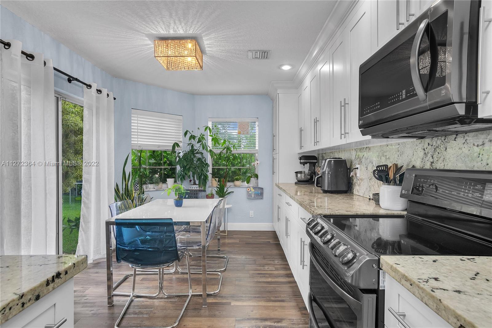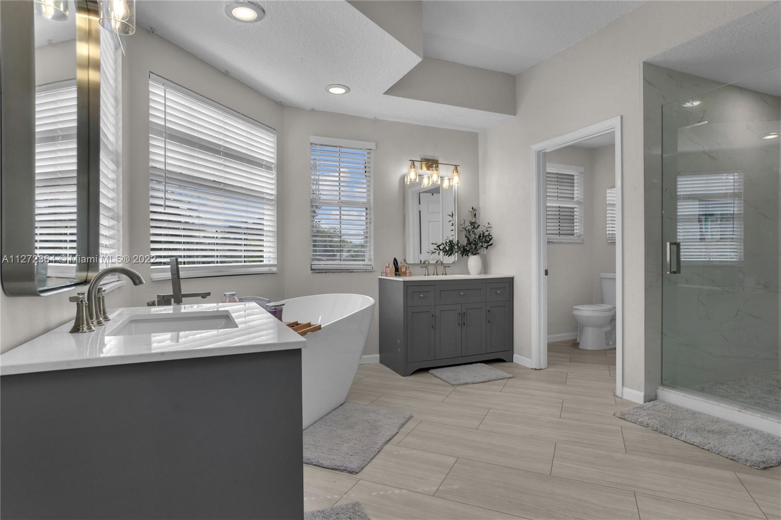 This gorgeous 2 story home in the hidden community of Stirling Village, offers all the modern design elements expected in a completely remodeled home. With dramatic vaulted ceilings, plenty of natural light, a grand staircase & engineered vinyl plank floors throughout. The spacious kitchen, remodeled in 2018 along with the 3 bathrooms, was designed for entertaining with an abundance of storage. 1 bedroom & bath downstairs; upstairs find the master suite, remodeled in 2021 featuring separate vanities and a glamorous freestanding tub. All bedrooms offer closet organization systems. The expansive corner lot boasts a sparkling salt water pool, resurfaced in 2019 with travertine pavers & a double wide gate perfect for boat access. The heart of Cooper City, surrounded by A rated schools. NO HOA!