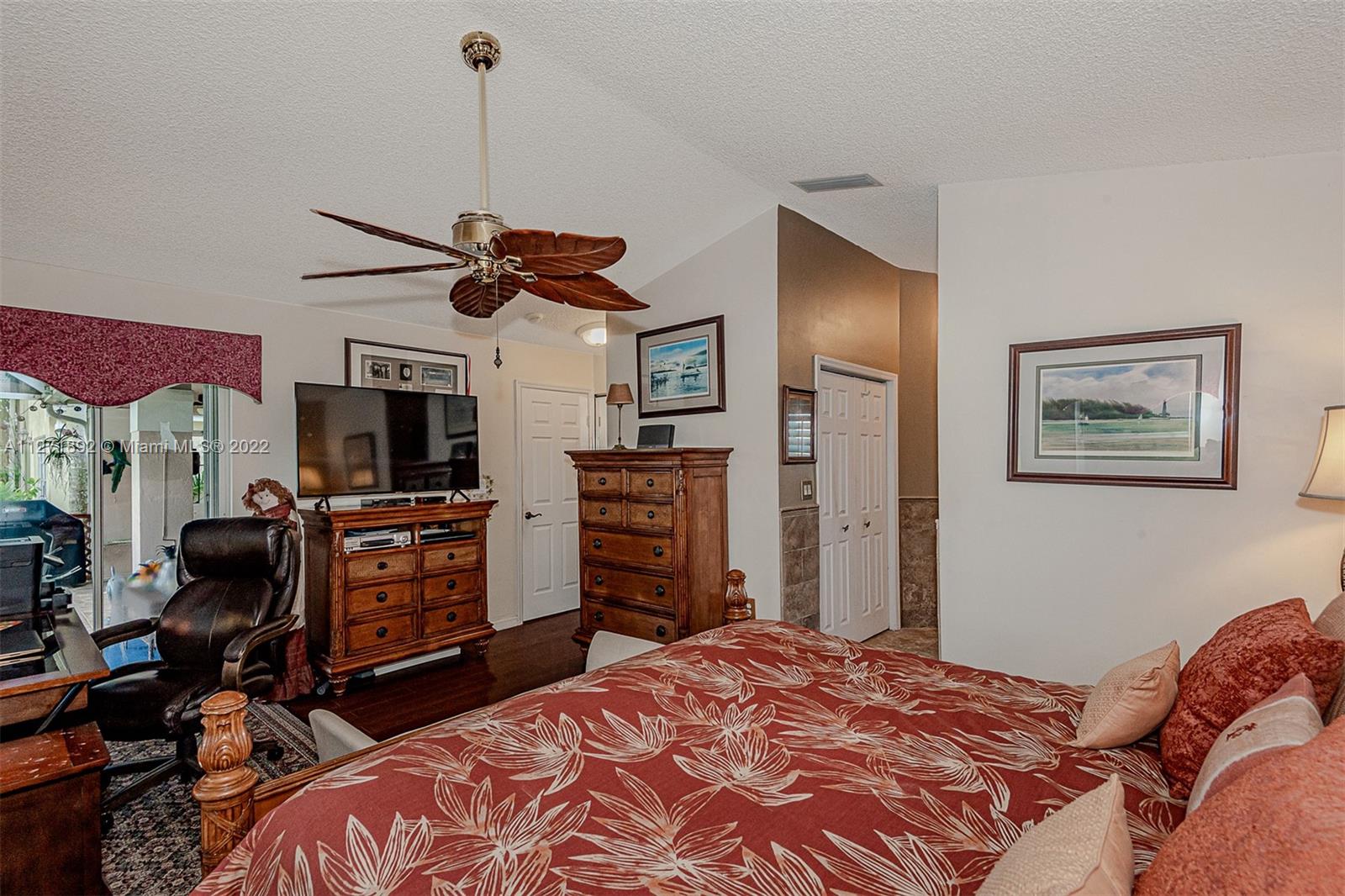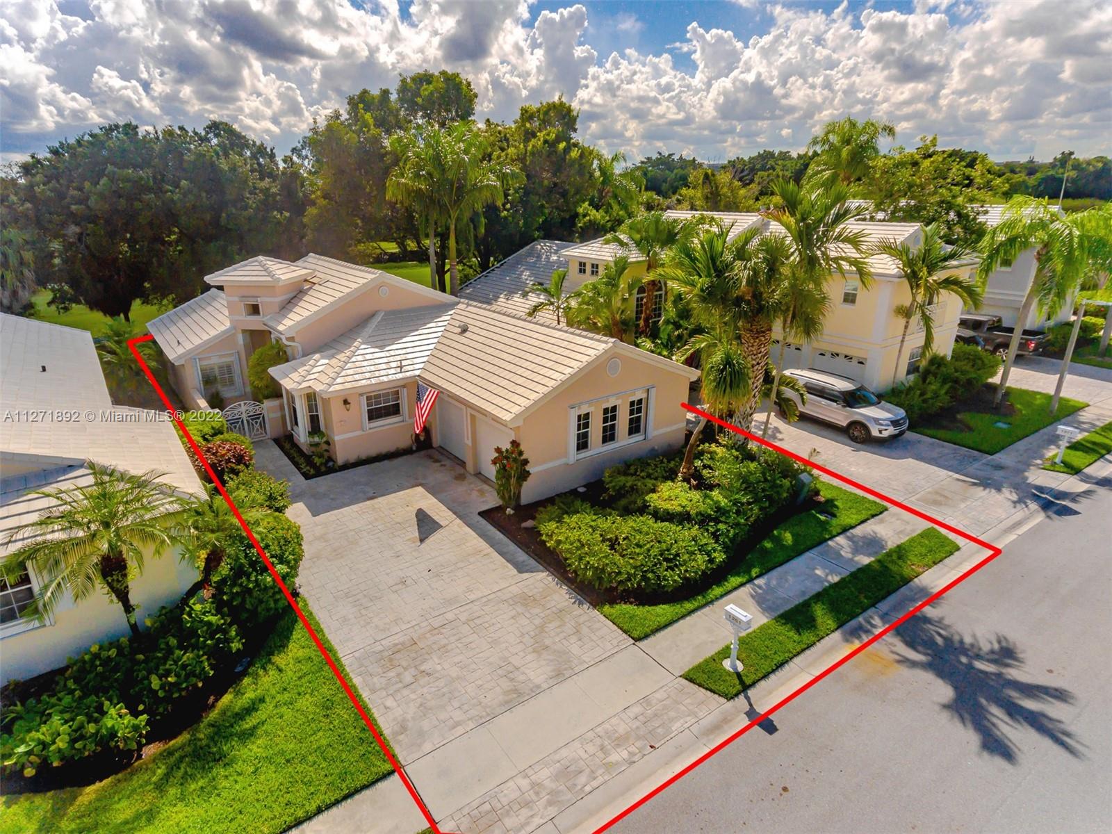 Magnificent home with lake and golf view in the private guarded Grand Palms Golf Course and Country Club. 2 bed and 2 bath converted from a 3/2 by the builder creating a great room living space with screen in patio. HOA includes 24 hour manned gate and roving patrol, landscape maintenance, tree trimming, sprinklers, house painting every 4 years, pressure cleaning of roof and sidewalks every six months, basic cable, ADT alarm monitoring, mailbox replacing every 4 years. New roof 2015, new A/C 2015, new water heather 2015, accordion shutters, installed plug-in hook up for external generator. New landscaping, new leaf filer gutters in rear and front, new pavers on screen patio. Golf cart and generator available for purchase.