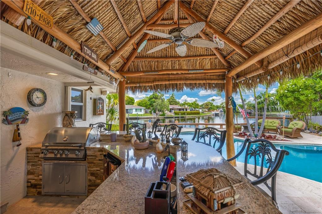 STUNNING WATERFRONT HOME WITH 75' OCEAN ACCESS. BEAUTIFULLY SITUATED 2 STORY HOME IN THE GATED BAL HARBOUR COMMUNITY. IMPACT WINDOWS AND DOORS. PERFECT FOR ENTERTAINING WITH BEAMED VOLUME CEILINGS AND OPEN CONCEPT LIVING. AMAZING VIEWS OF THE MIDDLE RIVER. 3 BED 2.5 BATH AND HUGE OFFICE/DEN. OPEN KITCHEN WITH ADJACENT DINING, LARGE LIVING ROOM WITH GAS FIREPLACE, OPEN STAIRWAY TO SECOND FLOOR. NEW TILE FLOORING, UPDATED BATHS, EN SUITE MASTER. 2 CAR GARAGE, FABULOUS TIKI BAR W/FULL GAS BBQ ON RESORT-LIKE SETTING. GORGEOUS FREE FORM HEATED POOL. FULL WIDE DOCK. FANTASTIC OPPORTUNITY IN A PRIME LOCATION. ADD YOUR PERSONAL TOUCHES TO MAKE THIS YOUR PERSONAL SHOWCASE. WALKING DISTANCE TO GREAT SHOPPING AND THE BEST RESTAURANTS. BIKE TO THE BEACH AND MINUTES TO GALLERIA MALL AND DOWNTOWN FTL.