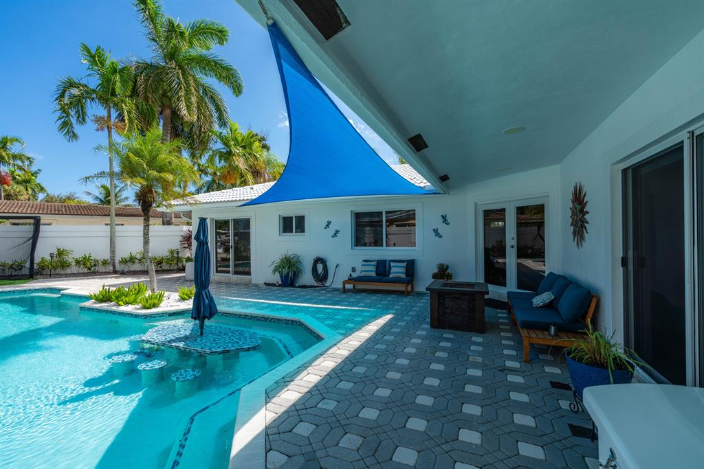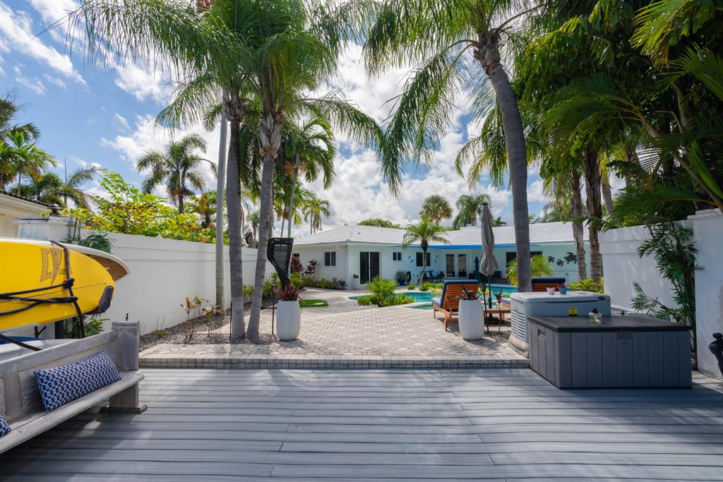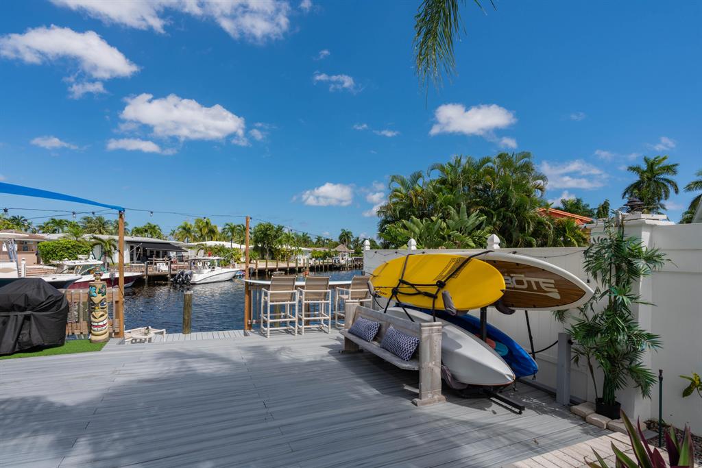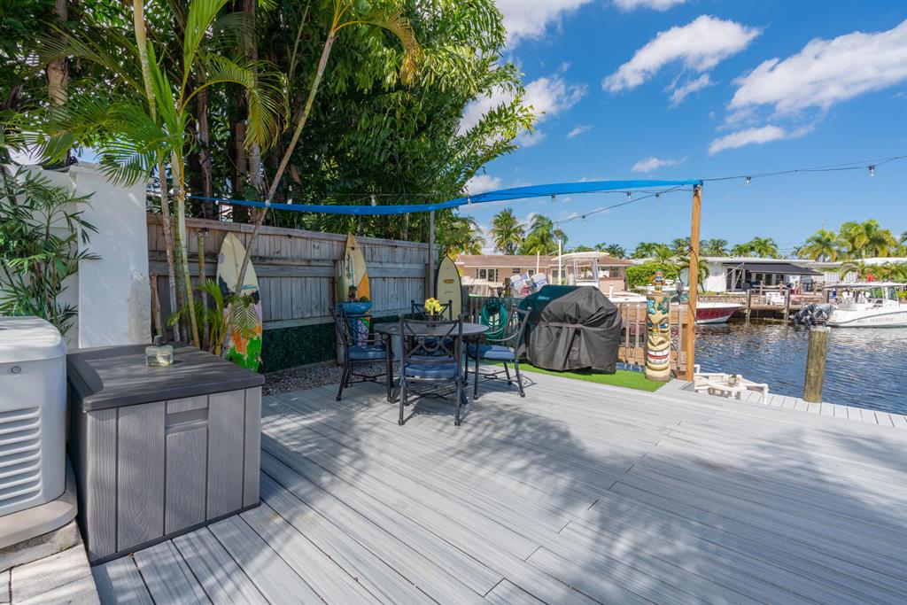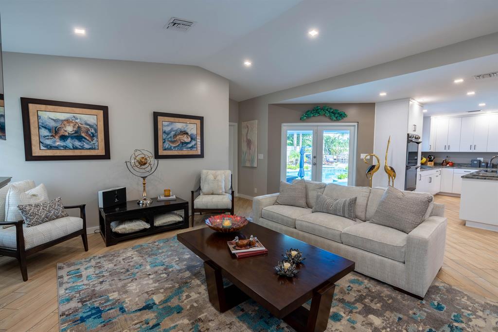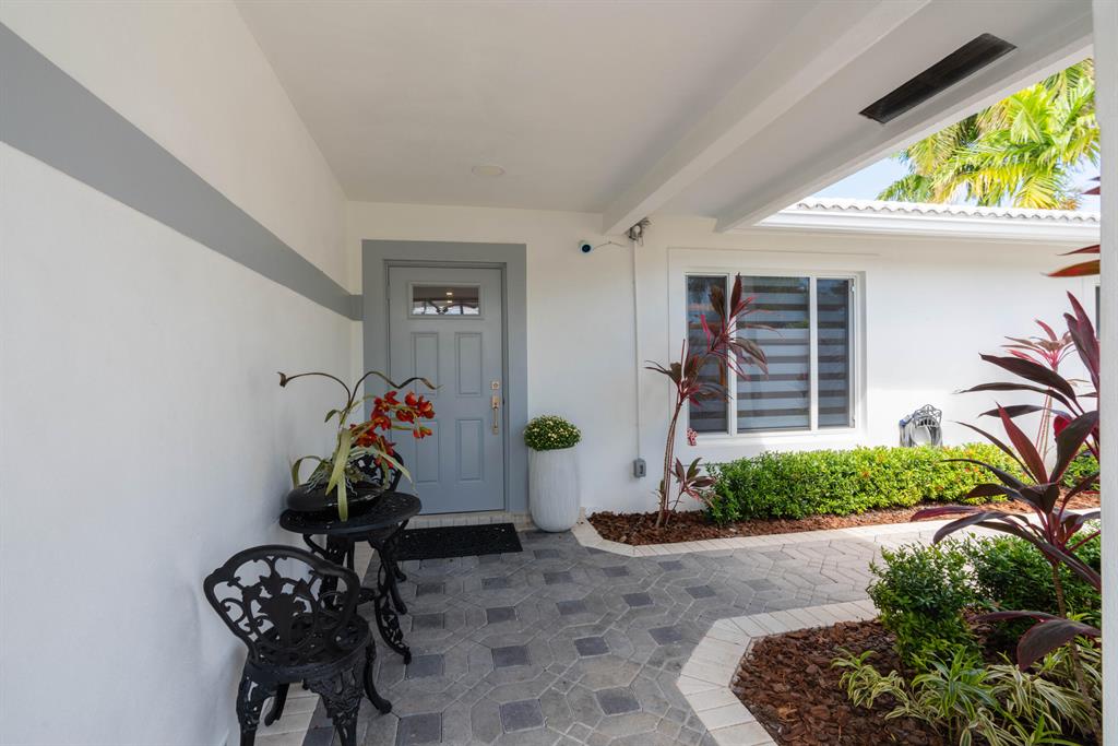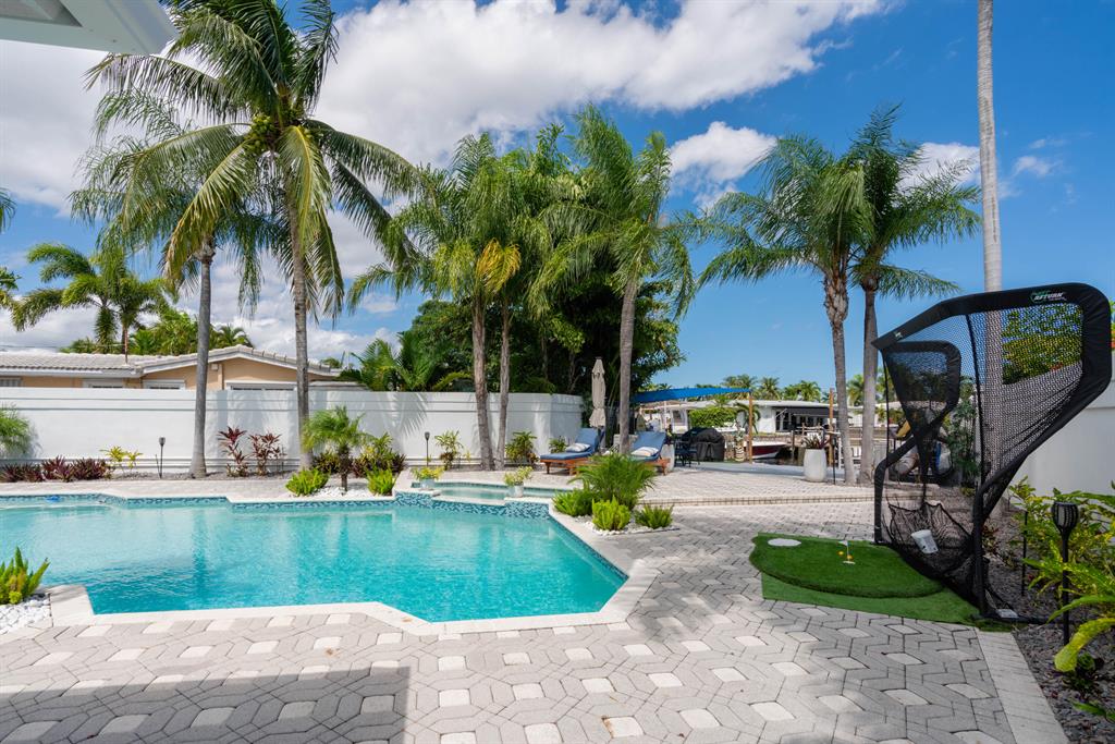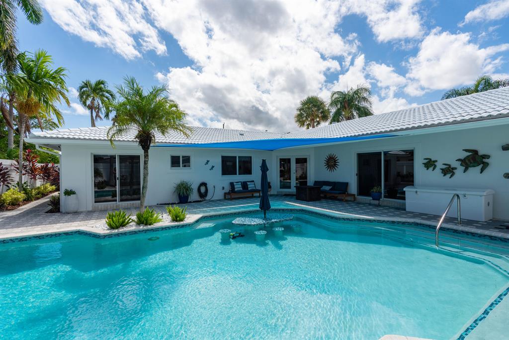 Beautifully remodeled waterfront home with ocean access on a large corner lot! The open concept floor plan allows for ample sunlight throughout this 3 bedroom, 2.1 bath home. Volume ceilings, recessed LED lighting, tile wood flooring & an oversized granite kitchen island captivate you upon entering. Each bedroom has sliders leading out to the resort style backyard where you'll find an oversized pool/spa & 30 feet of water frontage. A concrete wall surrounds the home for added privacy, truly making this your very own tropical oasis. Full house generator, all impact windows & doors, upgraded landscape lighting, outdoor shower & cabana bath. Brand new electrical panel installed Sept. 2022 & new dock flooring just completed. This Florida home is truly move-in ready!