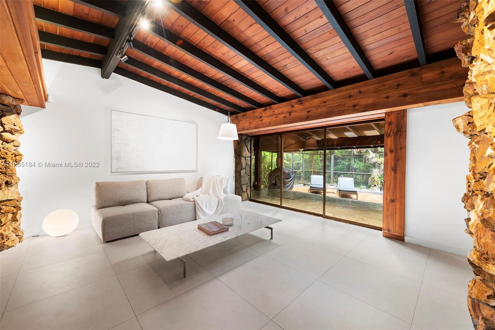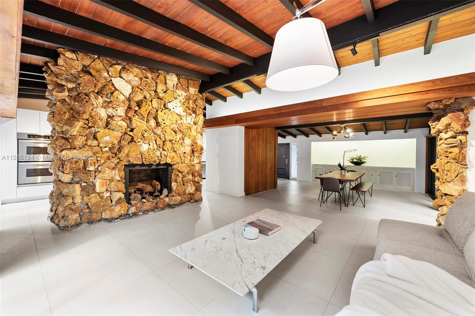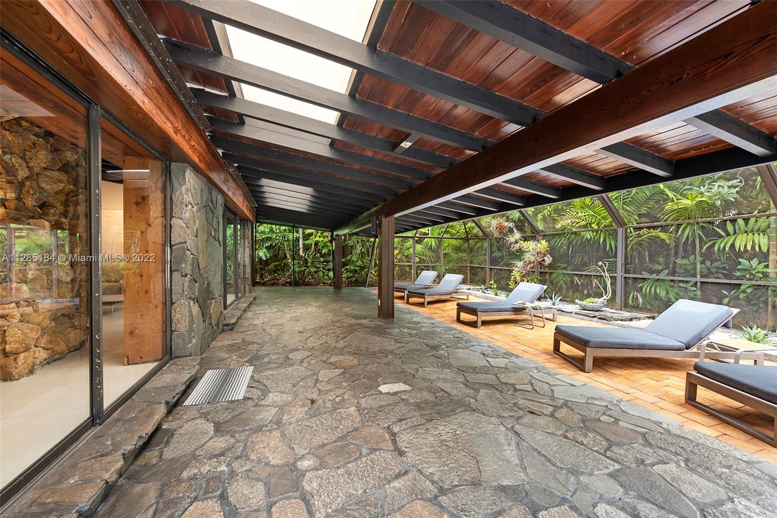 Stunning, ultra-private luxury home designed by renowned modernist architect Alfred Browning Parker. Completely renovated, the unique, nature-inspired home has 3 beds (converted from four) and 2 baths with new porcelain tile throughout. Spanning 3,181 square feet, the open concept living spaces display masterpiece craftsman touches including vaulted, beamed ceilings, original onyx rock fireplace, and exterior gray slate from Colorado. A brand-new kitchen features state-of-the-art appliances, wine fridge, white quartz counters with breakfast bar, and custom white cabinets. The spacious master suite has custom his/her closets with lighting and a designer open bathroom with dual sinks, Toto toilet and bidet, glass shower, and Clovis standalone soaking tub looking out to the garden.