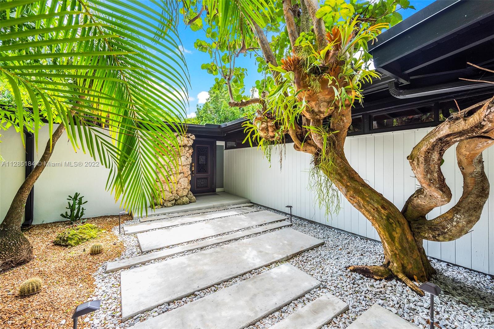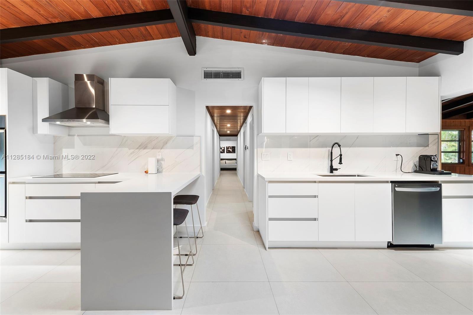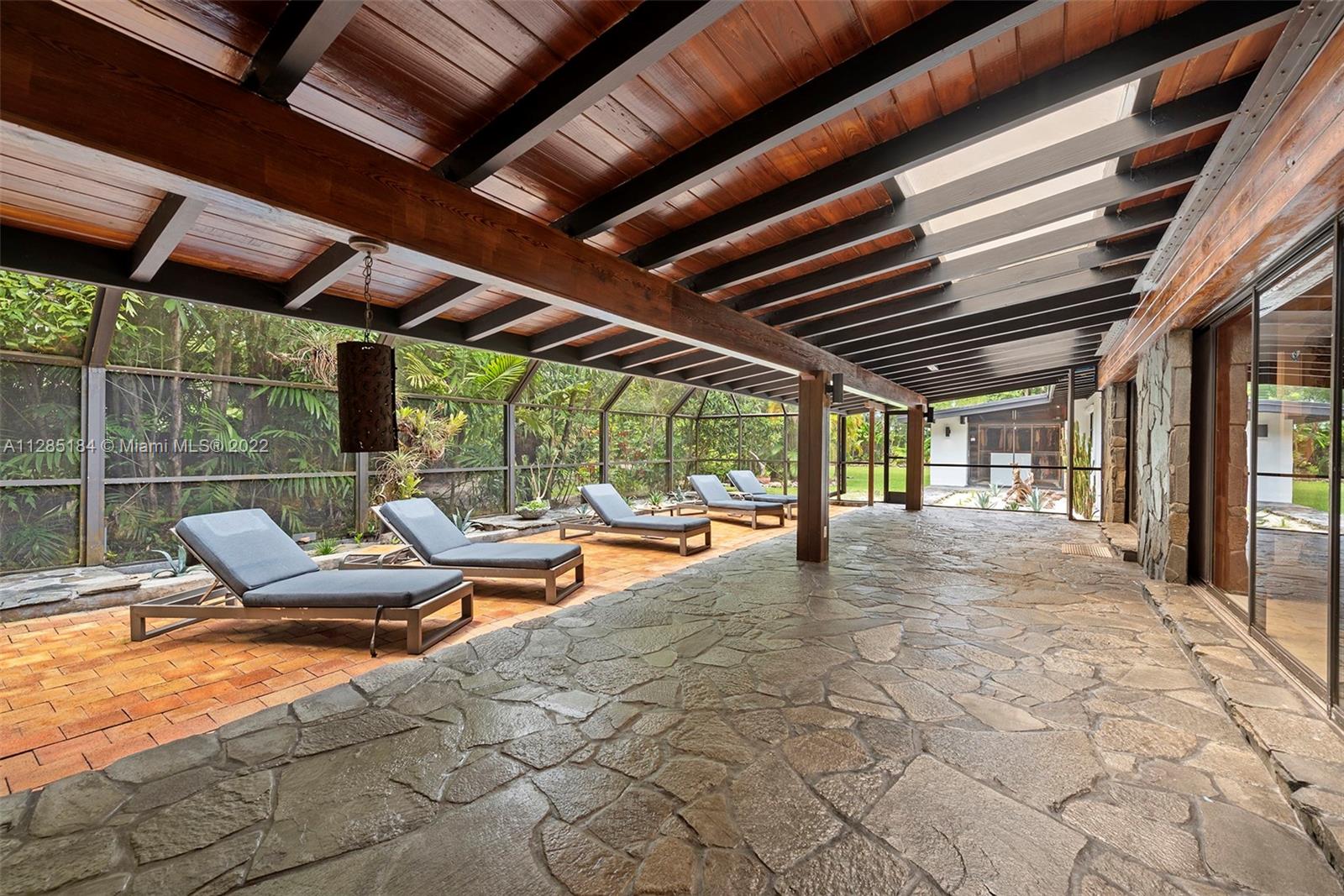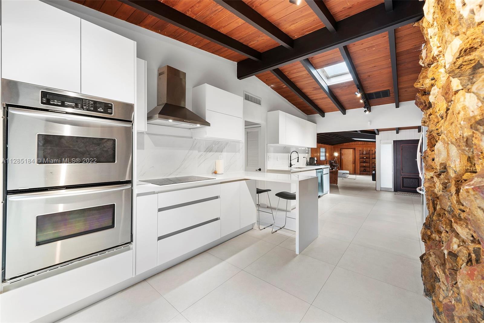 Stunning, ultra-private luxury home designed by renowned modernist architect Alfred Browning Parker. Completely renovated, the unique, nature-inspired home has 3 beds (converted from four) and 2 baths with new porcelain tile throughout. Spanning 3,181 square feet, the open concept living spaces display masterpiece craftsman touches including vaulted, beamed ceilings, original onyx rock fireplace, and exterior gray slate from Colorado. A brand-new kitchen features state-of-the-art appliances, wine fridge, white quartz counters with breakfast bar, and custom white cabinets. The spacious master suite has custom his/her closets with lighting and a designer open bathroom with dual sinks, Toto toilet and bidet, glass shower, and Clovis standalone soaking tub looking out to the garden.