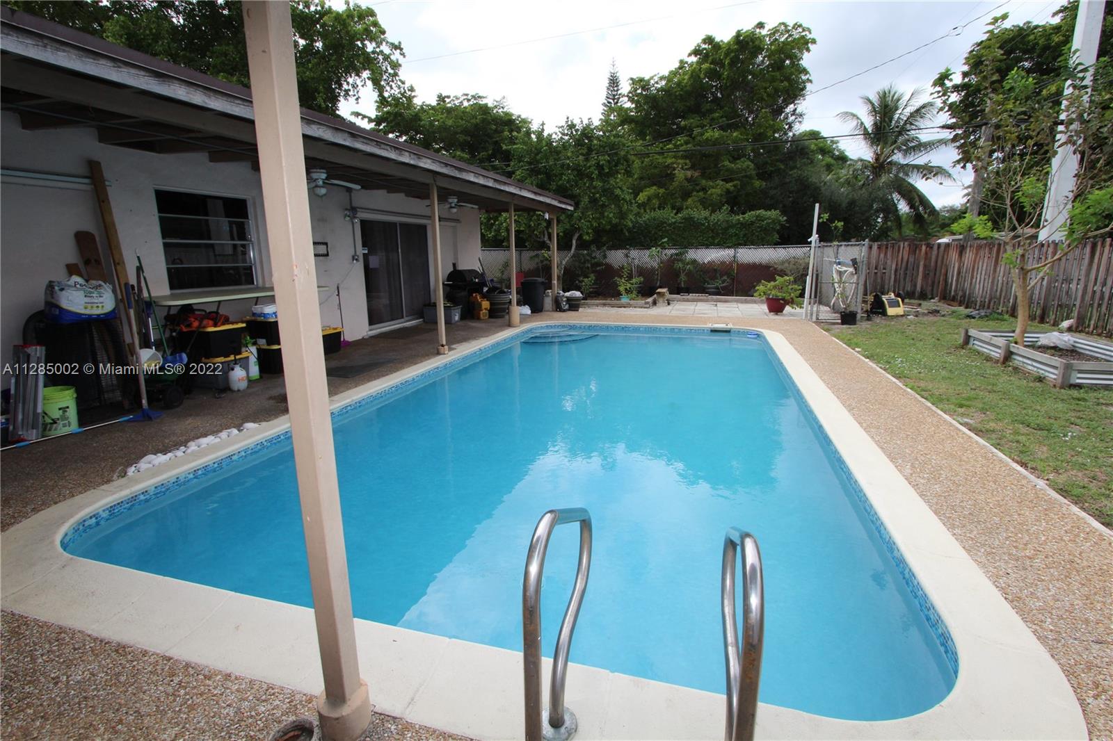 Don't miss this one! 3 bed, 2 bath on a large corner lot on a dead end road. Pre-school, Elementary, and high school all within walking distance. 3 bedrooms with lots of natural lighting and 2 full baths. Large living room adjacent to the formal dining room. kitchen with lots of cabinets with a pass through window to the pool deck and a den. Large outdoor living space with a full size pool and a 2 car garage that has lots of built in storage. 24x24 tile throughout. Master bedroom has sliding doors to step right out to the pool deck and an entrance door right into the master bathroom to keep from tracking water through the house. Mango tree, everbearing mulberry tree, 2 different types of guava trees, avocado tree, banana trees, and a star fruit tree. Assumable FHA Loan, $251,000 to assume