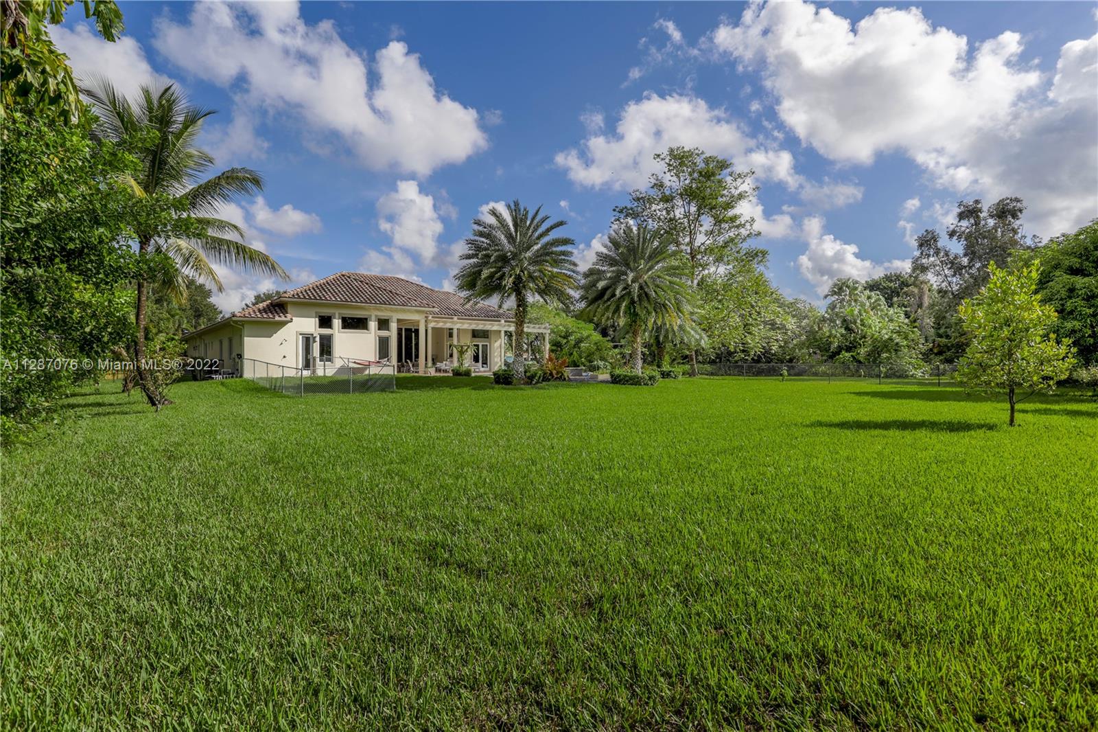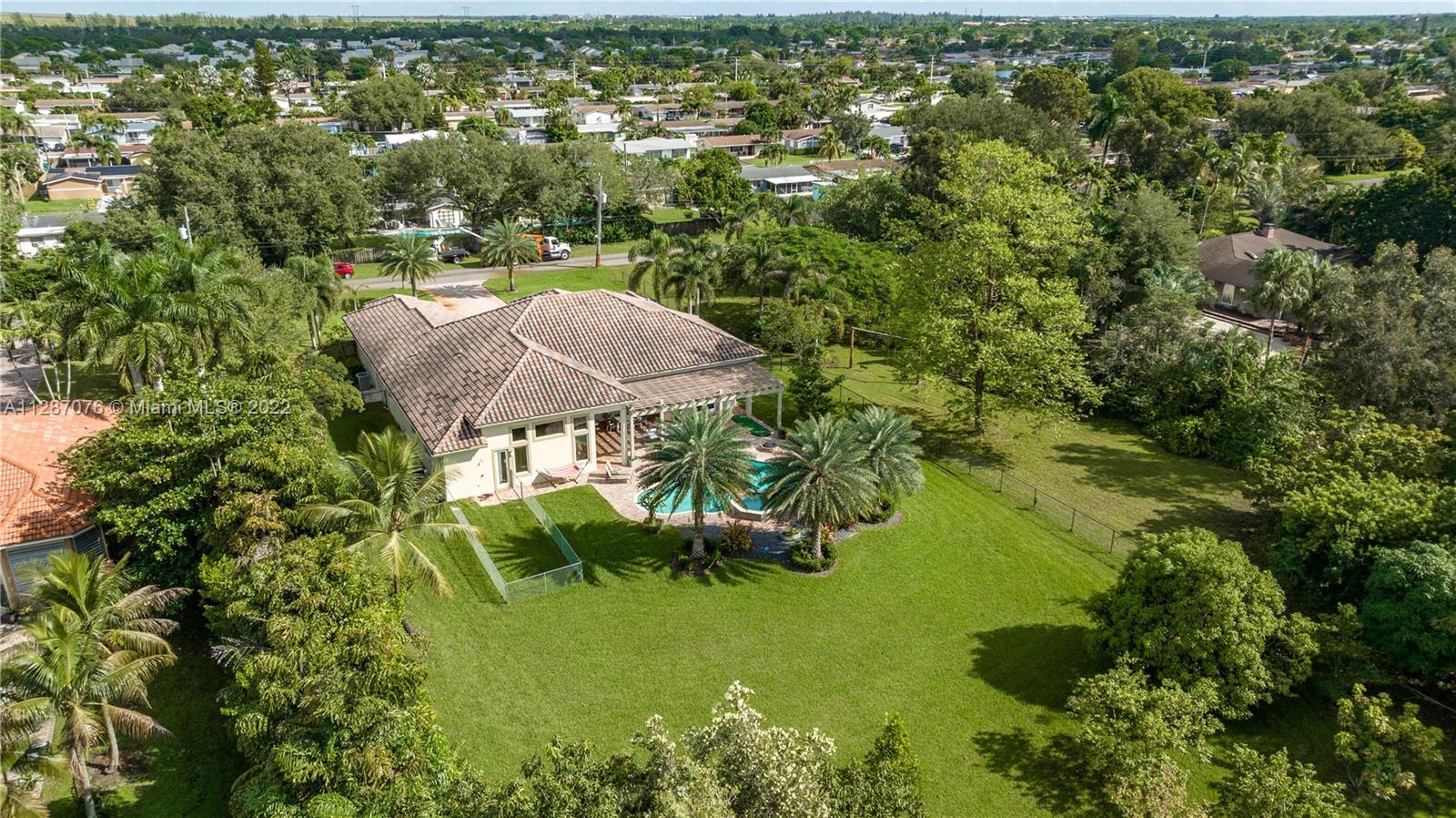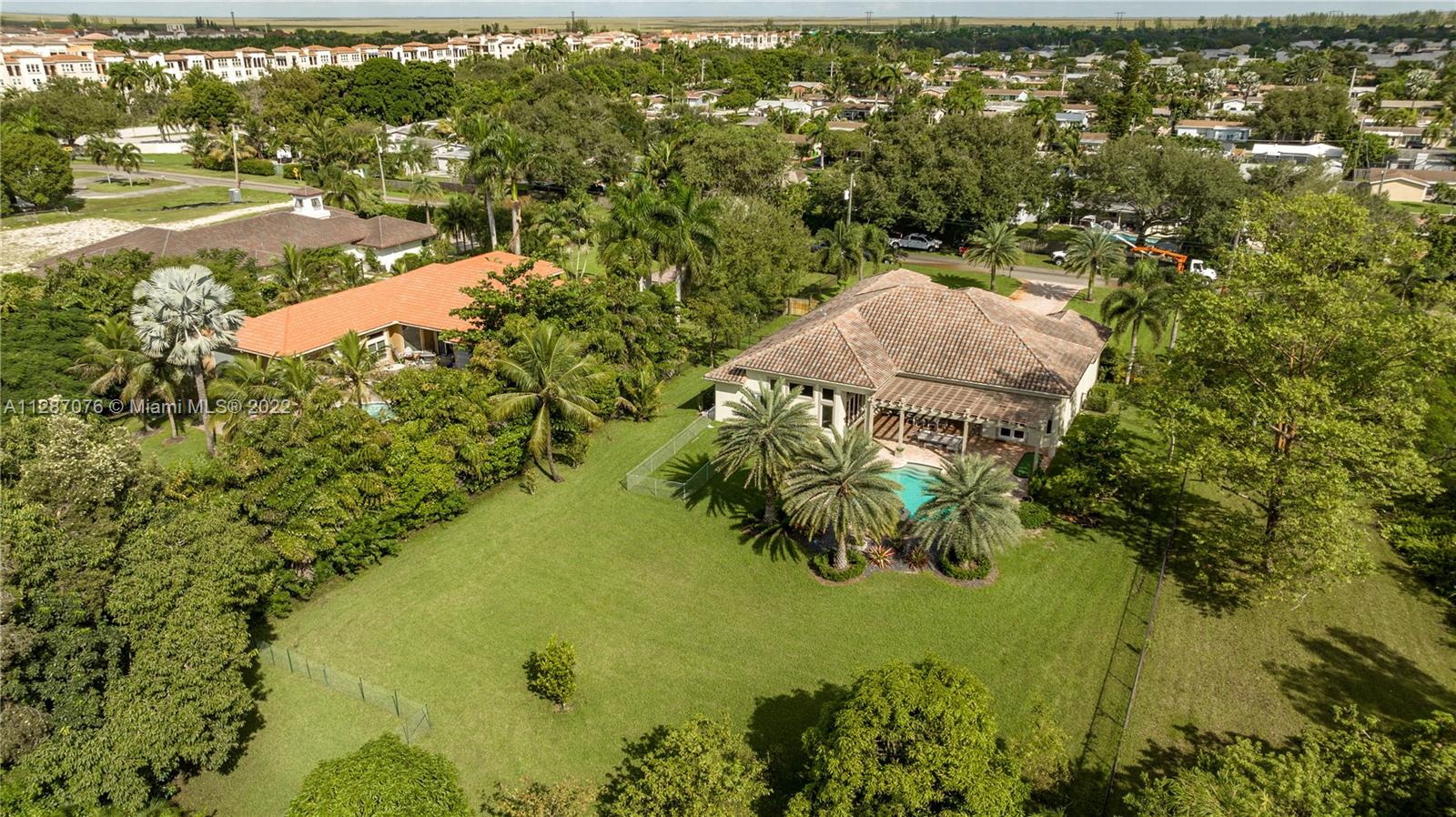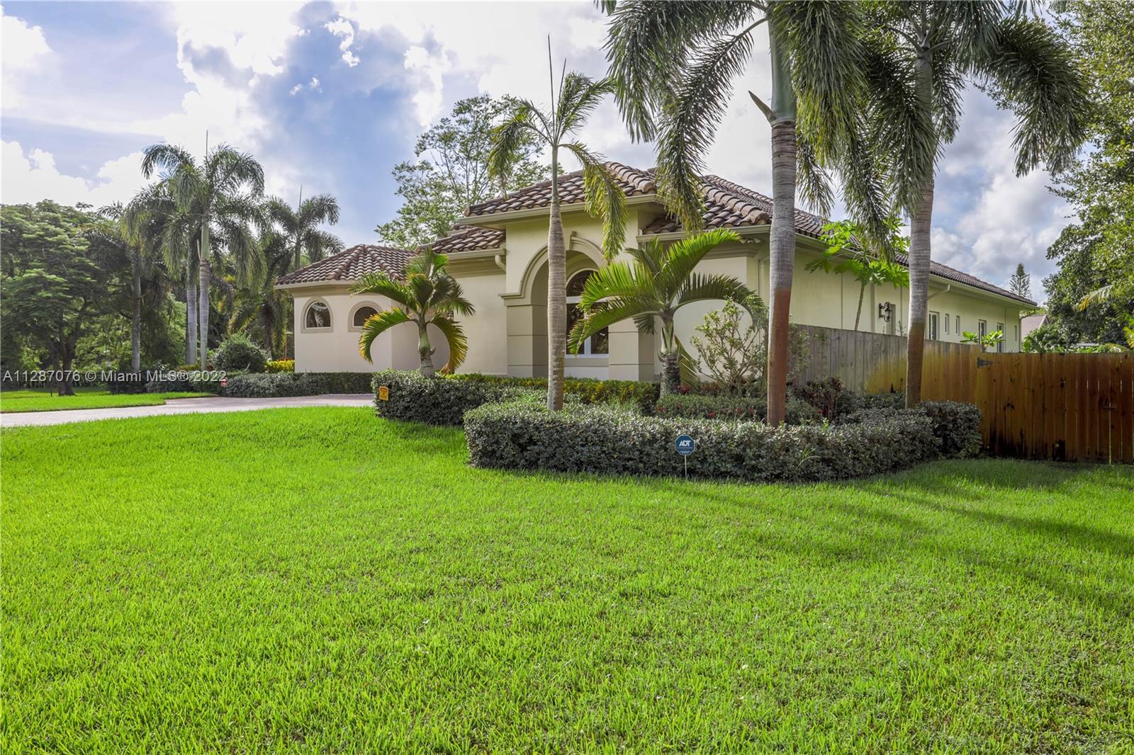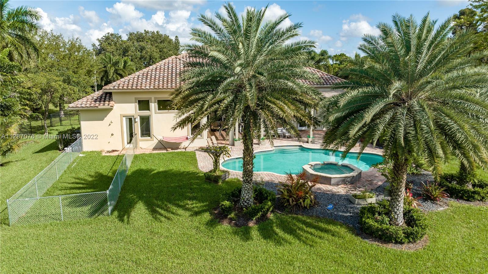 Stunning 2013-built single story 5 Bed / 4.5 Bath, 3-car extra deep garage with just under 40,000 sq ft of land in Plantation Acres. 14’ ceilings, marble floors in living areas, wood floors in bedrooms + den, large impact custom windows allowing lots of natural light, 3 HVAC zones + resort backyard fully fenced in with pergola, covered entertainment space + large heated pool with jacuzzi. Huge master suite with 2 walk-in closets, 2-sink bathrm + jacuzzi. Open floor plan with oversized gourmet kitchen with Thermador Refrig, gas range + marble center island, family room, den, formal dining room + huge living room with wet bar. Many upgrades like new water heater, new HVAC unit + new pool heater. No HOA fee and no restrictions. 2 miles from Sawgrass Mills Mall + all shopping + restaurants.