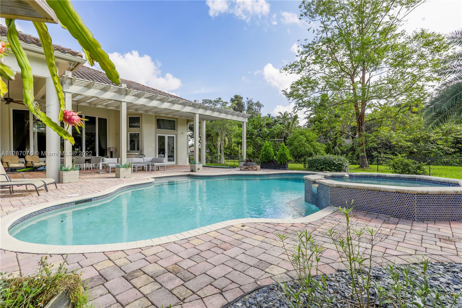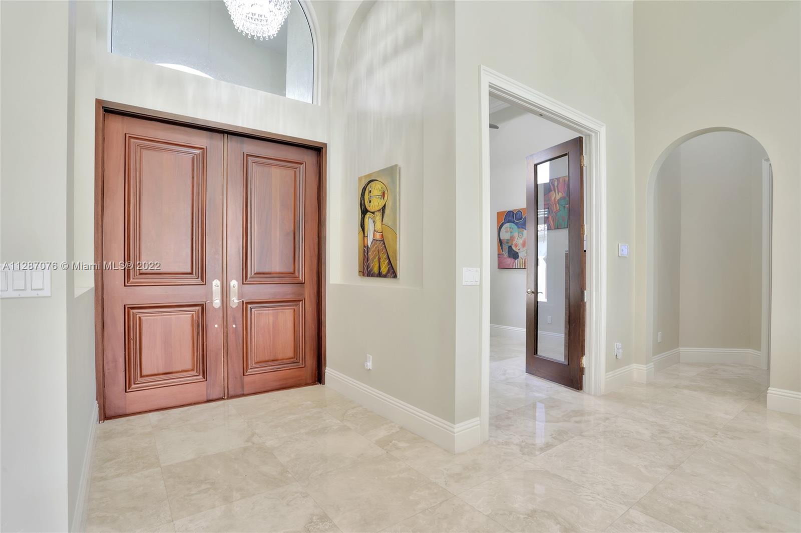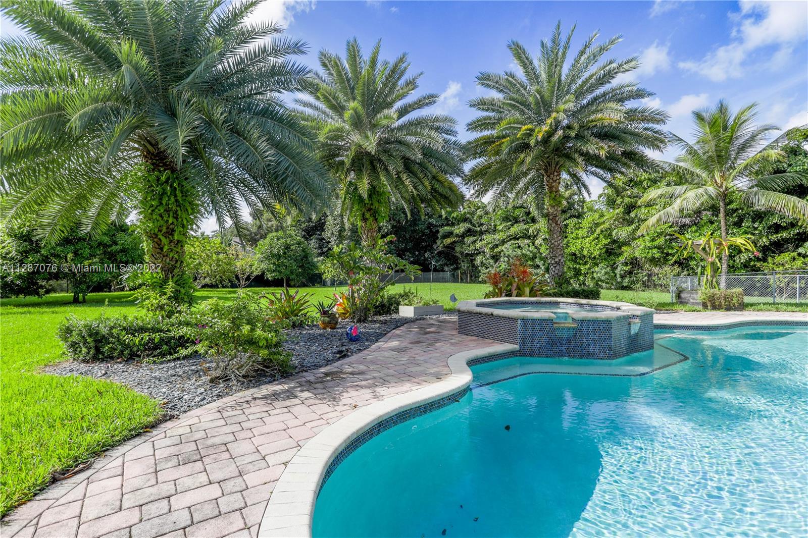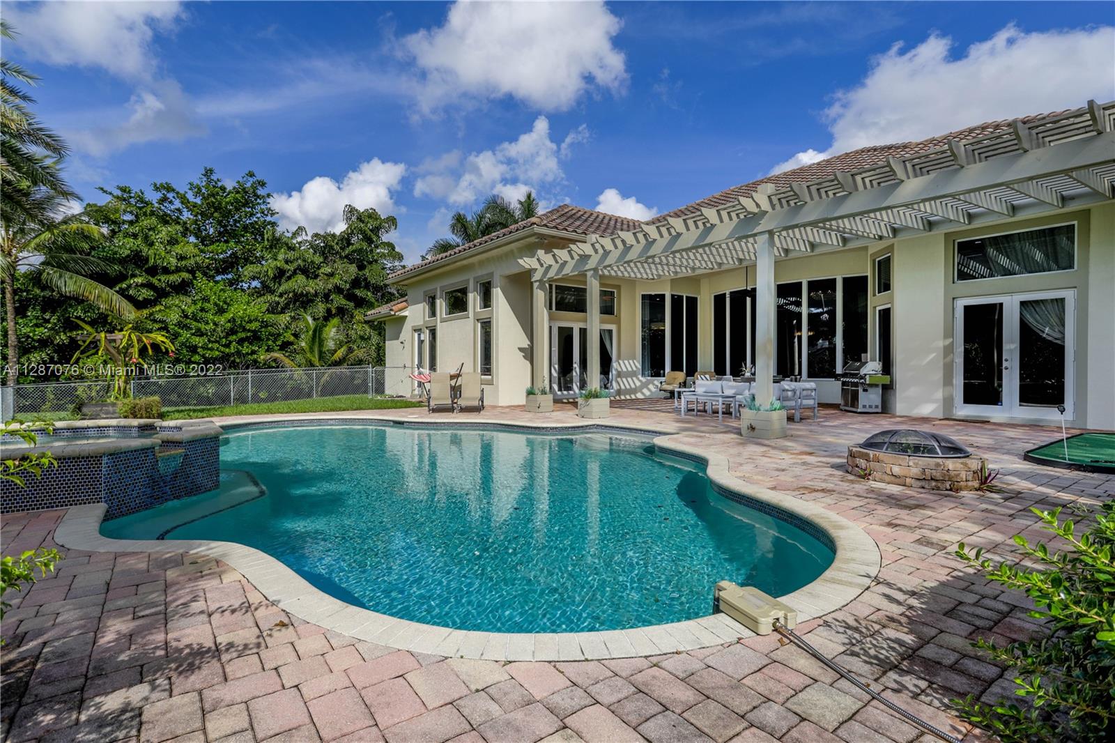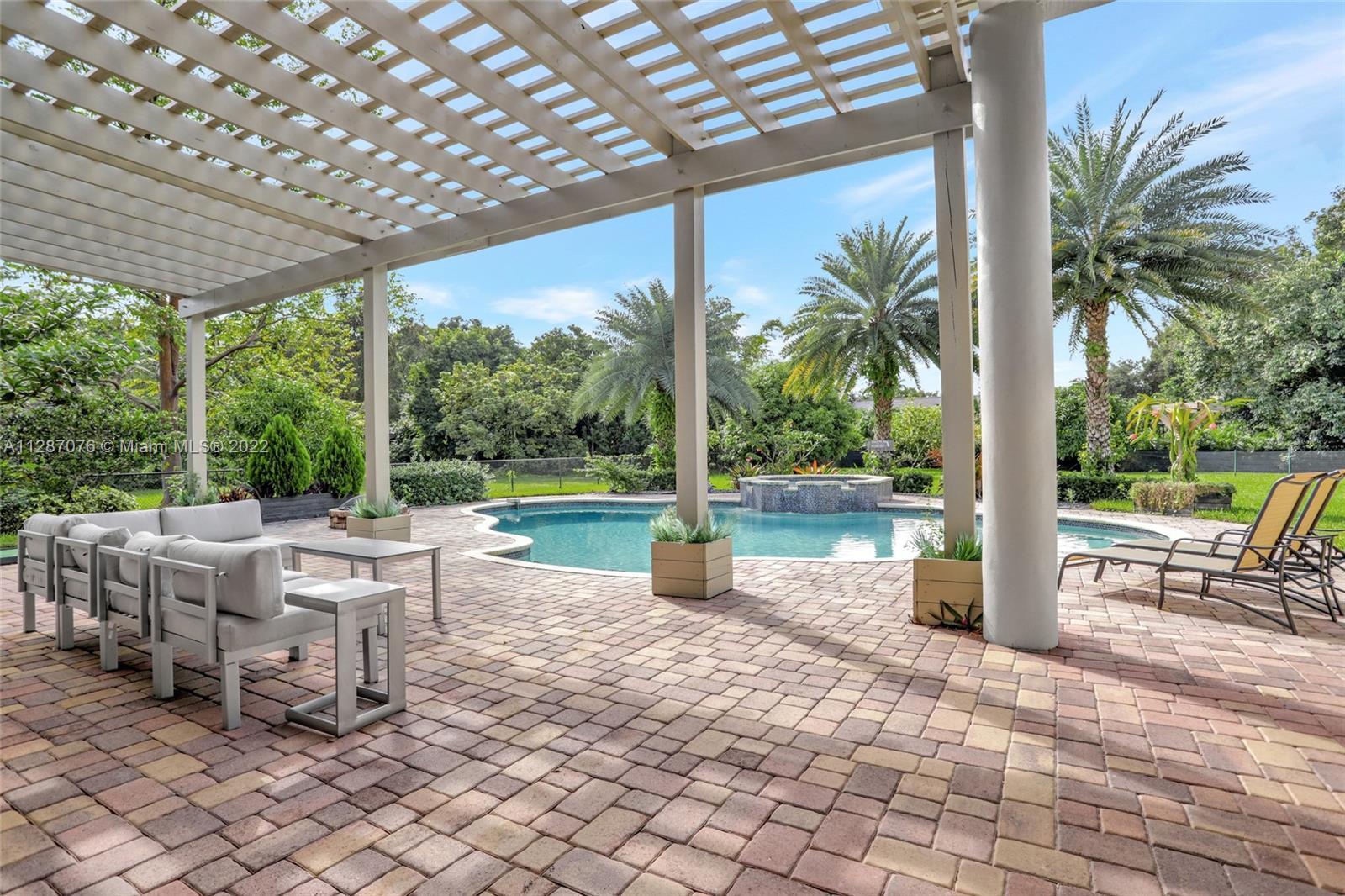 Stunning 2013-built single story 5 Bed / 4.5 Bath, 3-car extra deep garage with just under 40,000 sq ft of land in Plantation Acres. 14’ ceilings, marble floors in living areas, wood floors in bedrooms + den, large impact custom windows allowing lots of natural light, 3 HVAC zones + resort backyard fully fenced in with pergola, covered entertainment space + large heated pool with jacuzzi. Huge master suite with 2 walk-in closets, 2-sink bathrm + jacuzzi. Open floor plan with oversized gourmet kitchen with Thermador Refrig, gas range + marble center island, family room, den, formal dining room + huge living room with wet bar. Many upgrades like new water heater, new HVAC unit + new pool heater. No HOA fee and no restrictions. 2 miles from Sawgrass Mills Mall + all shopping + restaurants.