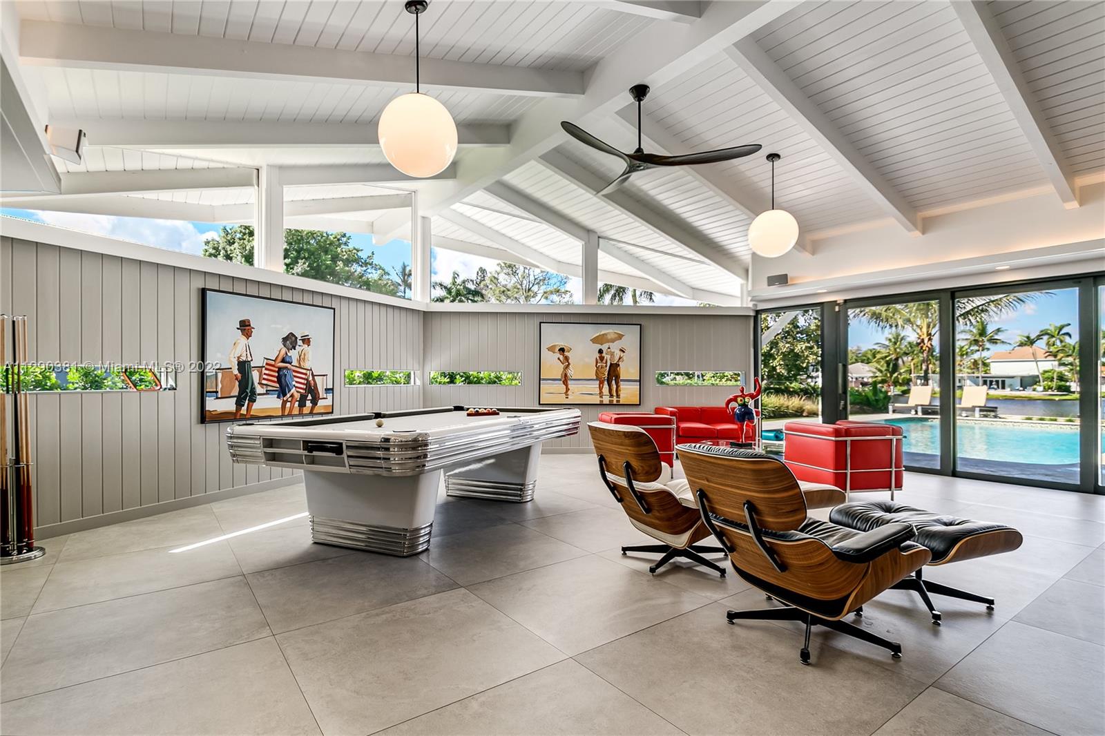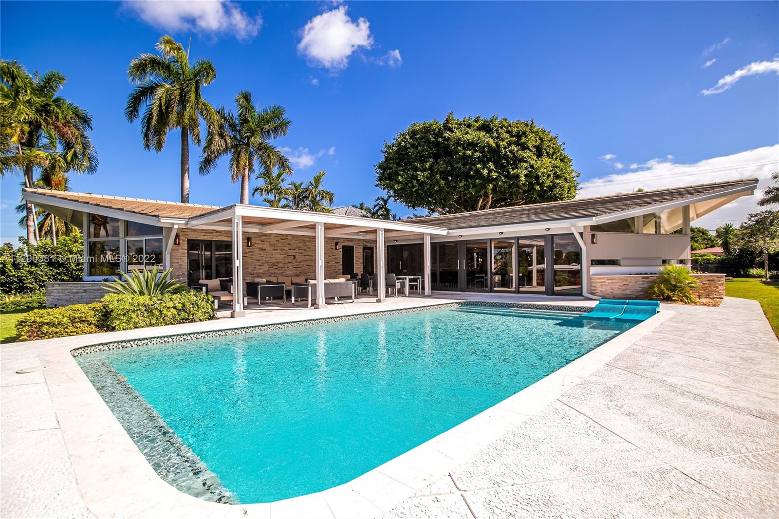 The architects, Dan Duckham & Chester Trowbridge, in 1960, created a stunner related to the work of Frank Lloyd Wright. This single story house features an asymmetrical roofline & vast expanses of glass. Being in the hands of the same family for 58 years, the new owner renovated it entirely & meticulously. High end appliances, impact windows & doors, open kitchen, stacked stones, large Italian porcelain tiles. Superb craftmanship, period appropriate detailing, the continuity of the materials & respect of the original design are what make this minimalist mid century modern renovation so successful. Ground up restoration in 2018-19, 34x17 Deep (7ft+) pool, heated & salt chlorinated, 8 flatscreen Tvs, in/out SONOS system, 19,295 sf lot, Fully furnished w/some Art. SEE BROKERS REMARKS