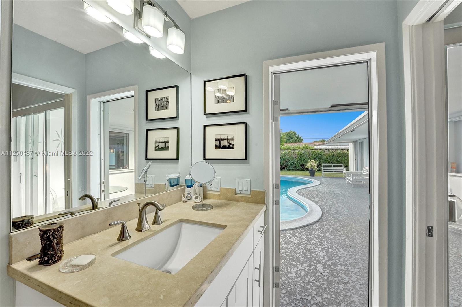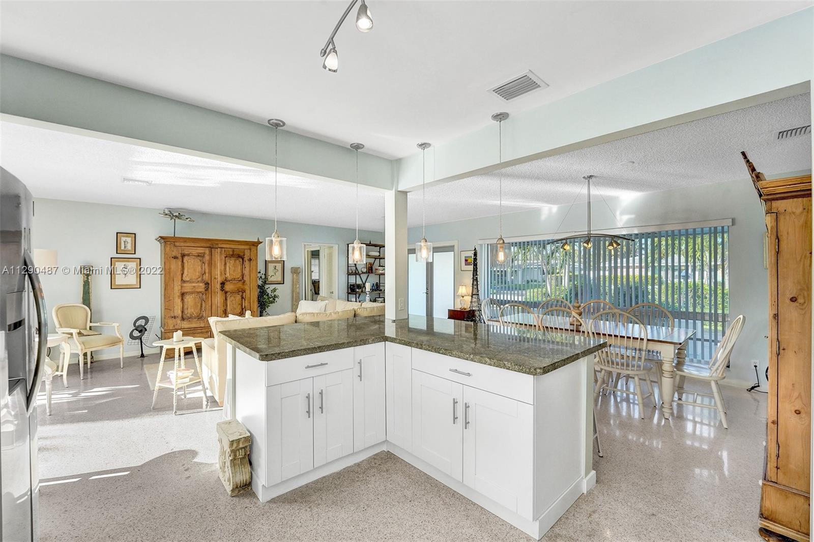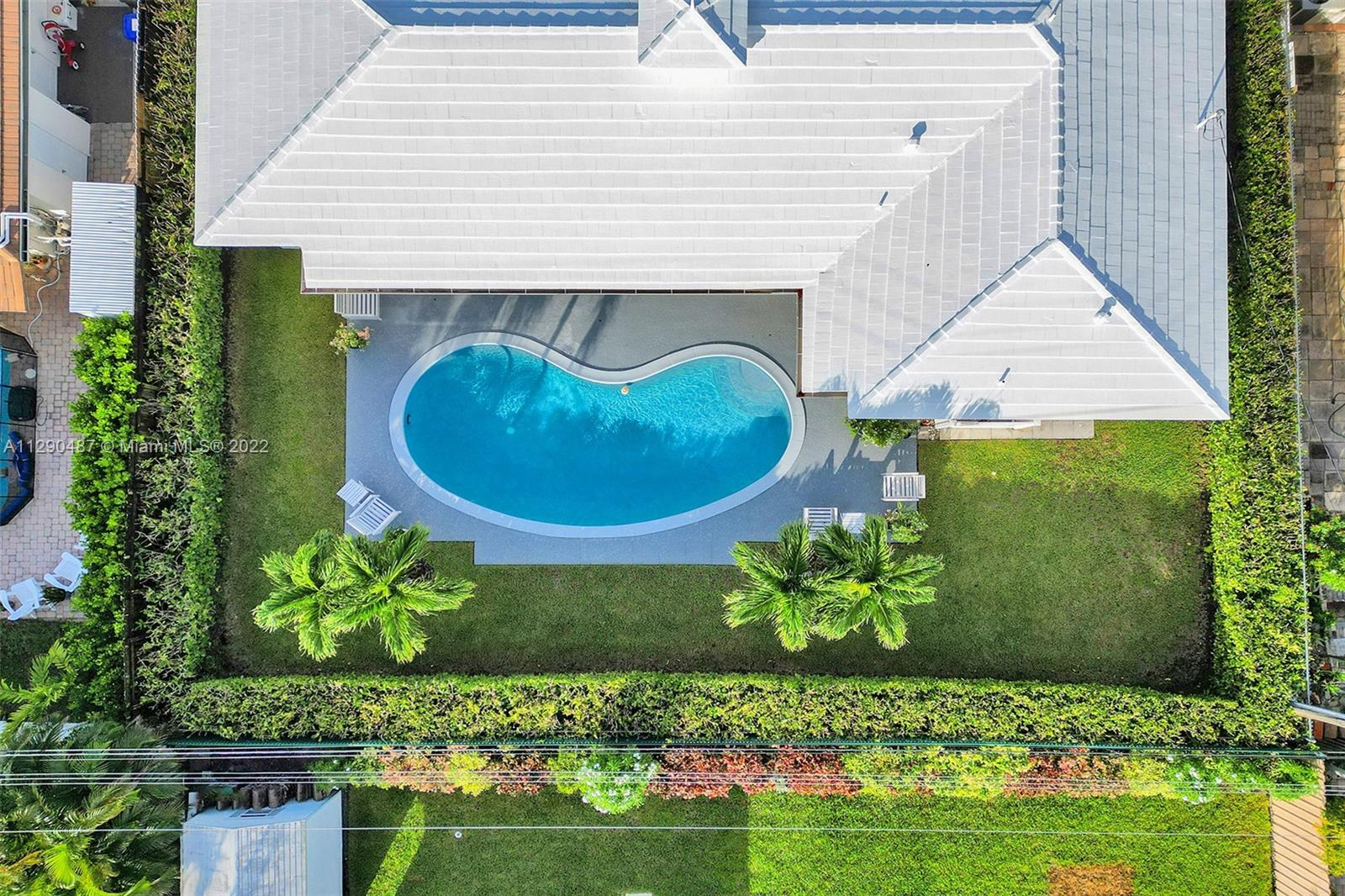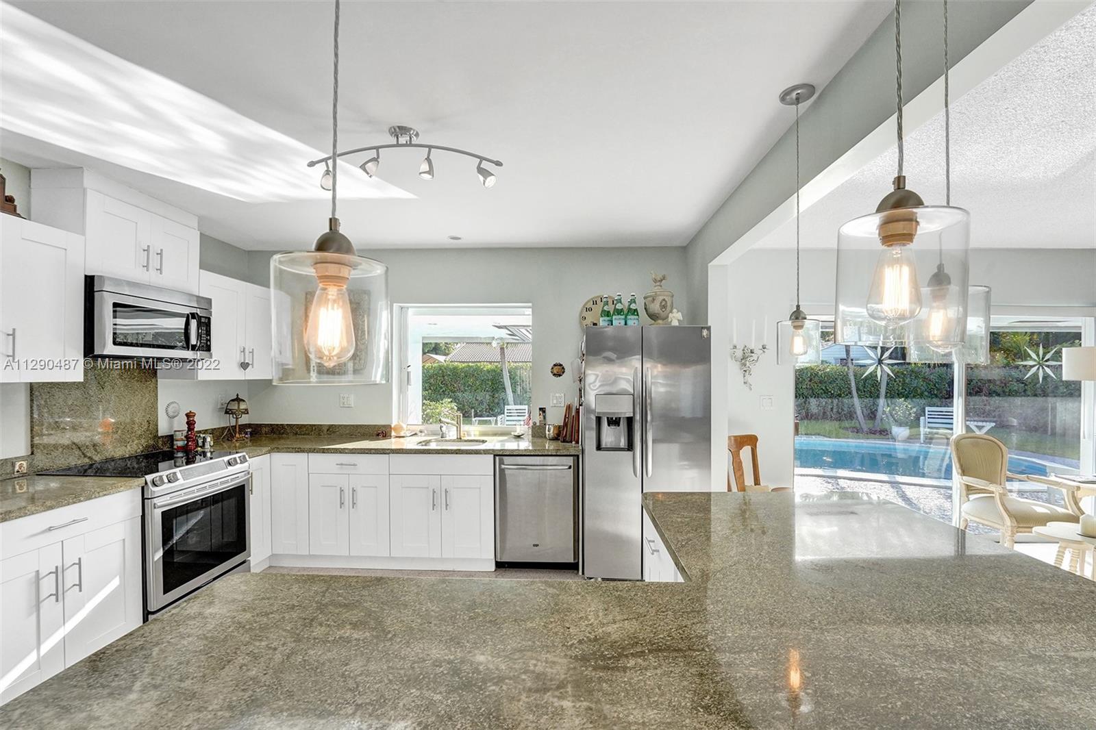 Immaculate 3/2 pool home in move-in condition. Many recent upgrades including white kitchen, SS appliances, granite counter, marble bathroom, glass shower, original gleaming Terrazzo floor, open floor plan w/pool garden view, private master wing with access to pool, walk in closet, guest wing w/private bath, pool access, double closets. Paved circular driveway, sprinklers, professional landscaping ,hurricane shutters, 2 car garage, laundry room, utility room and much more...