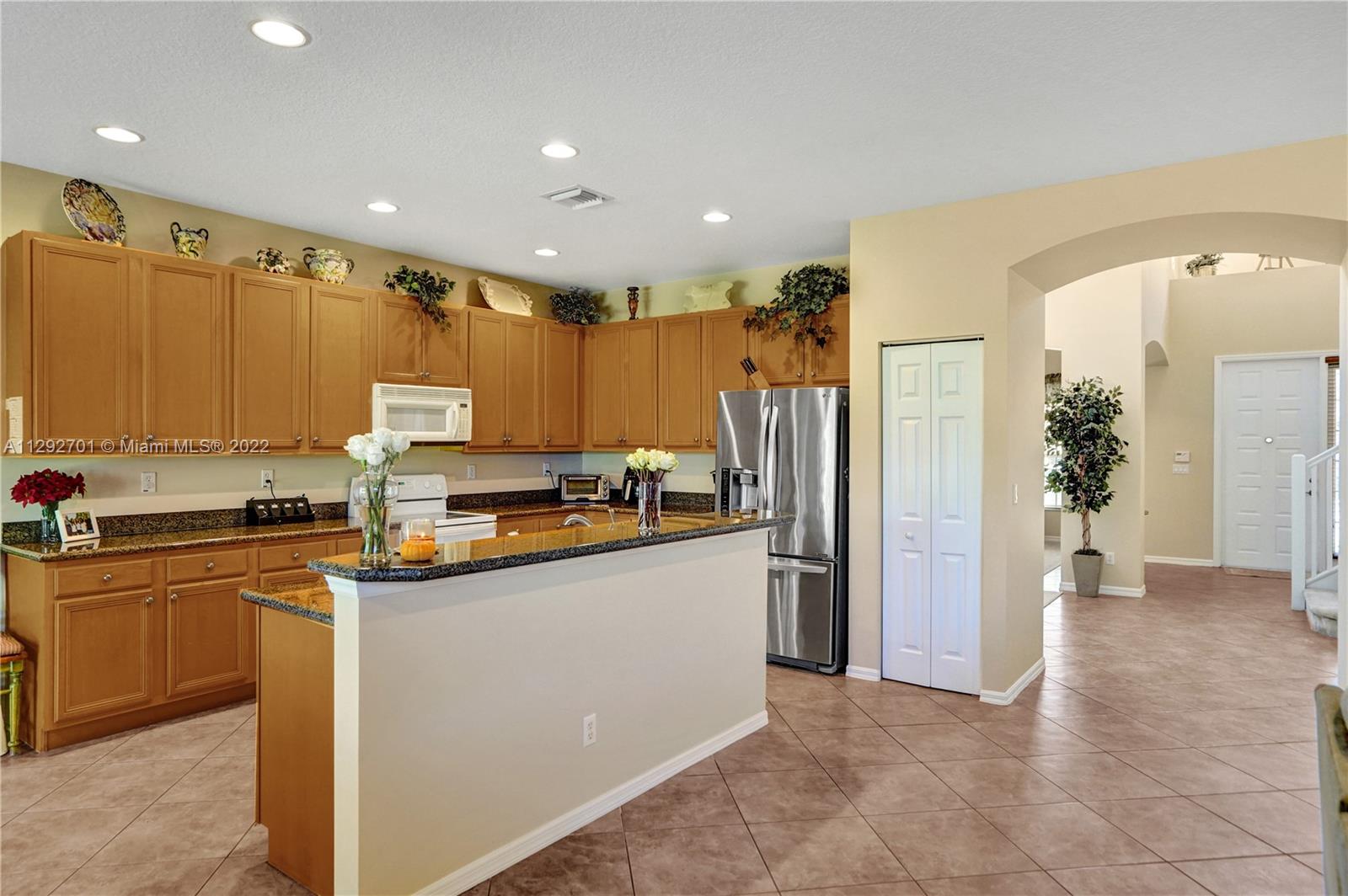 ISLES AT WESTON - Crystal (Model) 5 BR (4 Up. 1 Down). 4 BTH (Full). 3,115 SF (LA). High Ceilings provide Abundant Natural Light throughout Entry, Foyer, Living Room and Dining area. Floor Plan seamlessly transitions to Kitchen and Family Room. Kitchen has Wood Cabinets, Granite Countertops & Island. In-law / Guest BR with Full BTH completes downstairs. Upstairs has Expansive Main BR with 2 Walk-In-Closets. Upstairs includes 3 more BR (1 En Suite. 2 Share Bath) and separate Laundry Room. This house offers room for every purpose and additional separate storage room in garage. Backyard is oversized and completely fenced-in. Isles at Weston is a great community with A+ rated schools, and amenities: Clubhouse, Pool, Gym, Playground and Sport Courts. Cleveland Clinic is a short distance away.