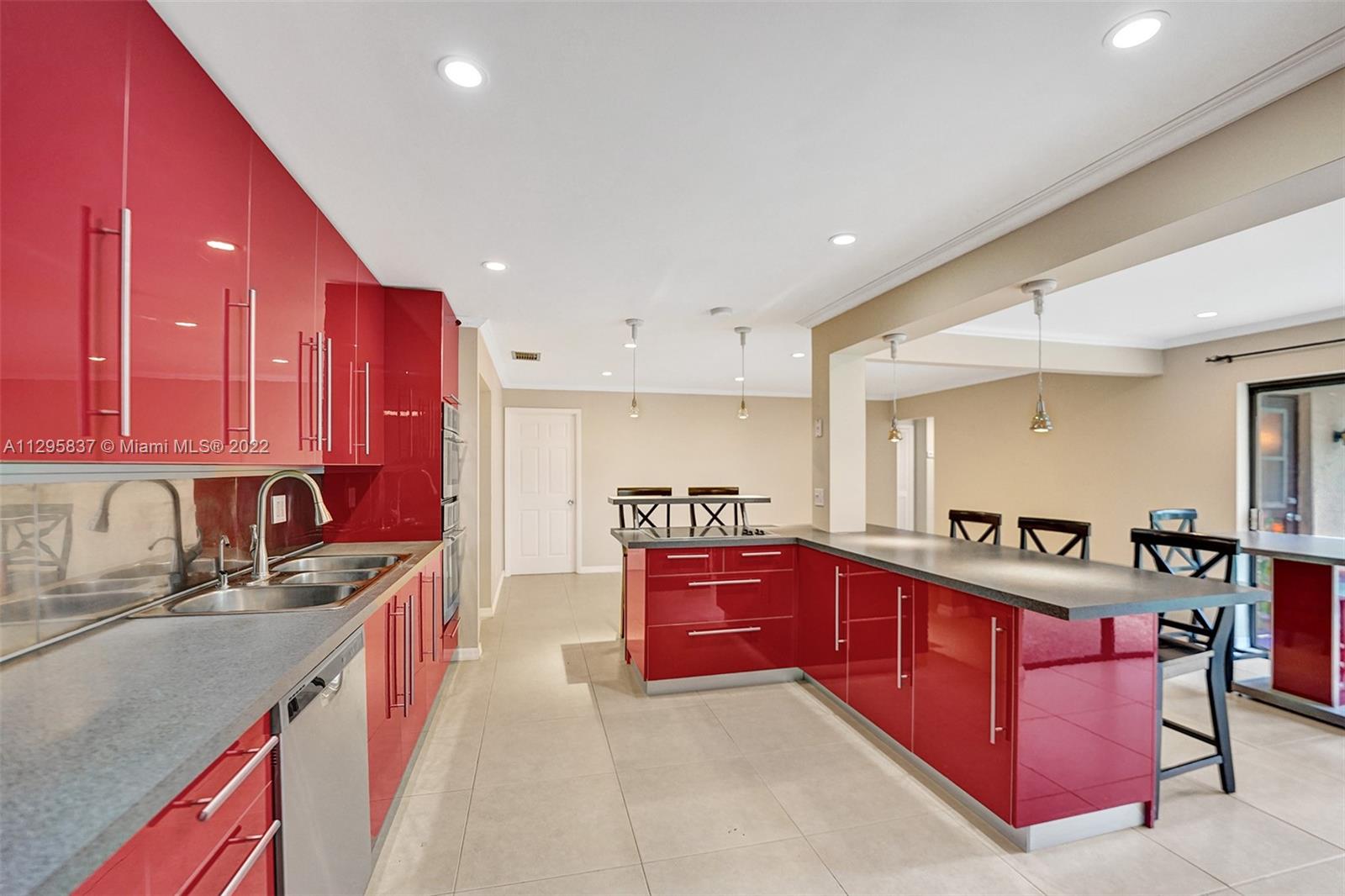 This spacious 4/2 with 2 car garage is located on a LARGE CORNER LOT & features a PEACEFUL SCREENED POOL area with ARCHED CONCRETE WALLS and a CONCRETE PRIVACY FENCE. Beautiful MODERN STYLE KITCHEN with COOKING ISLAND and STAINLESS STEEL APPLIANCES. SPLIT FLOOR PLAN with two living areas with SEPARATE SPACE FOR DINING OR OFFICE. SPACIOUS MASTER BEDROOM with walk-in closet. Master cabana bath has DUAL SINKS and a LARGE TUB/SHOWER. Guest bedrooms share a BIG CABANA BATHROOM. Kitchen and baths have RECESSED LIGHTING. FRESHLY PAINTED inside. TILE AND NEW WOOD LAMINATE FLOORS THROUGHOUT. INDOOR UTILITY/LAUNDRY ROOM WITH SINK and plenty of storage.