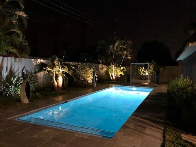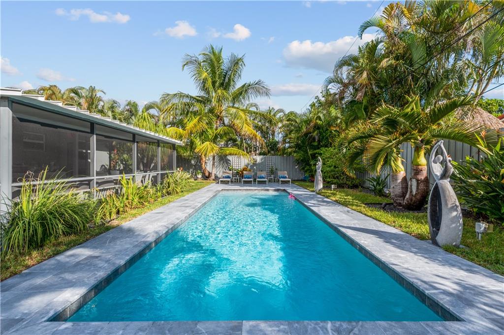 This property is a gem! It features 3 bedrooms, 2 bathrooms, a heated salt water pool and fully fenced gorgeous private tropical oasis backyard with an abundance of tropical foliage, to include a cabaña. Spacious screened patio with couch and firepit. New roof 2021. AC 2018. Pool 2019. Impact Windows. New wood flooring, Kitchen and bathroom 2019. Circular driveway. Outdoor Storage Room. No HOA! Could be an income generating property - Vacation rental / AirBnb. Third bedroom features a separate entrance, Ensuite bathroom and walk-in closet! Beach is only 1.6 miles away! Great location nearby dining, shopping, schools and much more! This property is a Must See!