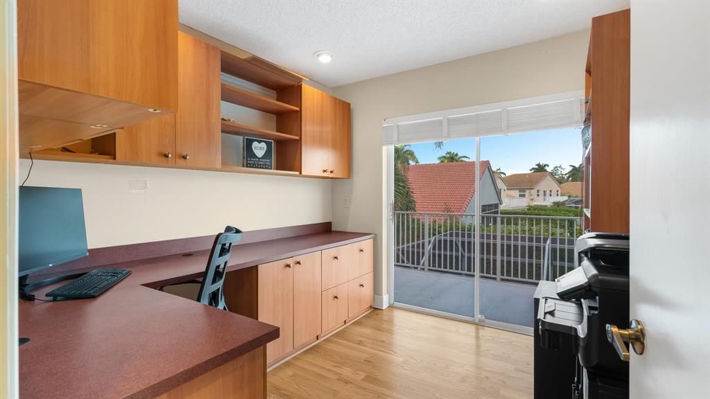 Two story home with Long Lake views in West Boca's well sought after Boca Isles North. Beautifully maintained community with manned gate. 4 bedrooms, 3 bathrooms + 2 additional bonus rooms currently set up as a fitness room and office (Possible 5+ bed house) Lake views from balcony, backyard, family room & updated kitchen. Screened patio & fenced in yard. Marble floors. Massive chefs kitchen boasting floor to ceiling custom wood cabinets; pull outs, double wall-oven, thick granite counters & stainless steel appliances. Spacious custom closets. Master has walk-inslarge California walk-in closet. Renovated bathrooms & hardwood floors throughout upstairs. Boca Isles HOA includes; clubhouse, tennis, fitness, pool, billiards, community rooms, tot-lot, TV/Internet. Zoned for A rated schools.
