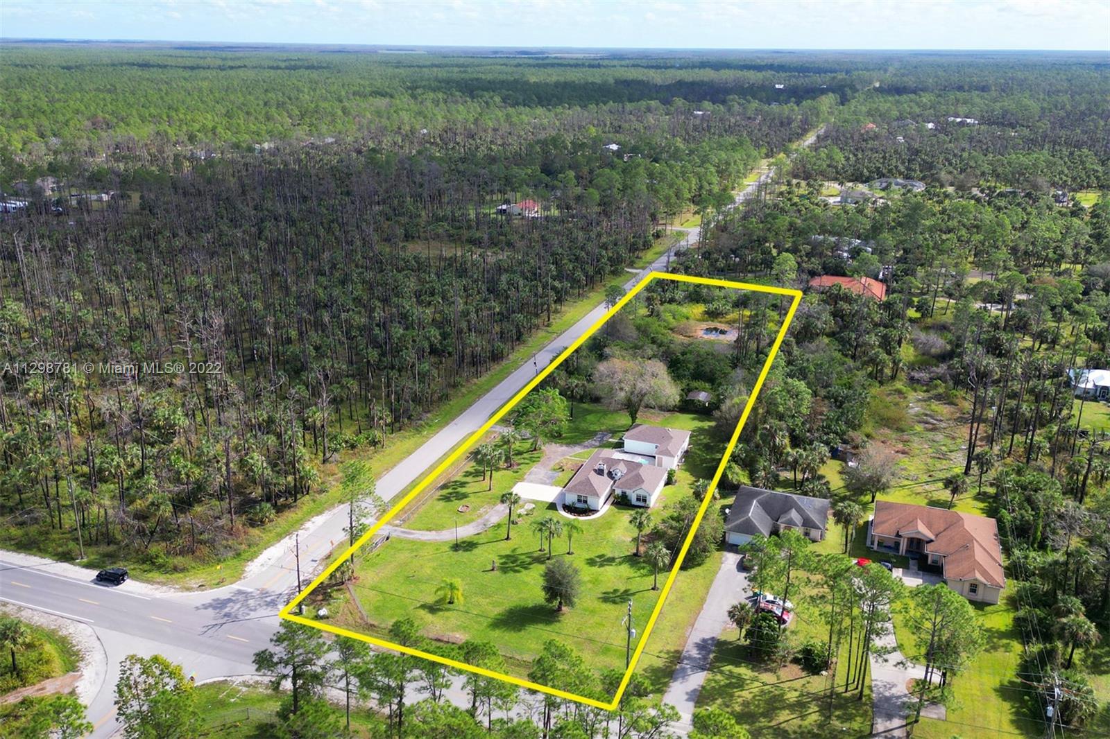 This is a true safe haven in beautiful Naples, Florida! This lovely home sits on a spacious 2.81-acre corner lot and offers the luxury of privacy with the extended front yard that leads to the main entrance, slightly tucked away from the 7+ car driveway. This home is truly a hard-to-find rare and spacious home. This comfortable estate home accommodates for large gatherings with two entrances with ample parking, just a short 5-minute driving distance to a shopping plaza. This comfortable home features a main house and guest suite with a pool and deck space positioned in between. The main suite features 3 bedrooms 2 bathrooms and a den while the smaller suite offers 3 bedrooms and 1 bathroom with the addition of 1 car garage/storage space in back yard.