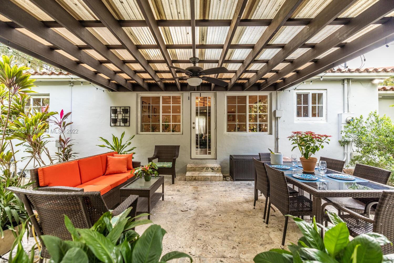 Welcome to Casa De Las Flores! Enjoy great indoor-outdoor living in this updated Miami Shores natural-light filled 3 bedroom plus 2 updated bath home with lush, floral entertainment gardens. Bright, extended flex-living with lovely wood floors lead to a delicious updated kitchen and window-lined dining, both with striking Instagram-ready Iberian tiles opening to a magical private backyard oasis with pollinator plants and flowers that attract butterflies and singing birds—you’ll feel like you’re in your own Tulum-style oasis! With a fabulous pergola and so much lush tropical space, these gardens are perfect for relaxing or entertaining. You’ll rest easy with all impact windows and doors, and you’ll appreciate the tucked away location on a quiet cul-de-sac. Come bloom at Casa De Las Flores!
