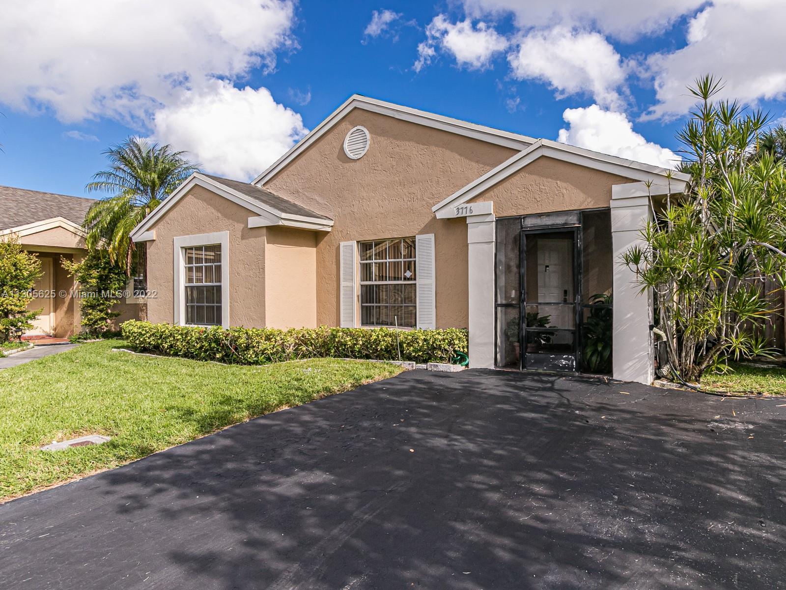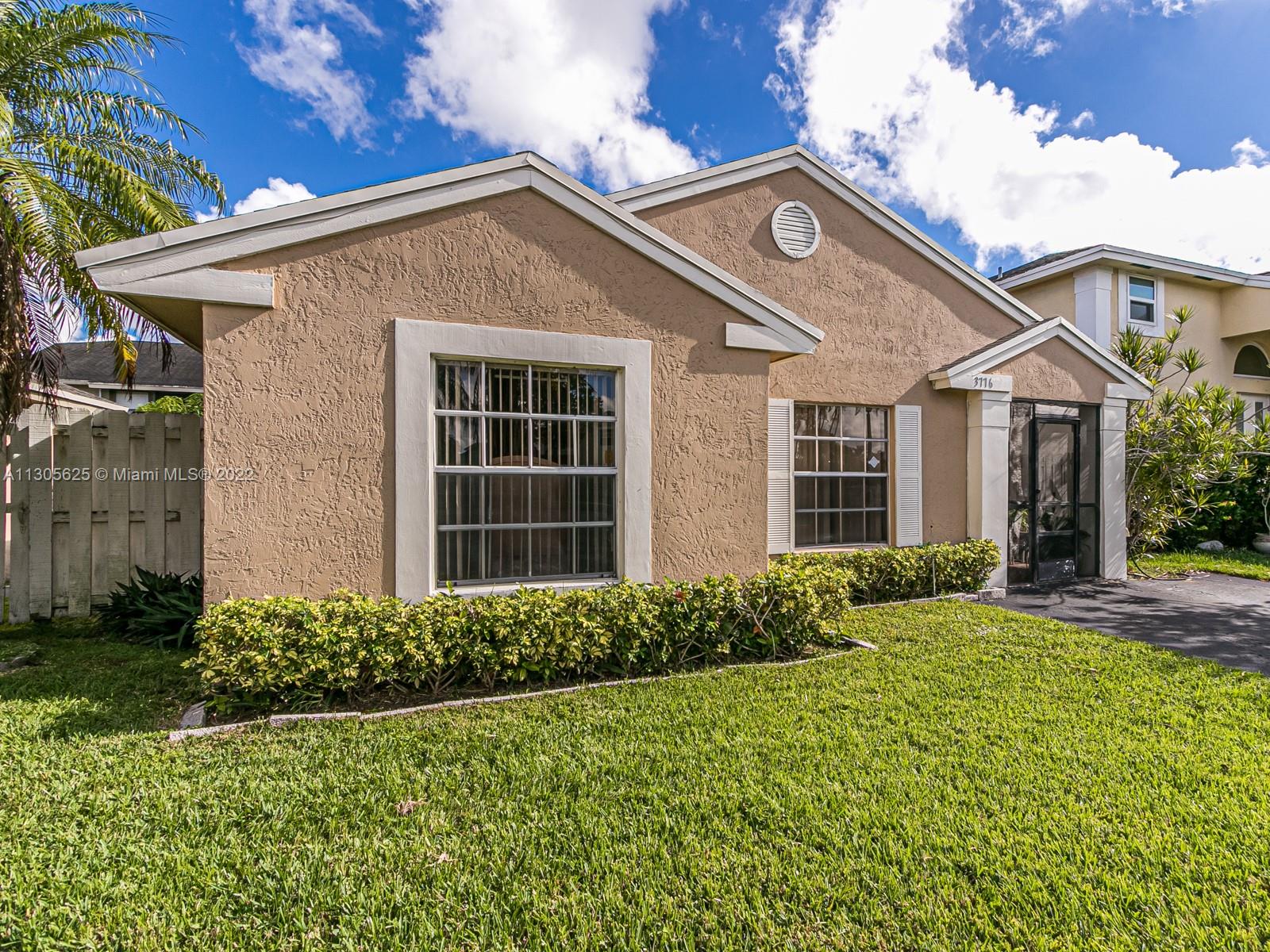 Single family three bedroom two bathroom home within the City of sunrise. Wood flooring in bedrooms and tile flooring all other living areas. Split bedrooms - Master suite offers large walk-in closet. Two screened patios, one just off the dinning area and second one off the living room. Interior laundry room, ample storage. Water filtration system. Square footage larger than tax roll Fenced backyard with some fruit trees. Only one owner. Great with easy access to Sawgrass, I-595 and local schools. Easy access to Sawgrass Mills mall and FLA Live Arena. Maintained community, offering community pool. Low association fees