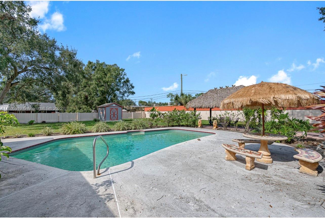 BEAUTIFUL HOME READY TO MOVE IN! THIS 5BED/2BATH SPACIOUS HOME IS PERFECT FOR FAMILY AND ENTERTAINING. TASTEFULLY REMODELED IN 2020. NEW ROOF, NEW PAINT, SHED, REPLACEMENT OF FILTERS FOR WATER FILTRATION (2022), NEW WINDOW TRIMS AND COLUMNS, NEW GUTTERS, NEW FRONT DOOR, FRENCH DOOR IN THE BACK, POOL, REDONE TIKI HUT & TIKI BAR, NEW 5 TON A/C HANDLER AND COMPRESSOR (2022)SUMMER KITCHEN WITH SCREENED IN LANAI. KITCHEN IS SPACIOUS AND REMODELED IN 2020, QUARTZ/MONET COUNTER TOPS.