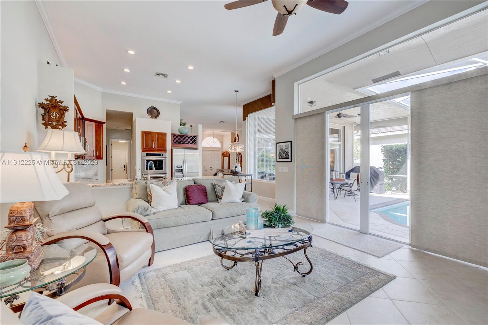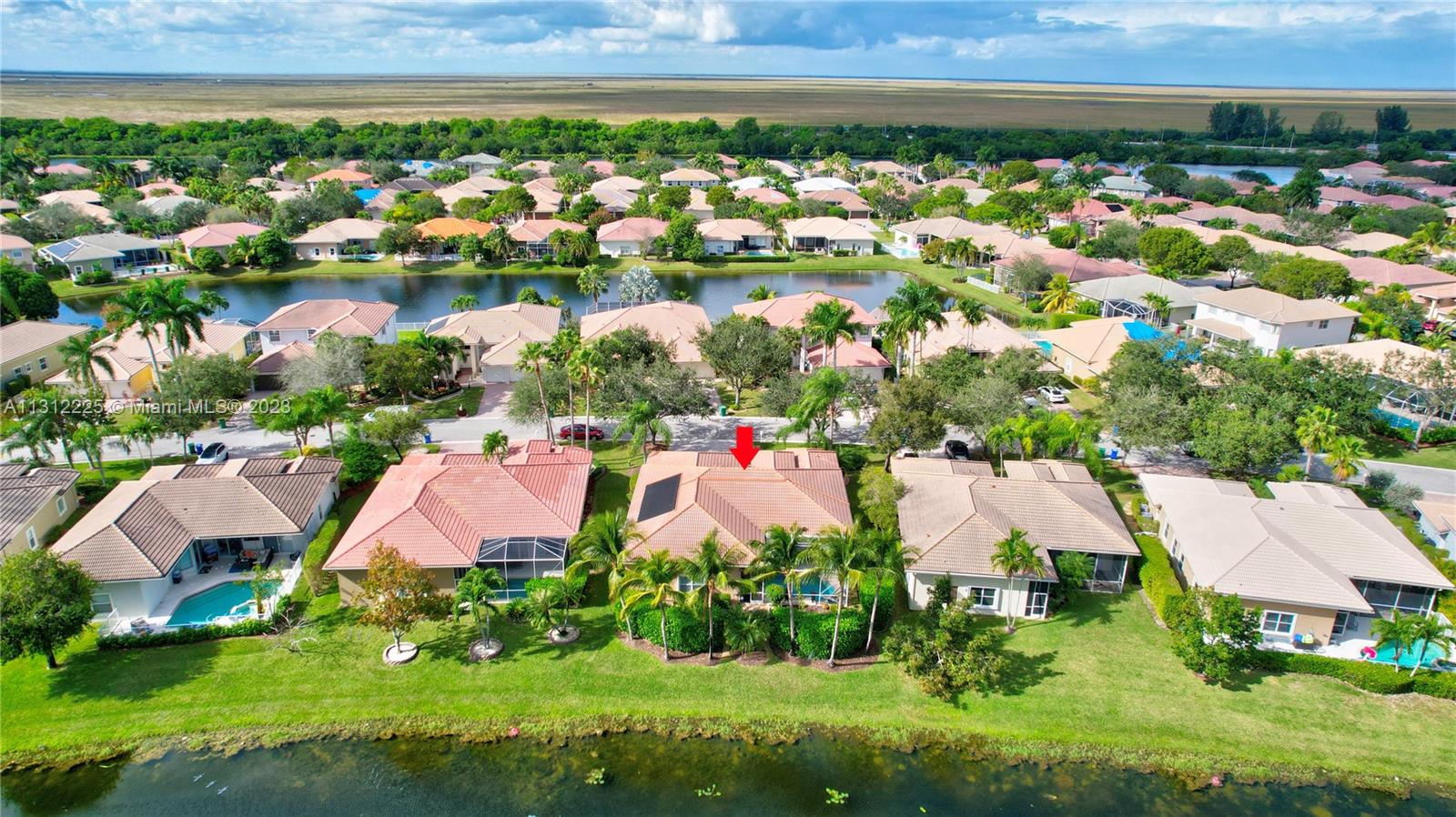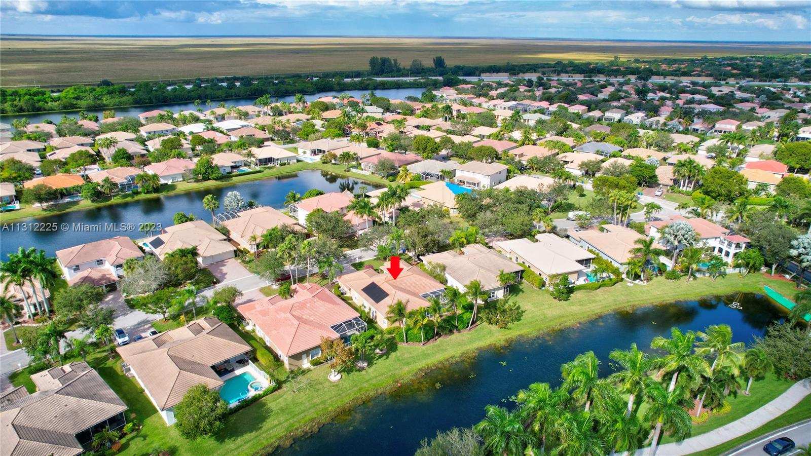 This Amazing Waterfront Home is move in ready and features an open floor plan with 4 Bedrooms, 3 Full Bathrooms, Volume Ceilings, Crown Molding, and plenty of Natural Light. The kitchen has custom cherry cabinets, granite counter tops, and stainless steel appliances including a double oven and wine cooler. The master suite has a recessed ceiling with a gorgeous chandelier, views patio and heated saltwater pool with waterfall. The master bath with his & hers vanities, tub, and stand alone shower. The home also has a 3 car garage, accordion hurricane shutters, low HOA, great schools, solar panels that heat the pool, and Smart Home features that can be controlled through an app. The A/C units are 2020 and 2021. Pelican Isle is gated community located near reastaraunts and shopping centers.