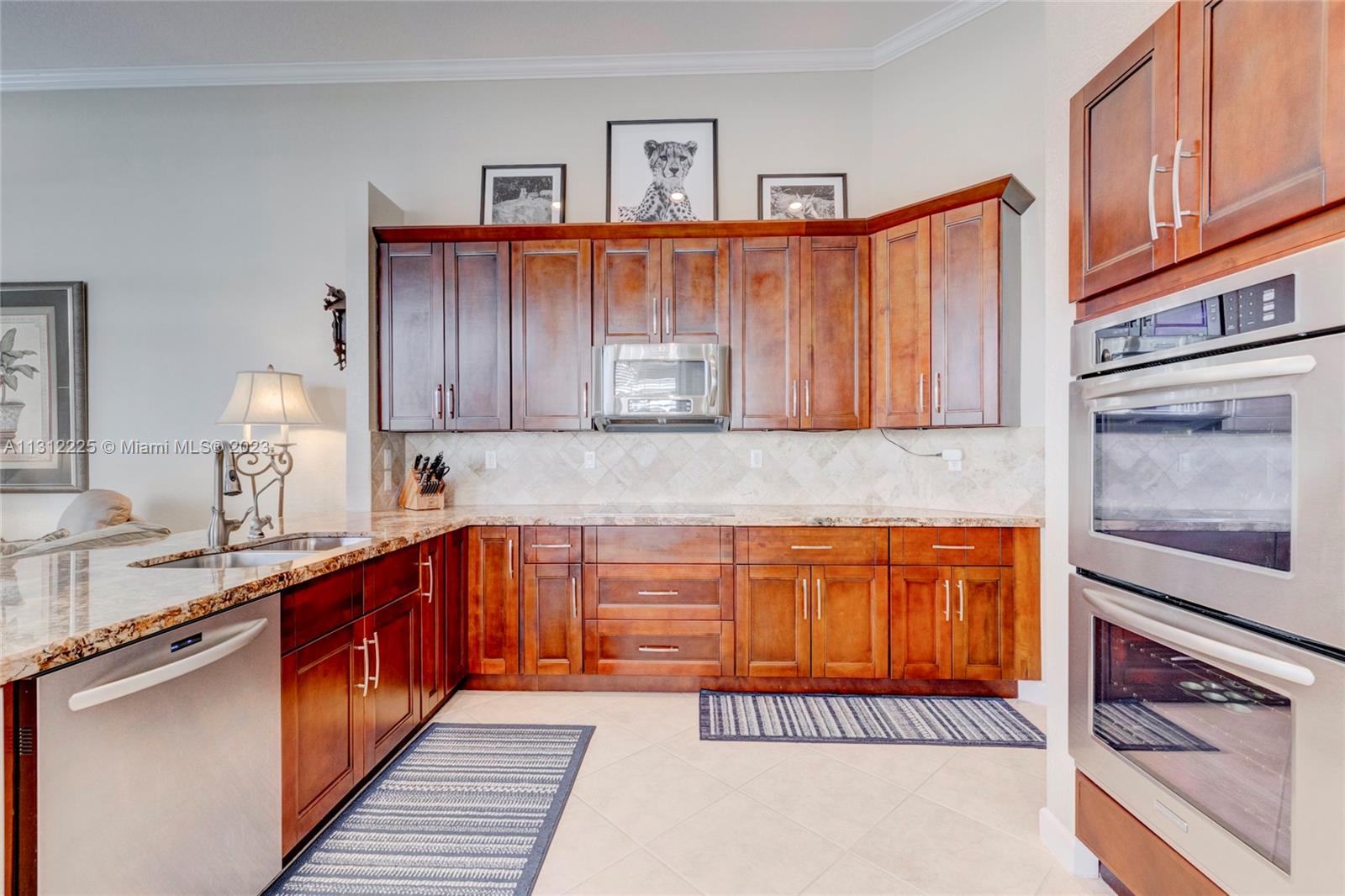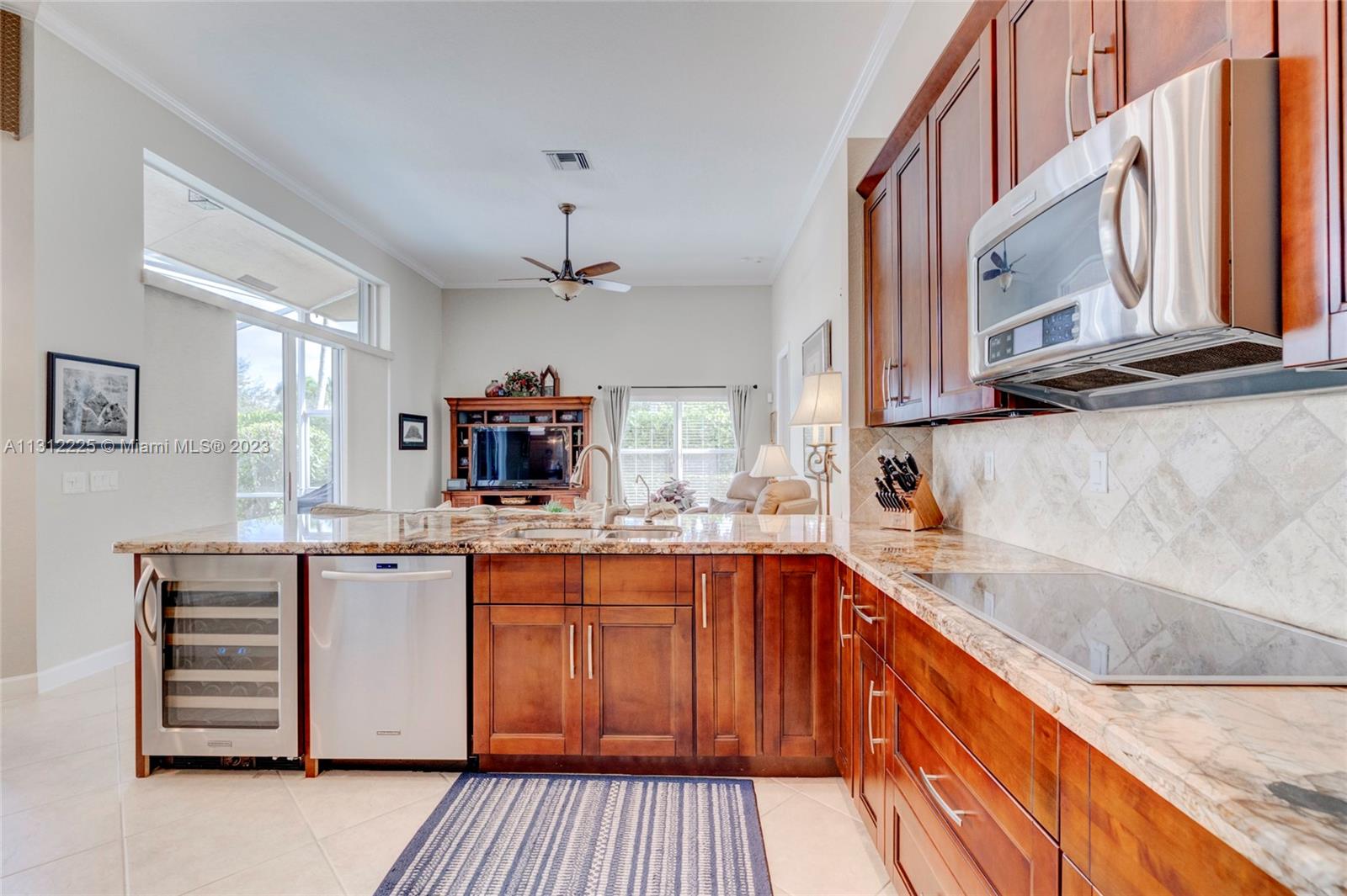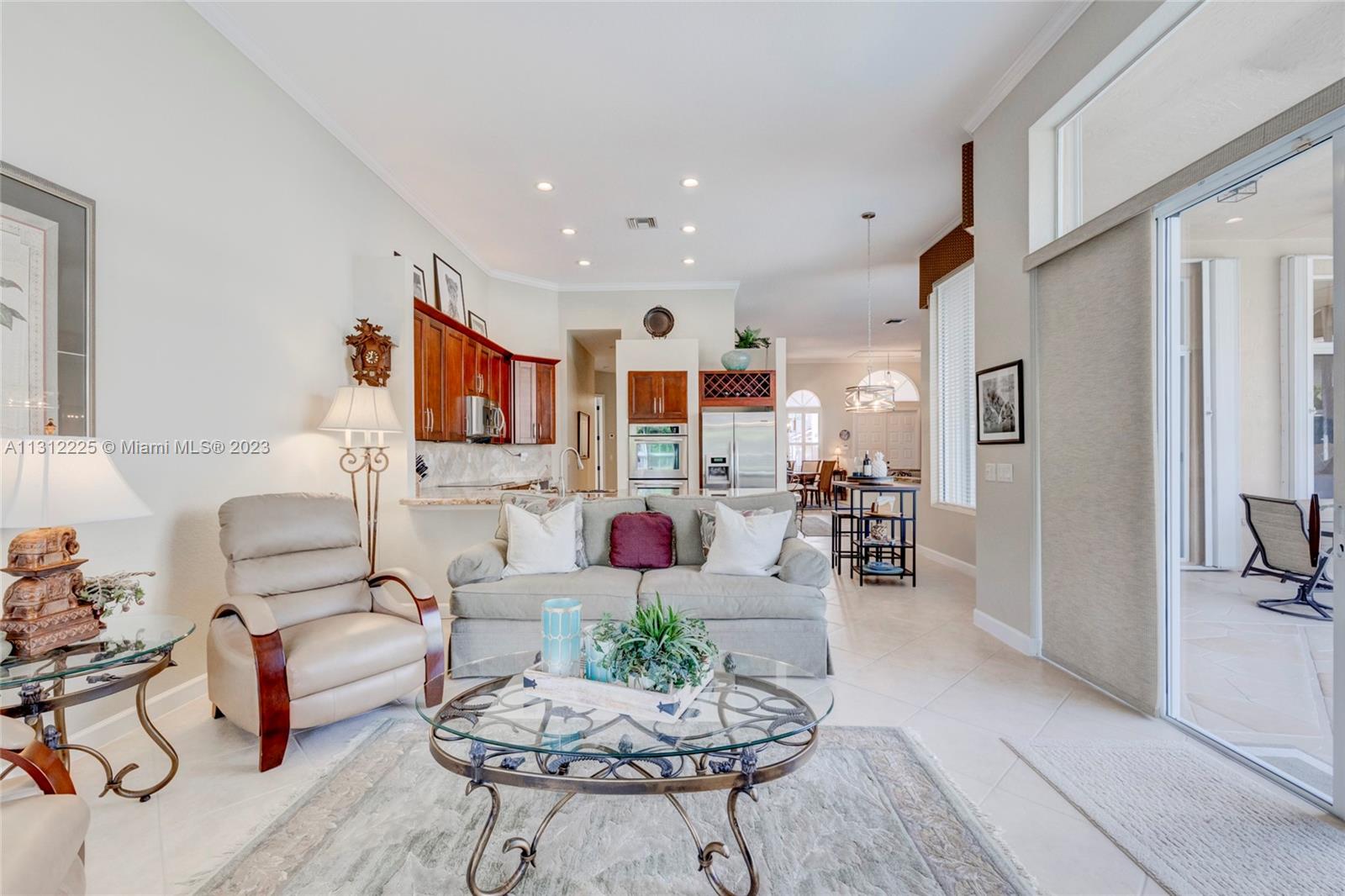 This Amazing Waterfront Home is move in ready and features an open floor plan with 4 Bedrooms, 3 Full Bathrooms, Volume Ceilings, Crown Molding, and plenty of Natural Light. The kitchen has custom cherry cabinets, granite counter tops, and stainless steel appliances including a double oven and wine cooler. The master suite has a recessed ceiling with a gorgeous chandelier, views patio and heated saltwater pool with waterfall. The master bath with his & hers vanities, tub, and stand alone shower. The home also has a 3 car garage, accordion hurricane shutters, low HOA, great schools, solar panels that heat the pool, and Smart Home features that can be controlled through an app. The A/C units are 2020 and 2021. Pelican Isle is gated community located near reastaraunts and shopping centers.