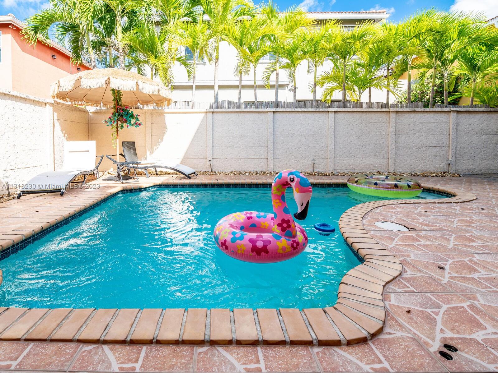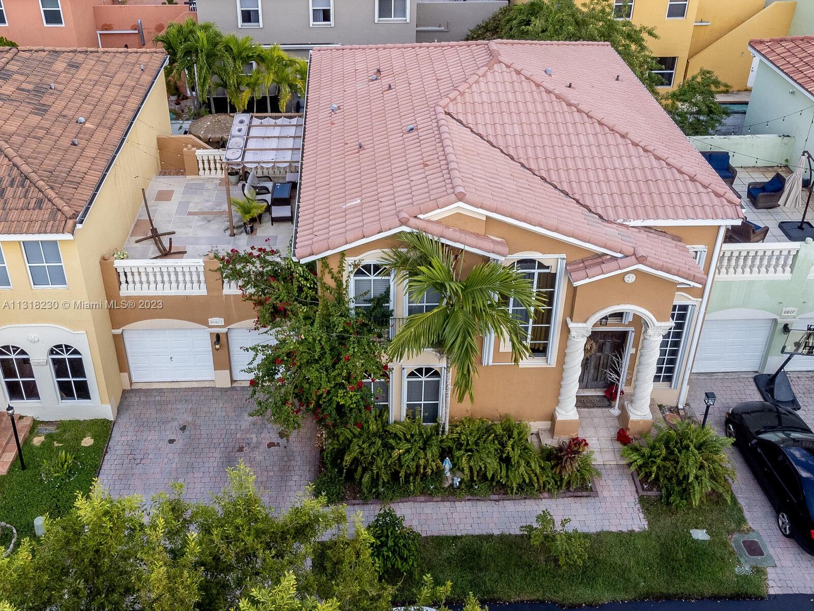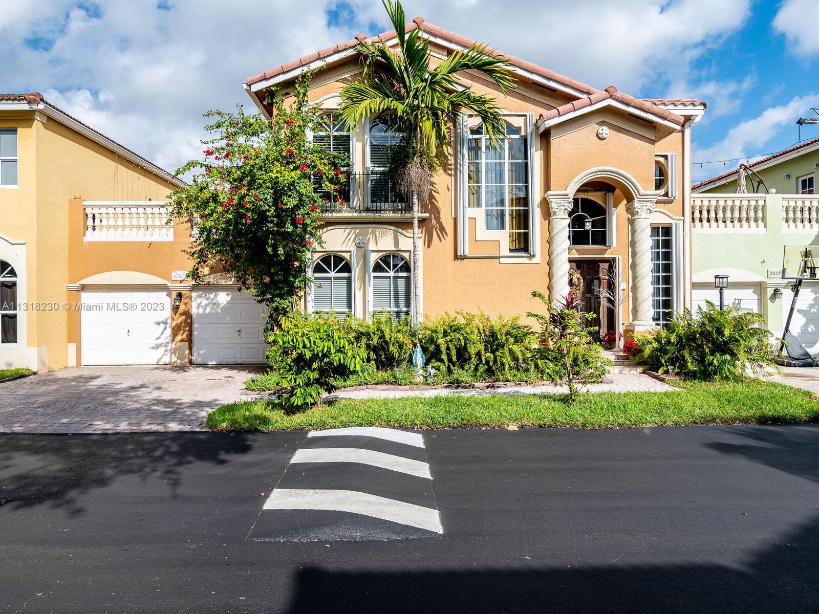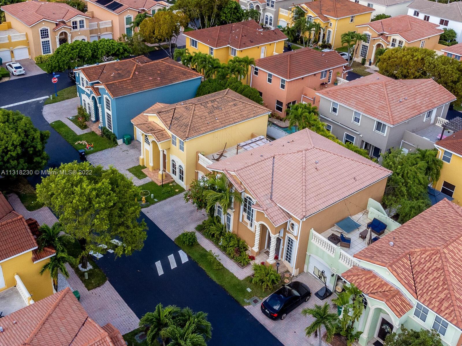 REDUCED...Great Location, Spectacular Mediterranean style. 4BR 3.5 Bath home, formal living and dining room, huge family room, LOFT, roof top terrace/sun deck overlooking the spacious patio and your own in ground POOL. Eat-in kitchen with wood cabinets, granite countertops, and SS appliances, full bedroom and bath downstairs, tile downstairs and wood laminate 2nd floor. Hurricane rated accordion shutters. Large two car garage, Outside shower/cabana bath, low HOA includes gated security, alarm, cable, walking distance to schools, shopping, entertainment, basic cable TV and ADT monitoring included. BACK ON THE MARKET. ROOF NEEDS REPAIR. CASH ONLY. Offer with proof of funds