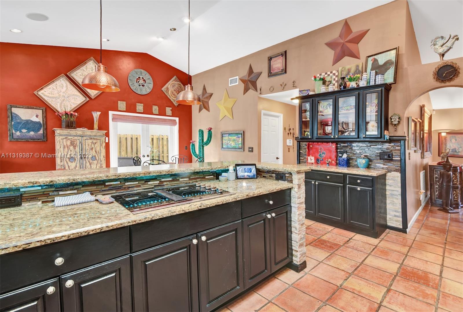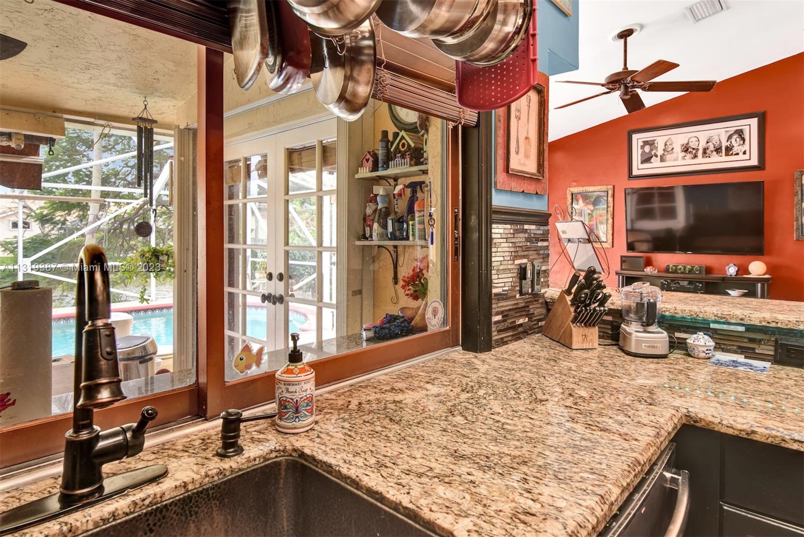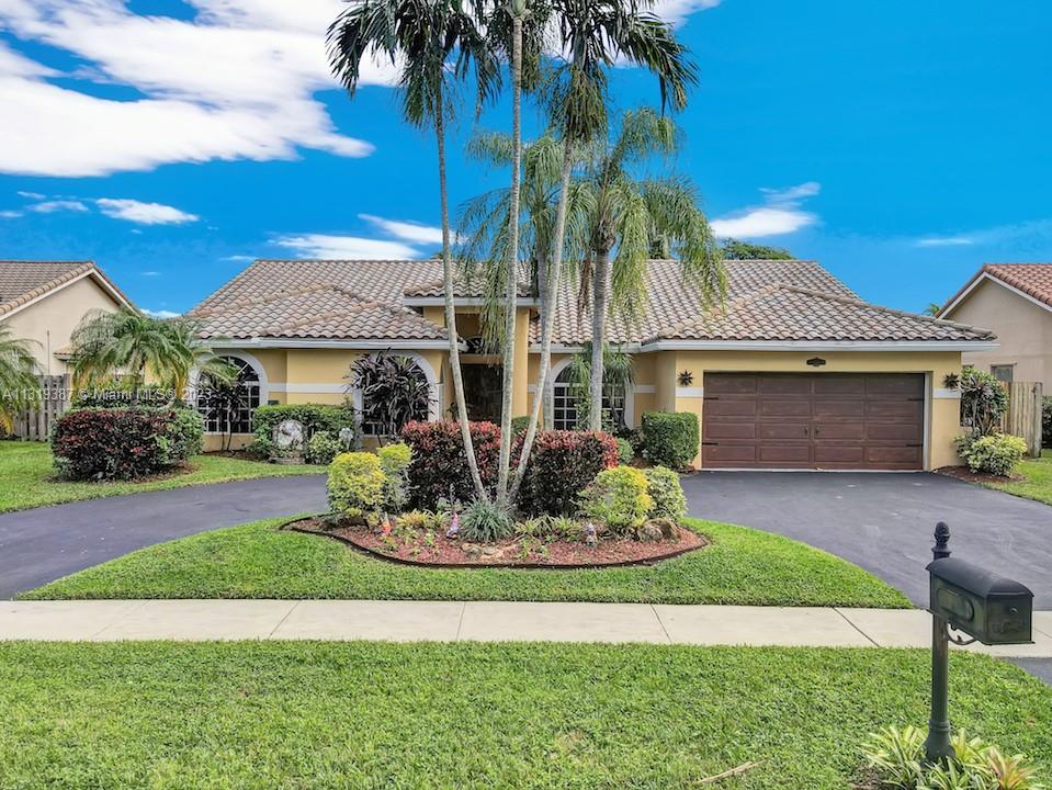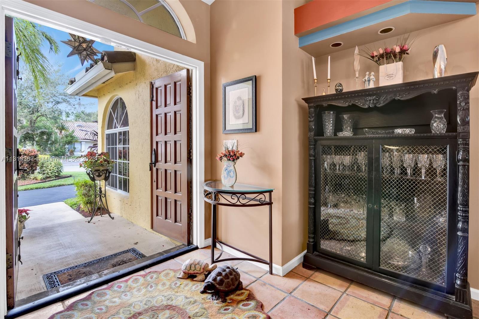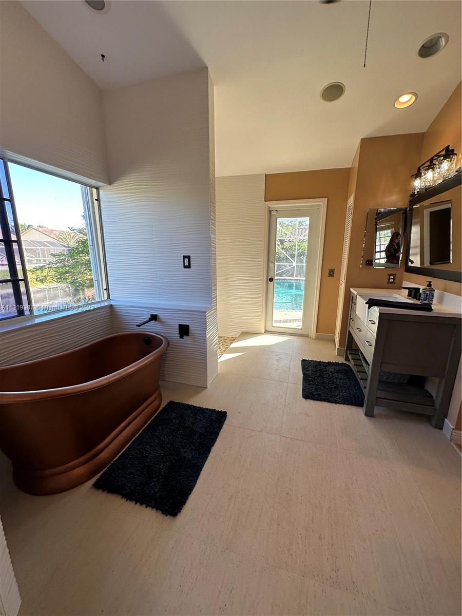 JACARANDA LAKES WATERFRONT WITH POOL. Breathtaking entrance revealing vaulted ceilings and six sets of French doors The lanai screen cage is extra-reinforced above hurricane guidelines. Clay/stone tile and wood floors throughout, Modern-rustic theme, Gigantic kitchen with updated granite counter tops stainless appliances. New bathrooms. Master bath is slamming with textured tile and shimmering copper tub! New roof 2007. Pool resurfaced in 2005. A/C 2013 Hurricane shutters, hurricane-rated garage door/skylight. Wide hallways, wide and generous bathroom space. Dual closets in master bedroom. PLENTY of storage. Home completely wired from the ceiling for all of your A/V needs, high quality professional speakers subwoofers in the ceiling of most rooms and patio. NO RENTAL RESTRICTIONS!