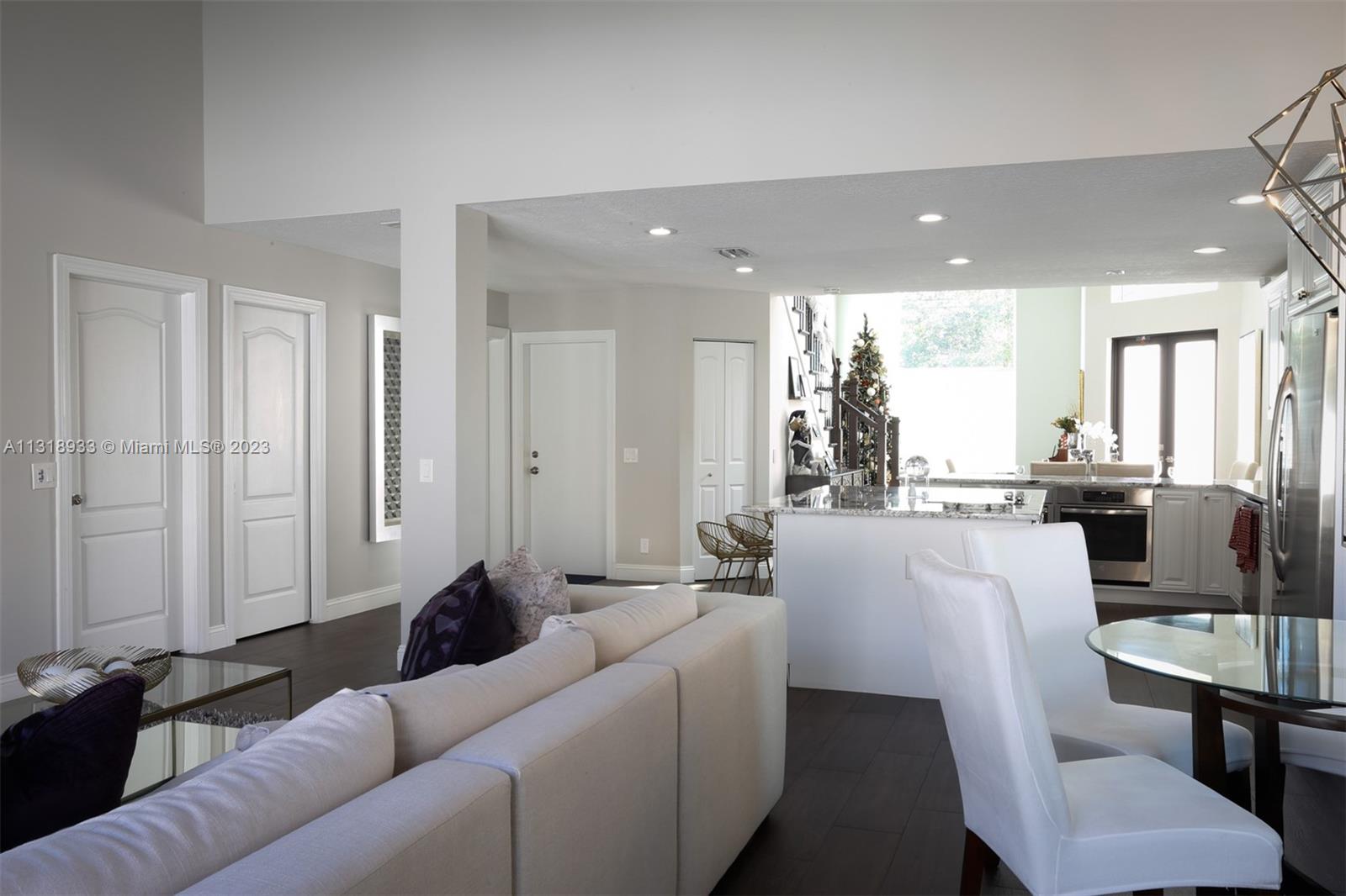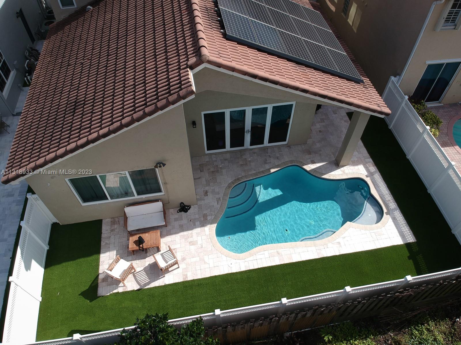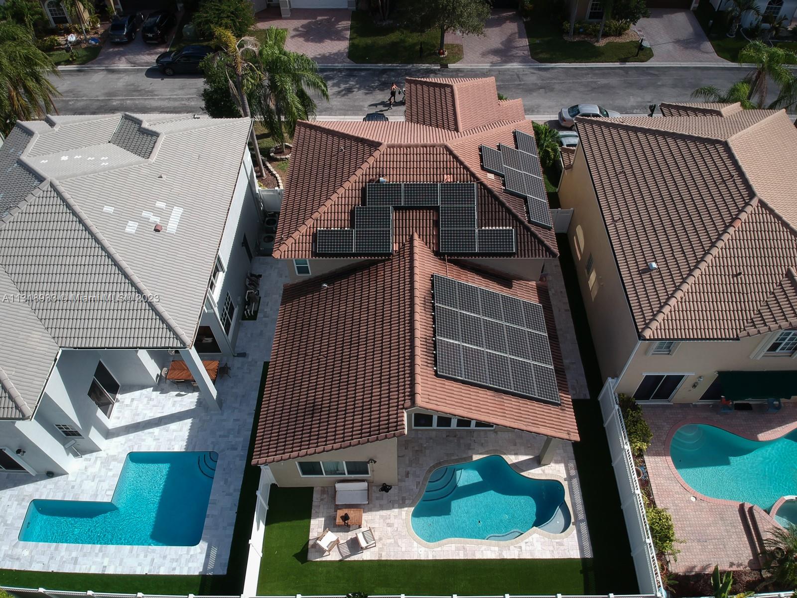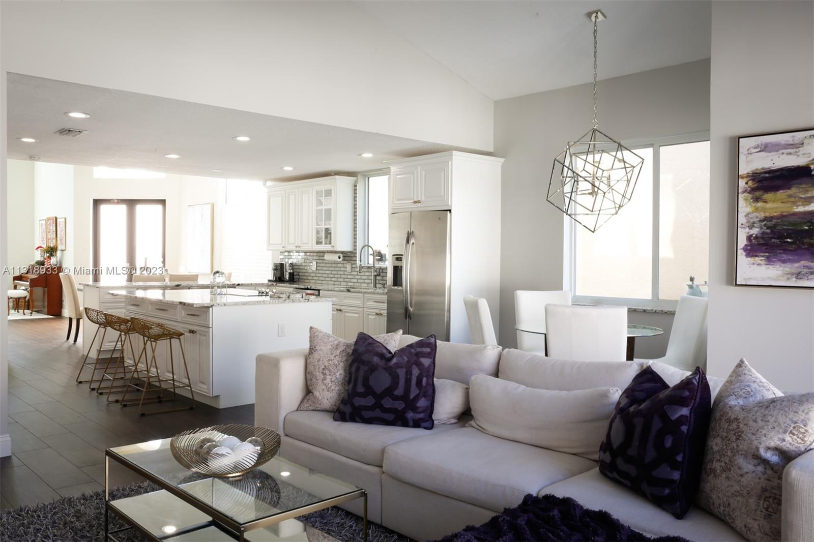 Completely upgraded 4 bed/2.5 bath open floor plan. Porcelain tile/wood throughout. Enormous gourmet kitchen with double ovens and top line appliances. Separate dining room breakfast bar, and dining nook- perfect for entertaining. Main floor large owner's suite with his/hers closets and 16' ceilings! Jetted freestanding tub and marble shower in suite. Vaulted and double story ceilings throughout (22' in the main entry and dining area). Floor to ceiling low E storm impact windows with plenty of natural light. Three more large bedrooms and comfortable loft upstairs. Recently renovated pool, new privacy fence in the backyard. Solar panels & 2 Tesla batteries: don't worry about losing power in a hurricane!