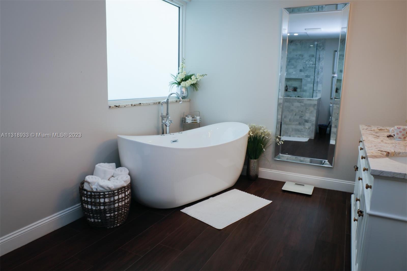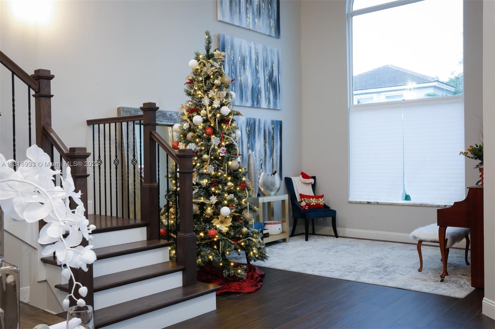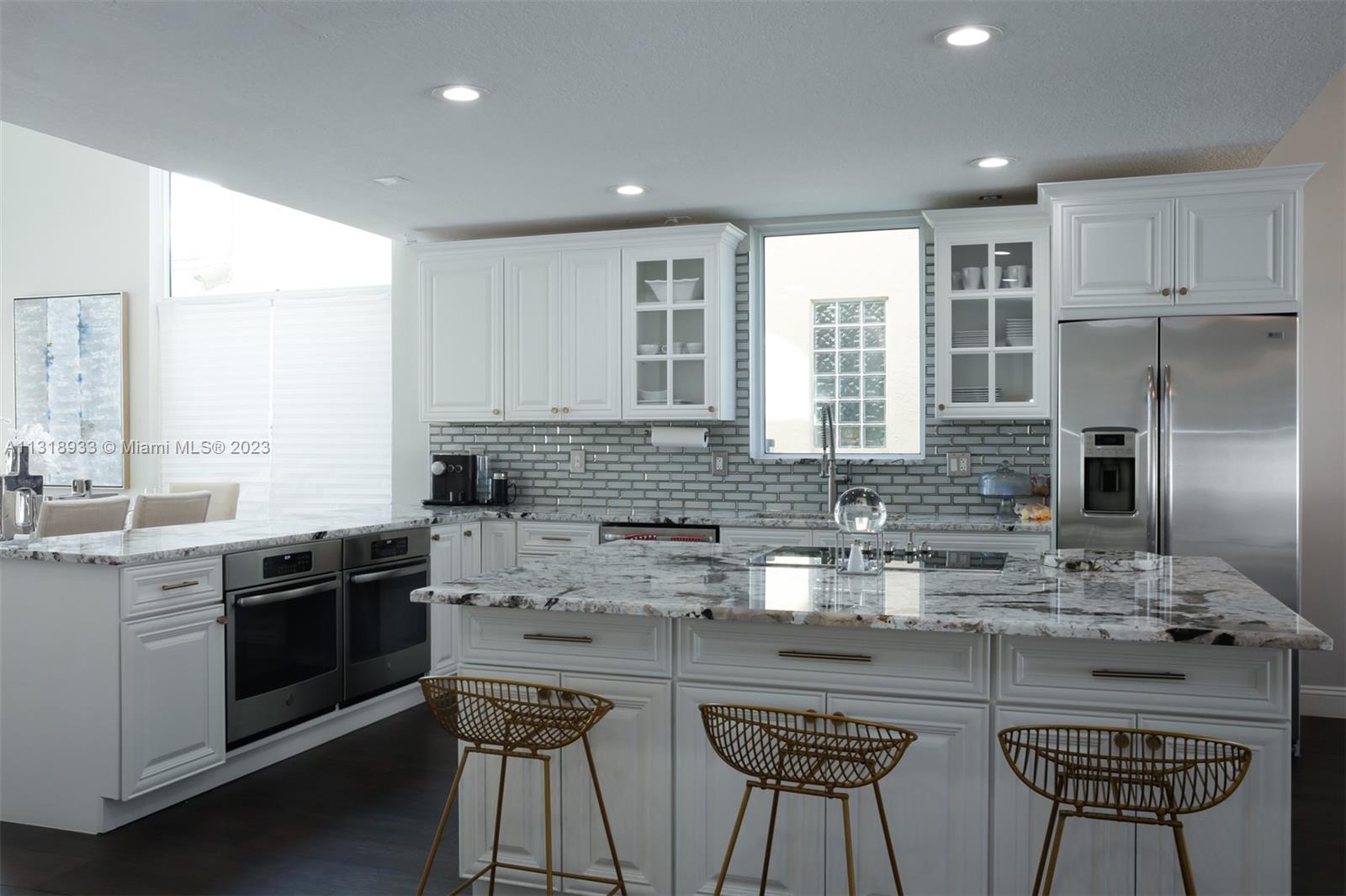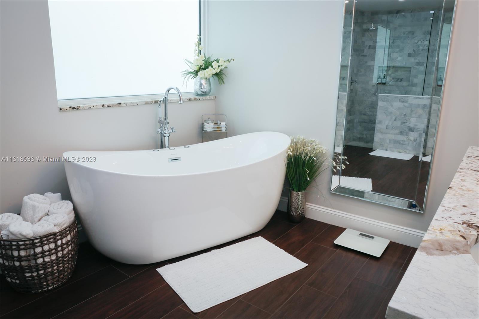 Completely upgraded 4 bed/2.5 bath open floor plan. Porcelain tile/wood throughout. Enormous gourmet kitchen with double ovens and top line appliances. Separate dining room breakfast bar, and dining nook- perfect for entertaining. Main floor large owner's suite with his/hers closets and 16' ceilings! Jetted freestanding tub and marble shower in suite. Vaulted and double story ceilings throughout (22' in the main entry and dining area). Floor to ceiling low E storm impact windows with plenty of natural light. Three more large bedrooms and comfortable loft upstairs. Recently renovated pool, new privacy fence in the backyard. Solar panels & 2 Tesla batteries: don't worry about losing power in a hurricane!