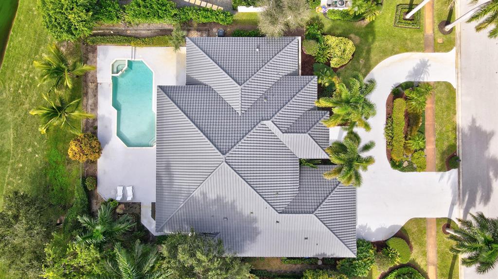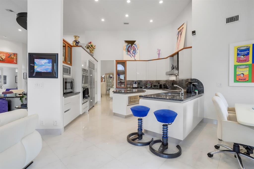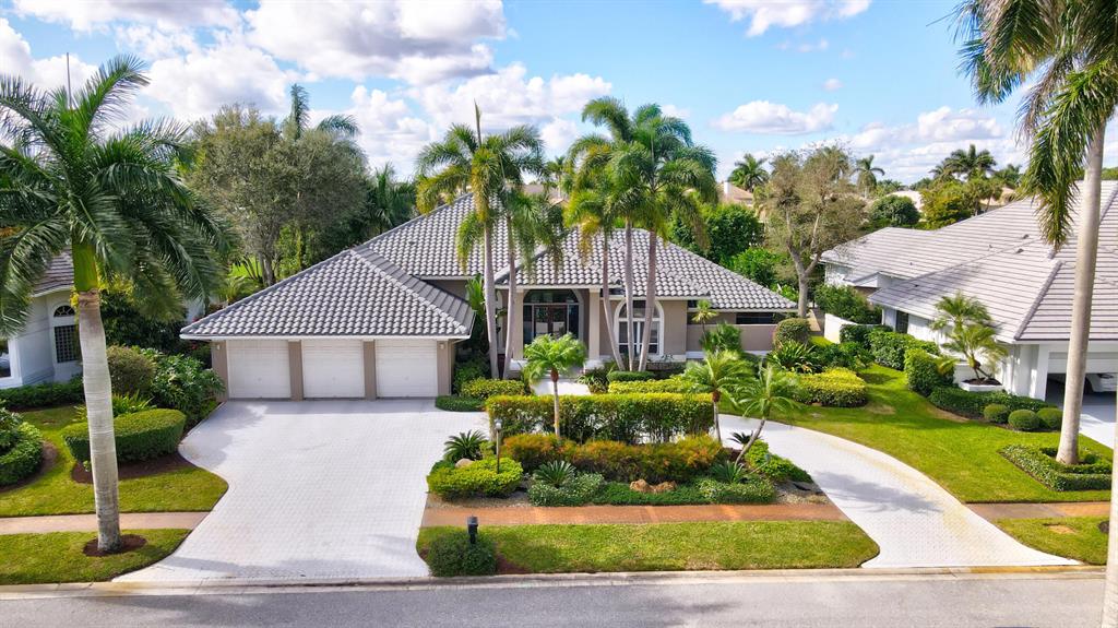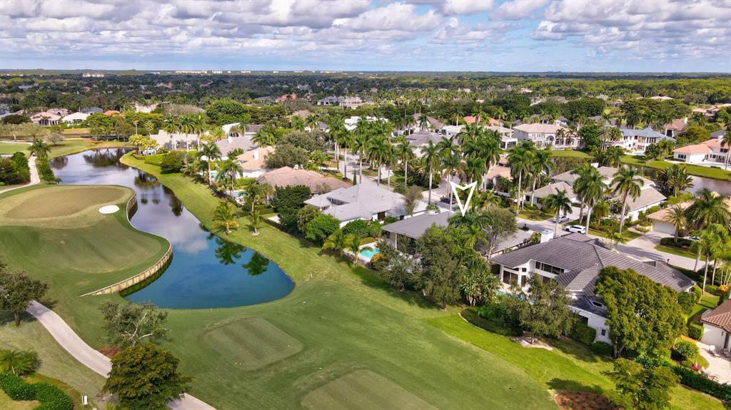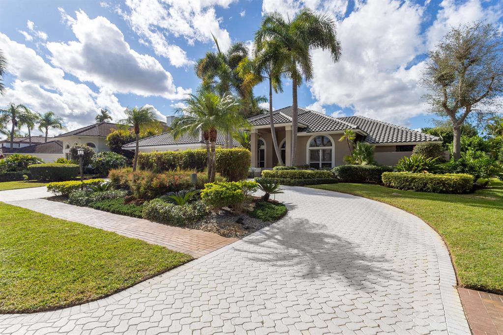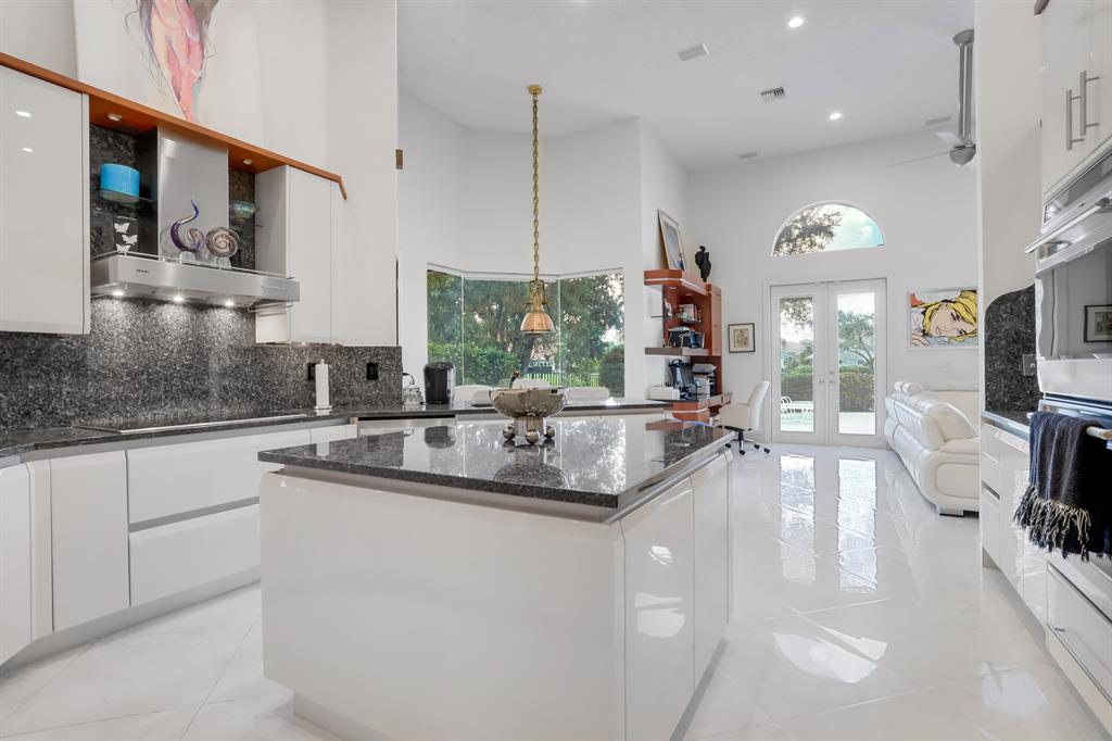 Exceptional transitional contemporary on the Championship west golf course overlooking fairway, lake, golf green and sun-set views. Dramatic central entertaining bar area that serves the living, dining and family areas. Equally open is the Irpina cabinet and granite counter top kitchen and breakfast area which opens to family room with media center. Oversized White porcelain floors go throughout the residence. The primary bedroom suite accesses to the screen closed covered patio as well as to the open pool. An adjacent bedroom features a full bath - currently used as an exercise room (closets have been ordered). Two additional en suite bedrooms are on the secondary wing, one with cabana bath access to the pool patio area. SEE MORE.
