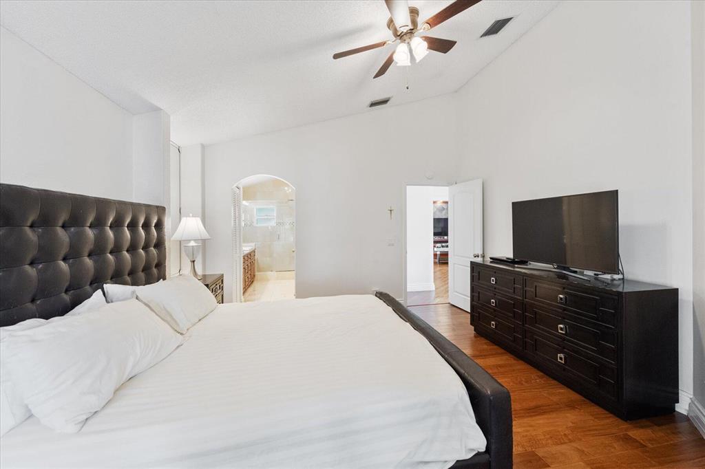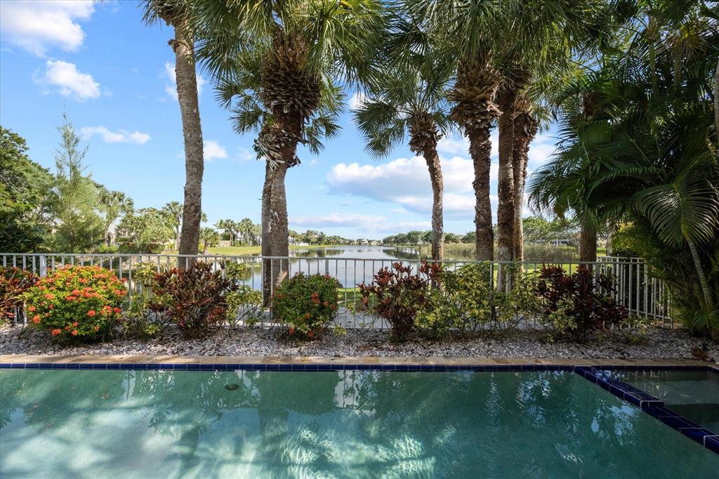Best location with water on 2 sides in The Colony at Breakers West in West Palm Beach! Located on cul-de-sac street with just 12 houses, this lovely 2BR, 2BA home has open Great Room floor plan with vaulted ceilings and fireplace as well as warm engineered wood floors thru out. The open Kitchen has solid wood cabinetry and Kitchenaid stainless steel appl. Spacious Master Suite with vaulted ceilings overlooks with pool and boasts a marble Master bath with 2 sinks, huge walk-in marble shower w/frameless enclosure & custom fitted walk-in closet. Bedroom 2 also has a marble bath and opens to private courtyard patio. Opening from Great Room, Kitchen and Master Bedroom is a beautiful marble stone patio with its own private lap pool surrounded by lush landscaping, long lake views