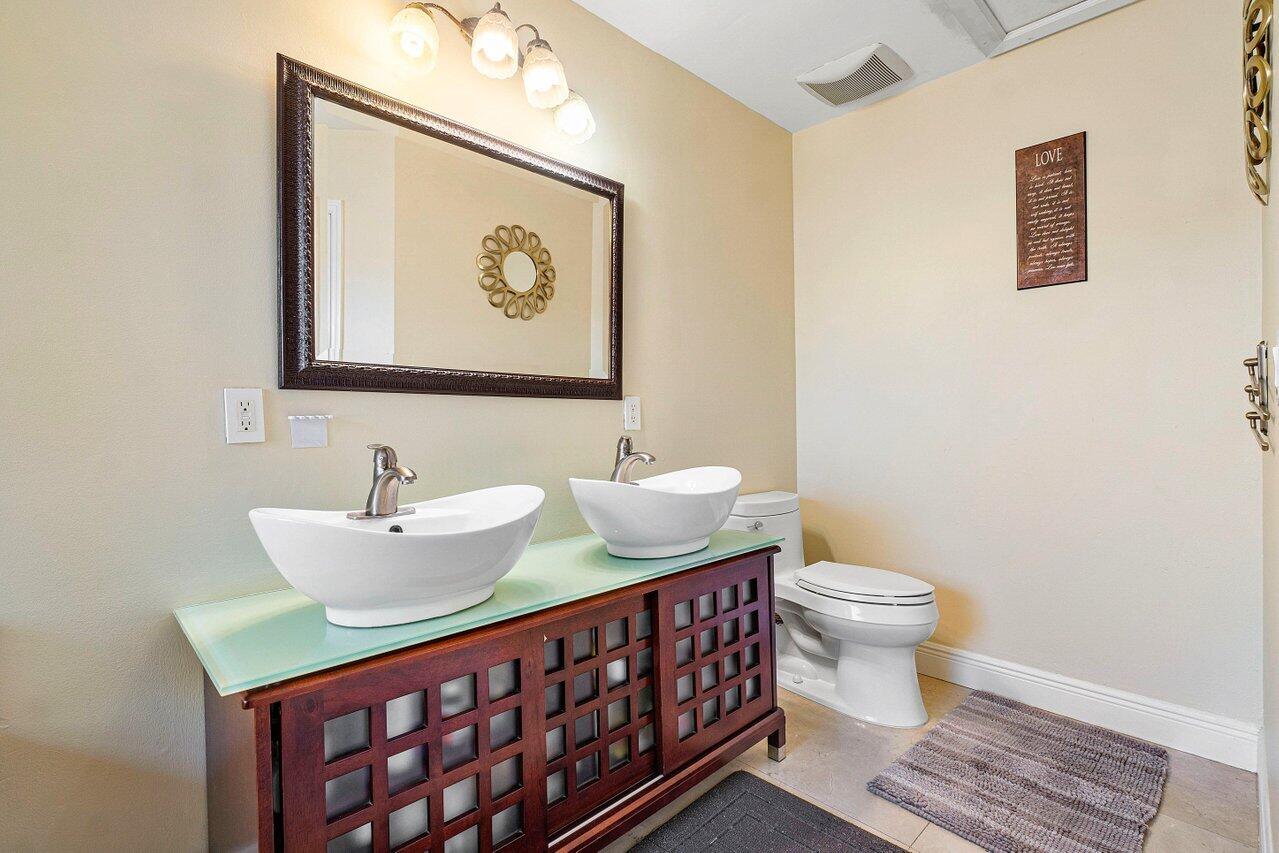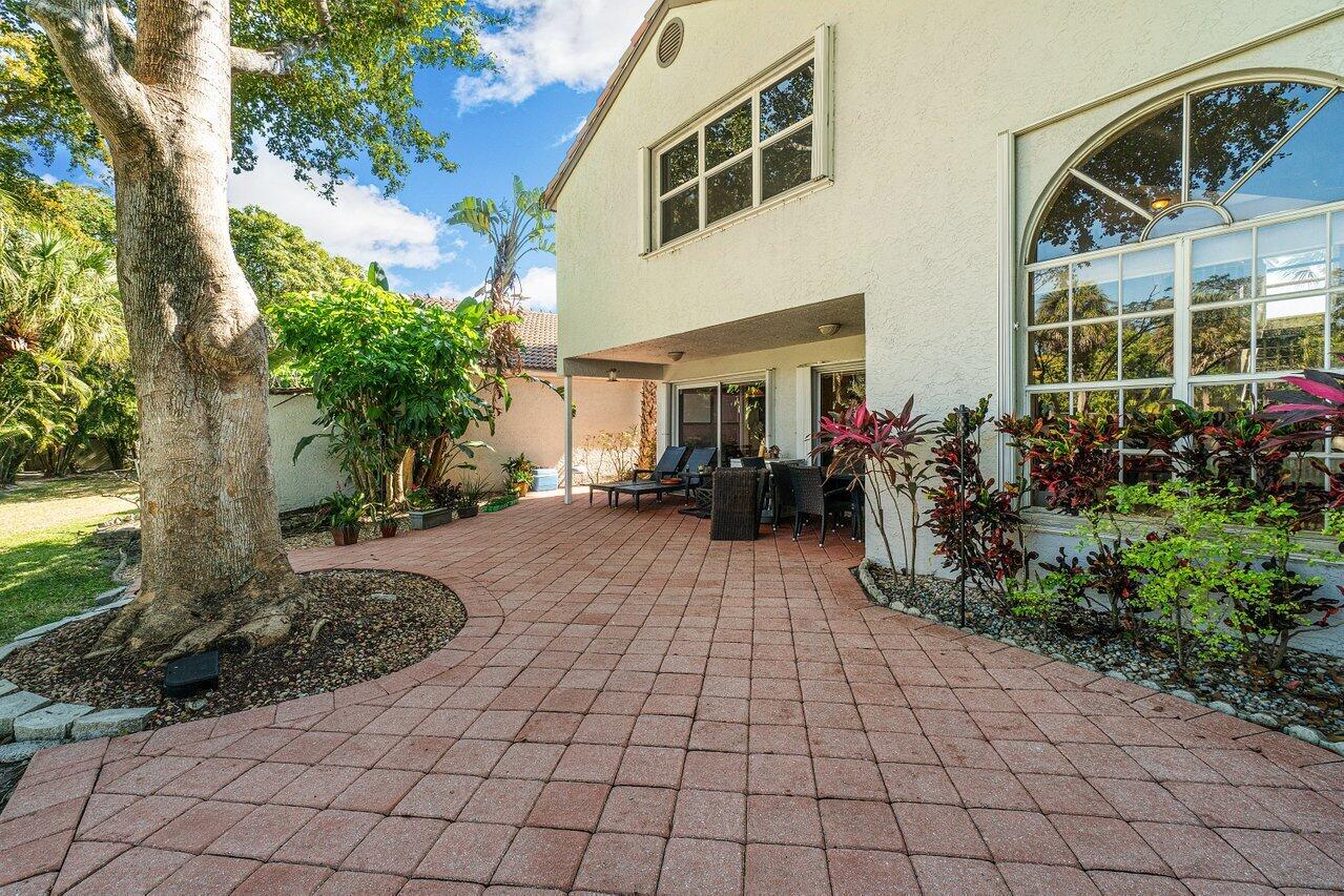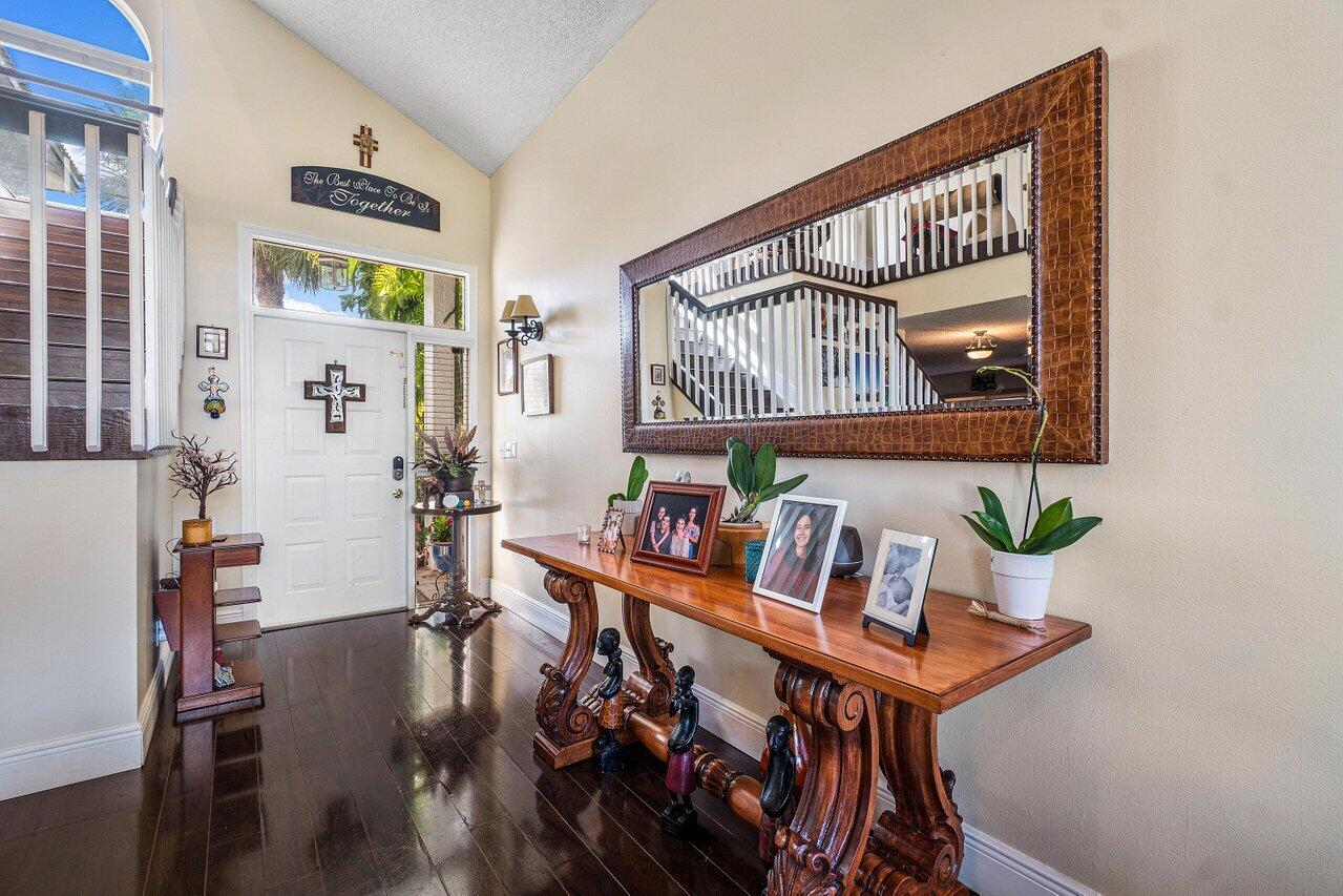 Stunning Home in La Vida Boca Raton. 4 bedrooms and 2.5 bathrooms. You cannot miss seeing this one. When you walk into you cannot help but notice the abundance of natural light, the high vaulted ceilings, and the beautiful flooring throughout (installed in 2015). Open concept living and dining room with a wall of sliding doors out to the covered patio. The kitchen has granite countertops and stainless-steel appliances with natural light coming through many windows. A lovely breakfast nook looks out on the private back yard through sliding glass doors. All of the bedrooms are upstairs and have the same flooring as the first floor. The master bedroom is spacious, and the bathroom is very thoughtfully done with dual sinks, a spa tub, and separate shower. more . . .