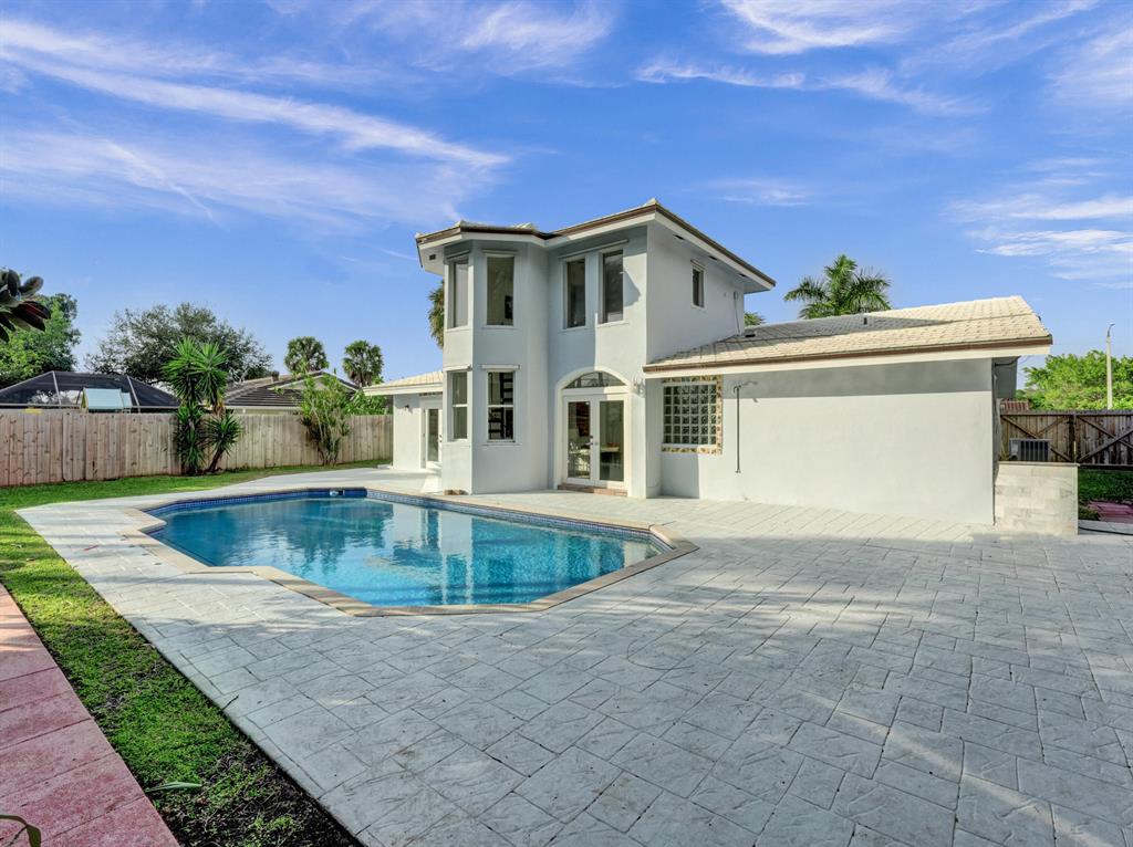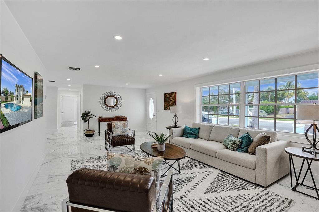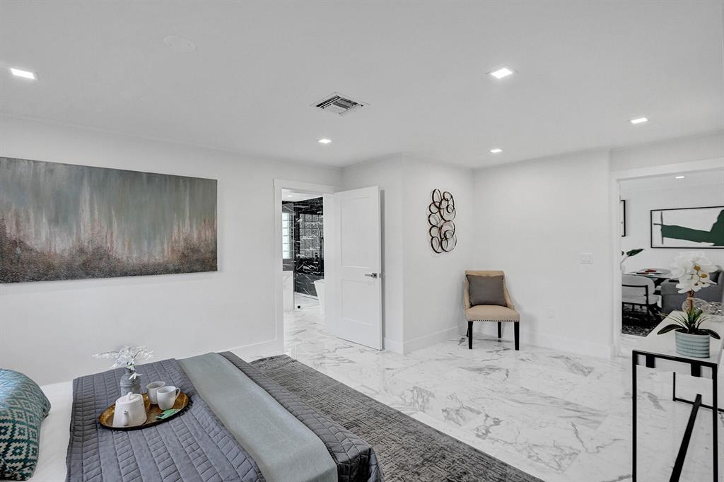 Indulge in this luxurious mid-century modern, yet fully renovated oversized lot pool home in the highly desirable Boca Square in east Boca Raton minutes to Mizner Park and the beach. Rare stones and marble create visual appeal! This bright and airy 3 bedroom and 2 bath split floor plan home plus 2 bonus rooms is a rare opportunity with white marble floors throughout and a chef's delight kitchen with French doors makes entertaining by the pool a breeze. The opulent kitchen includes a large waterfall island with Calcatta marble countertops, full Onyx backsplash, white shaker cabinets, new stainless steel appliances including a double oven, refrigerator, dishwasher and large sink.